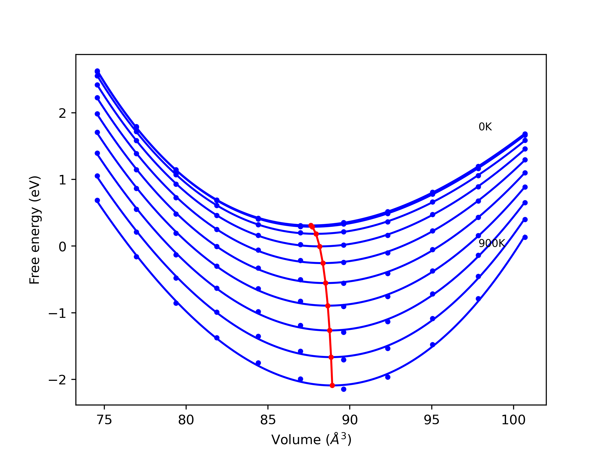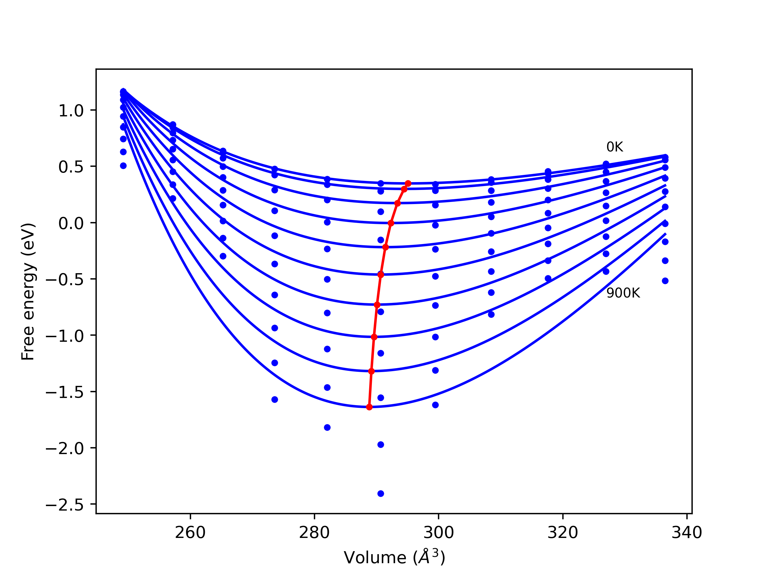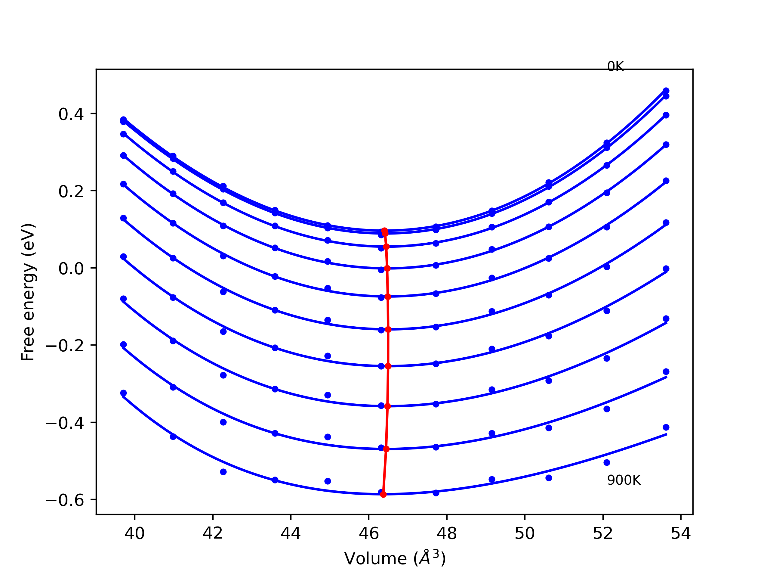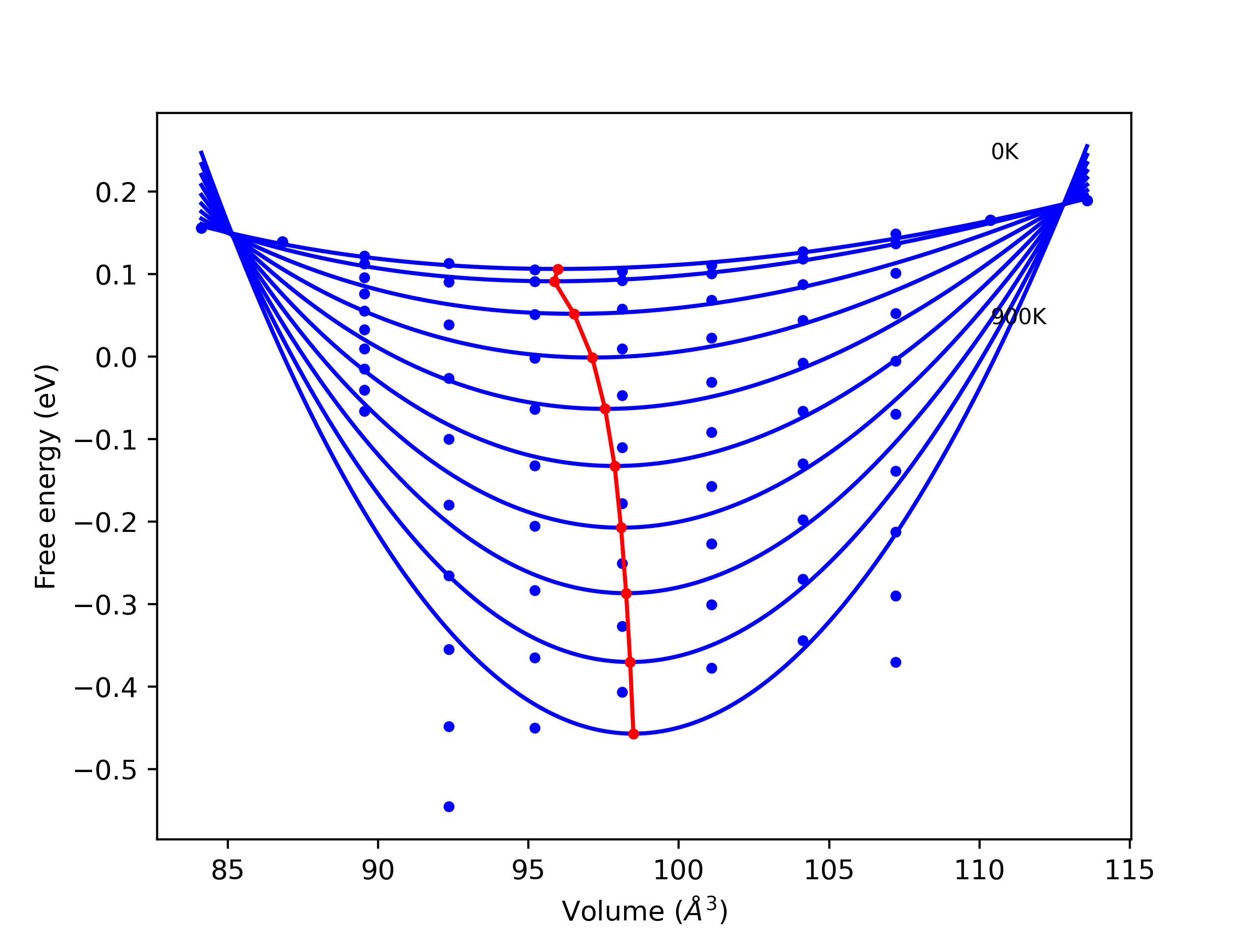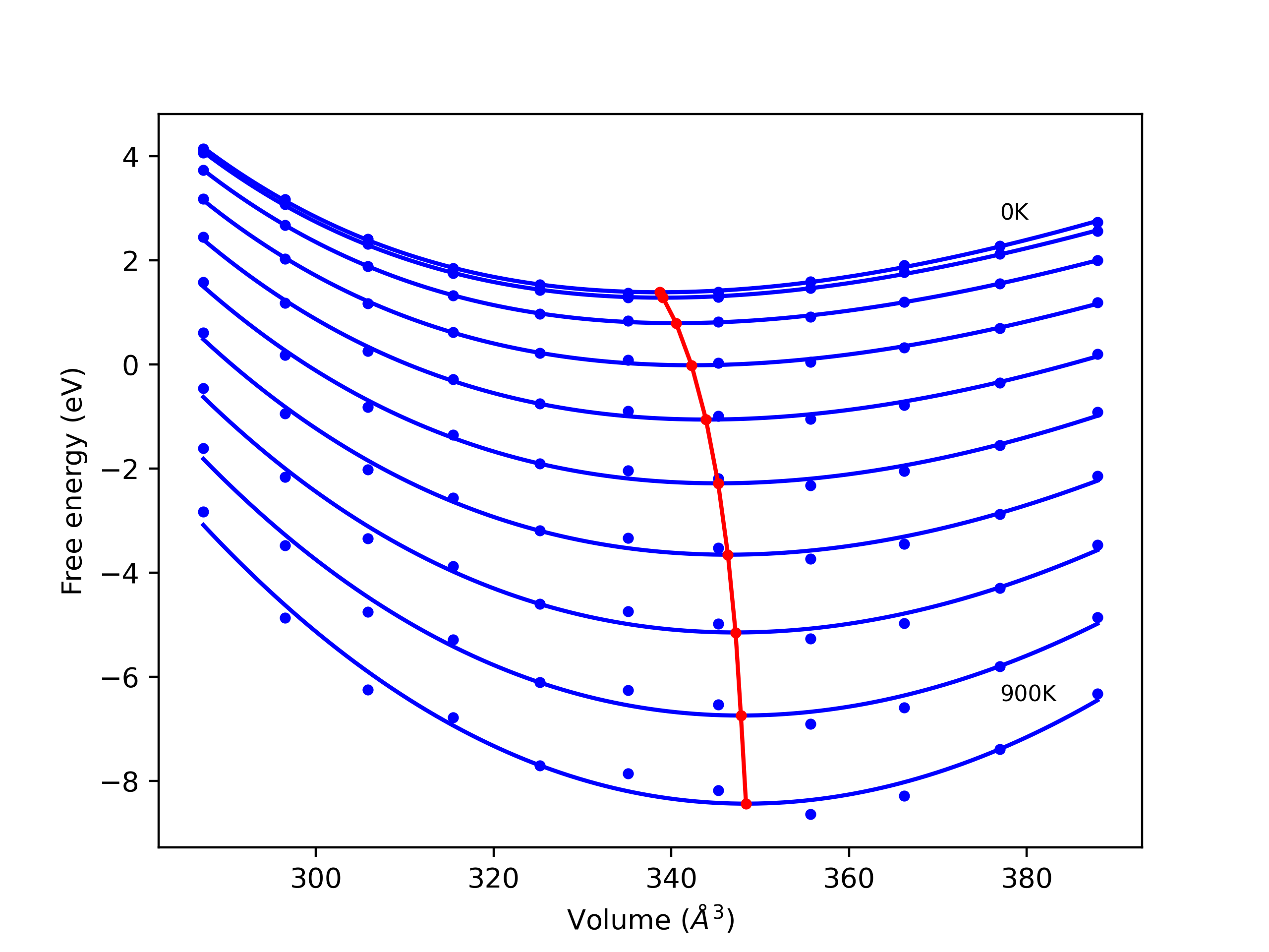 Plots of lattice and elastic constants are shown as a function of temperature. The 0K points were taken from the Crystal Structure Predictions and the Elastic Constants Predictions sections above for the unique crystal structures relaxed with the "dynamic" method. Starting from the 0 K relaxed crystal unit cells, supercell systems are created by replicating all three dimensions by the same multiplier to achieve at least 4000 atoms. The systems are then relaxed at 50 K and zero pressure using 1 million NPT steps. Lattice constants are estimated by averaging the measured box dimensions. Temperatures are iteratively increased by 50 K, with each subsequent relaxation calculation starting from the final atomic configuration at the previous temperature and relaxing for another 1 million steps.