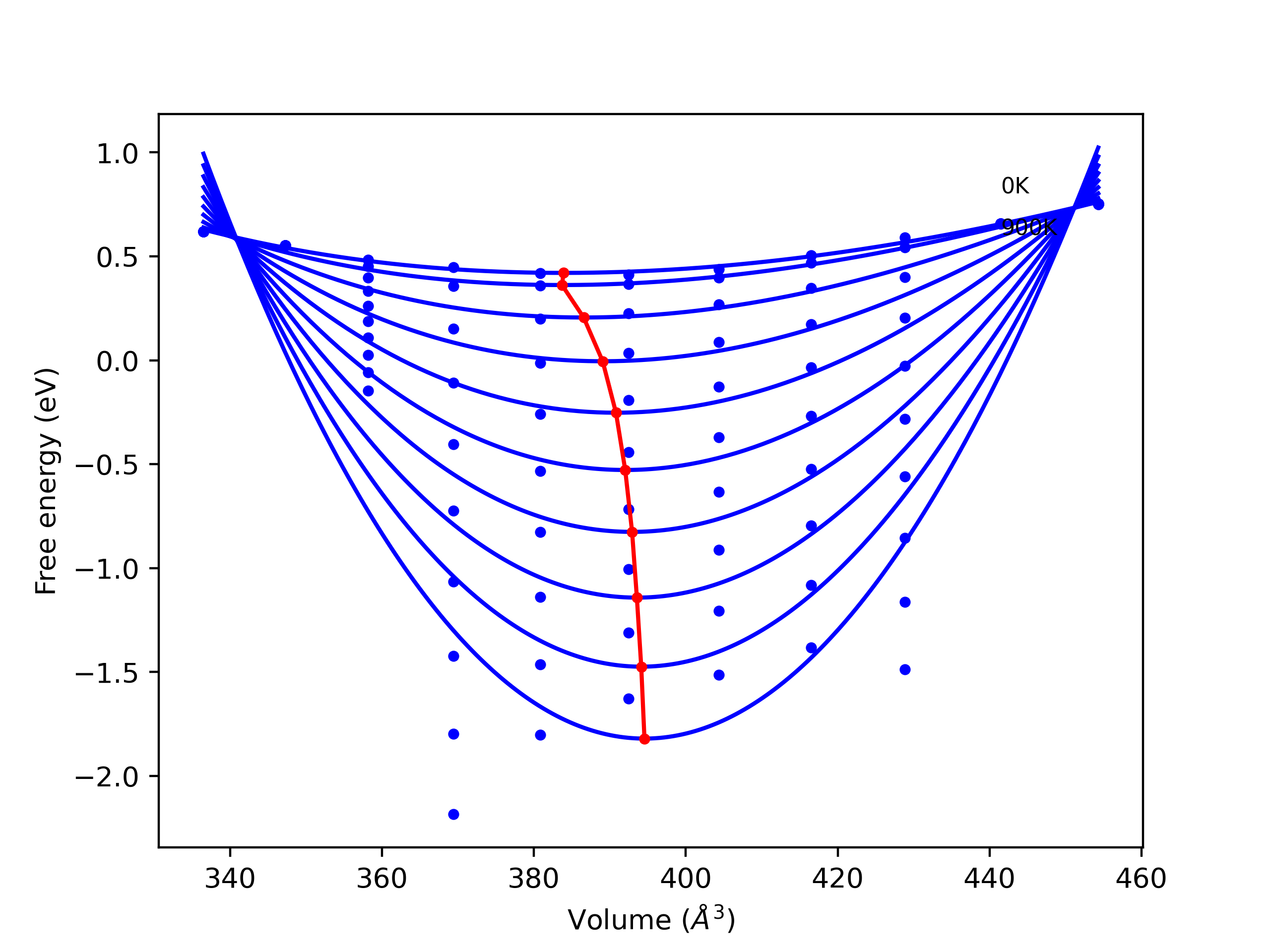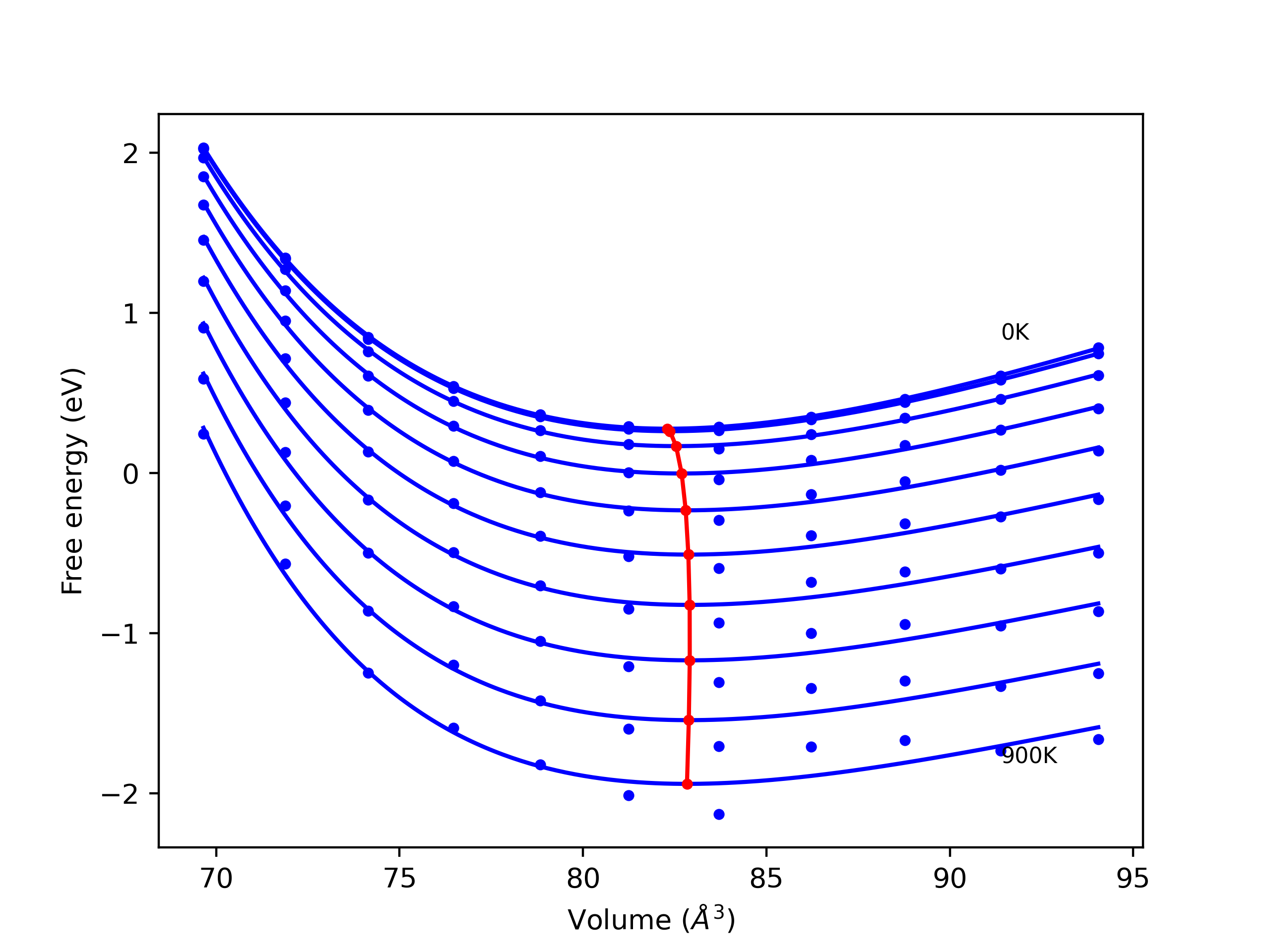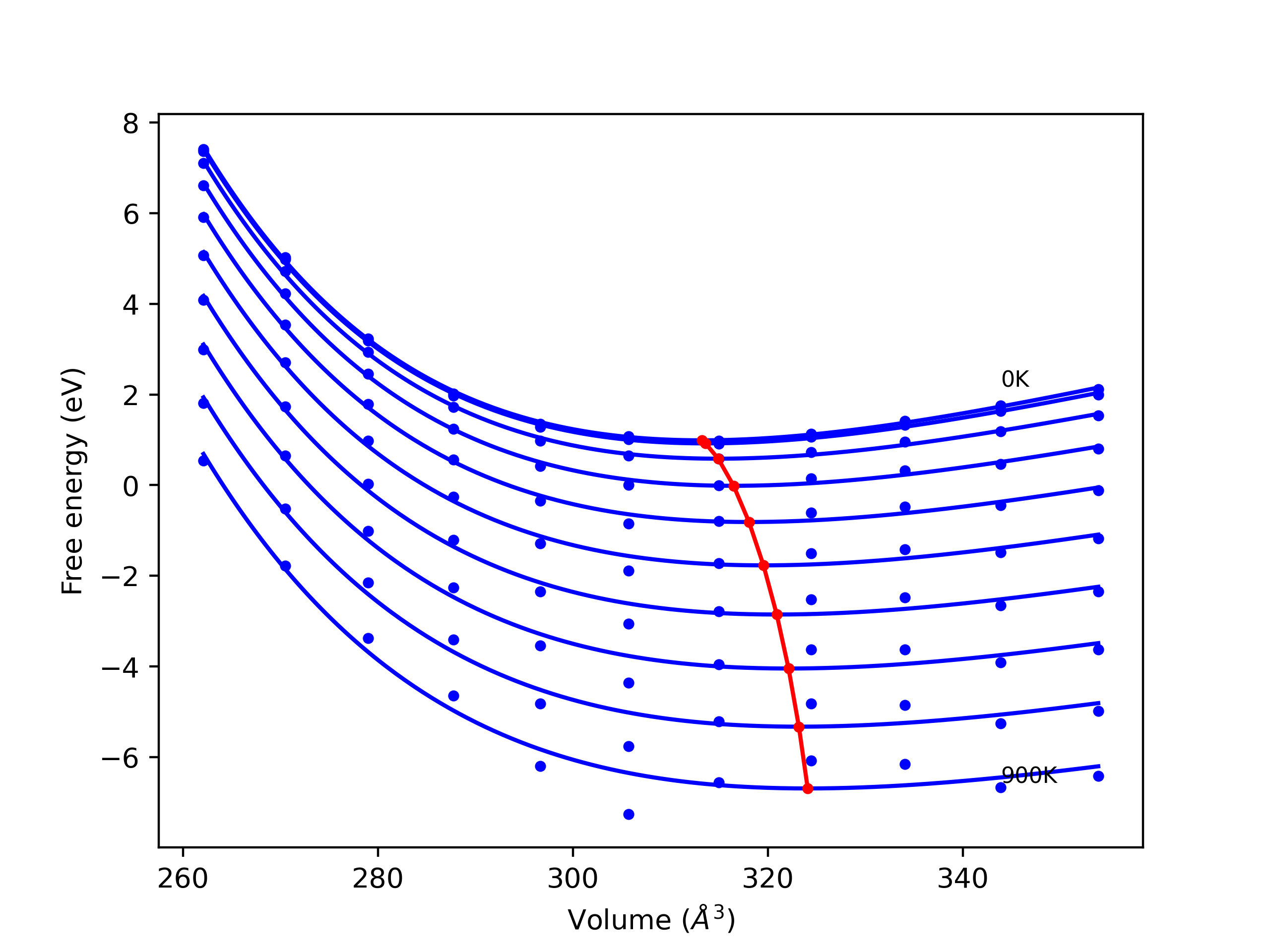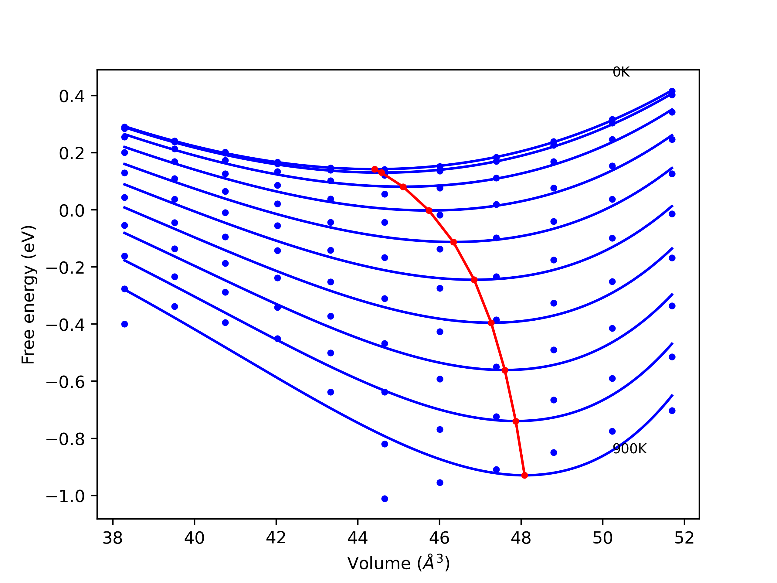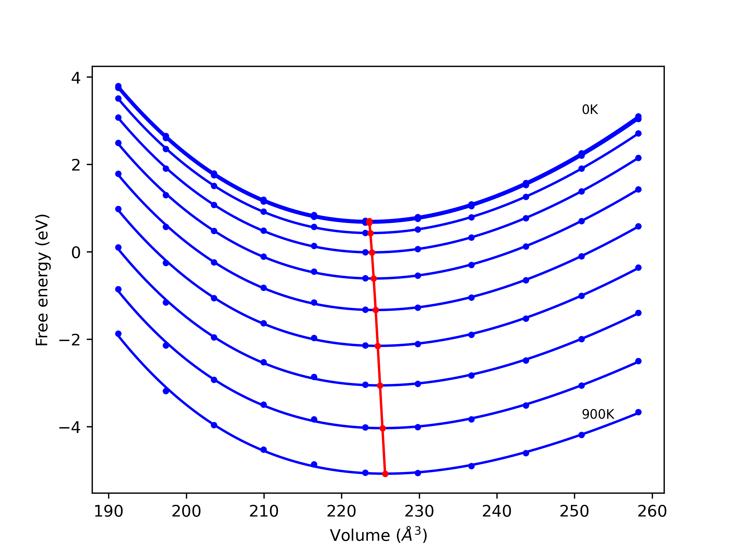Plots of lattice and elastic constants are shown as a function of temperature. The 0K points were taken from the Crystal Structure Predictions and the Elastic Constants Predictions sections above for the unique crystal structures relaxed with the "dynamic" method. Starting from the 0 K relaxed crystal unit cells, supercell systems are created by replicating all three dimensions by the same multiplier to achieve at least 4000 atoms. The systems are then relaxed at 50 K and zero pressure using 1 million NPT steps. Lattice constants are estimated by averaging the measured box dimensions. Temperatures are iteratively increased by 50 K, with each subsequent relaxation calculation starting from the final atomic configuration at the previous temperature and relaxing for another 1 million steps.