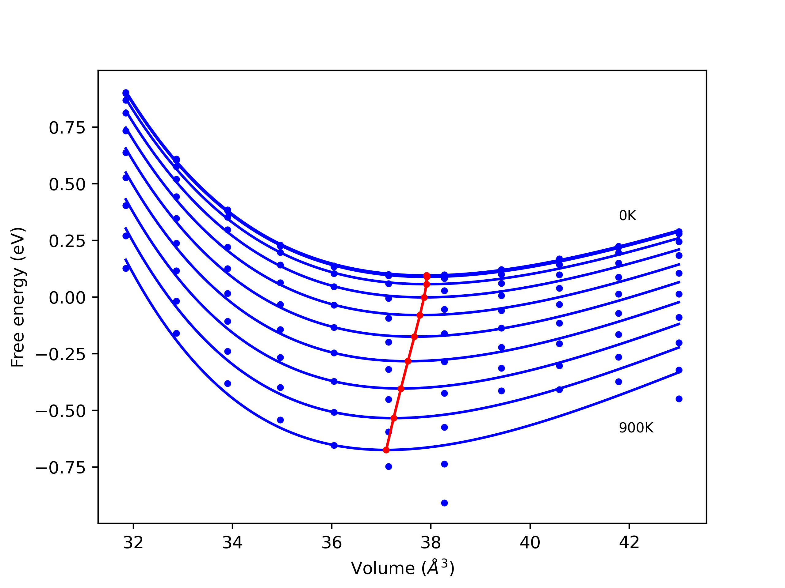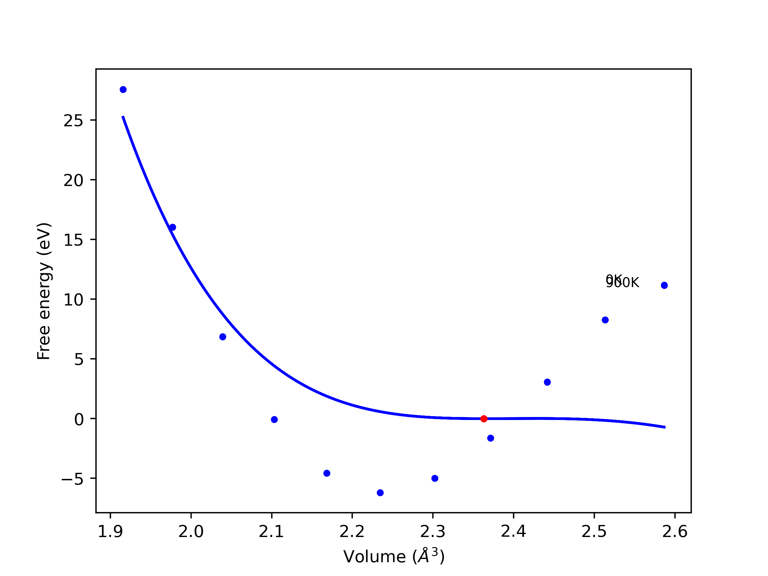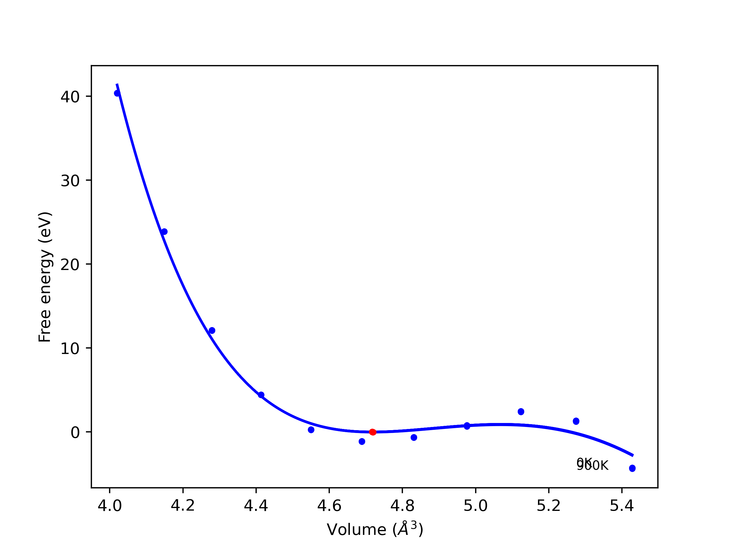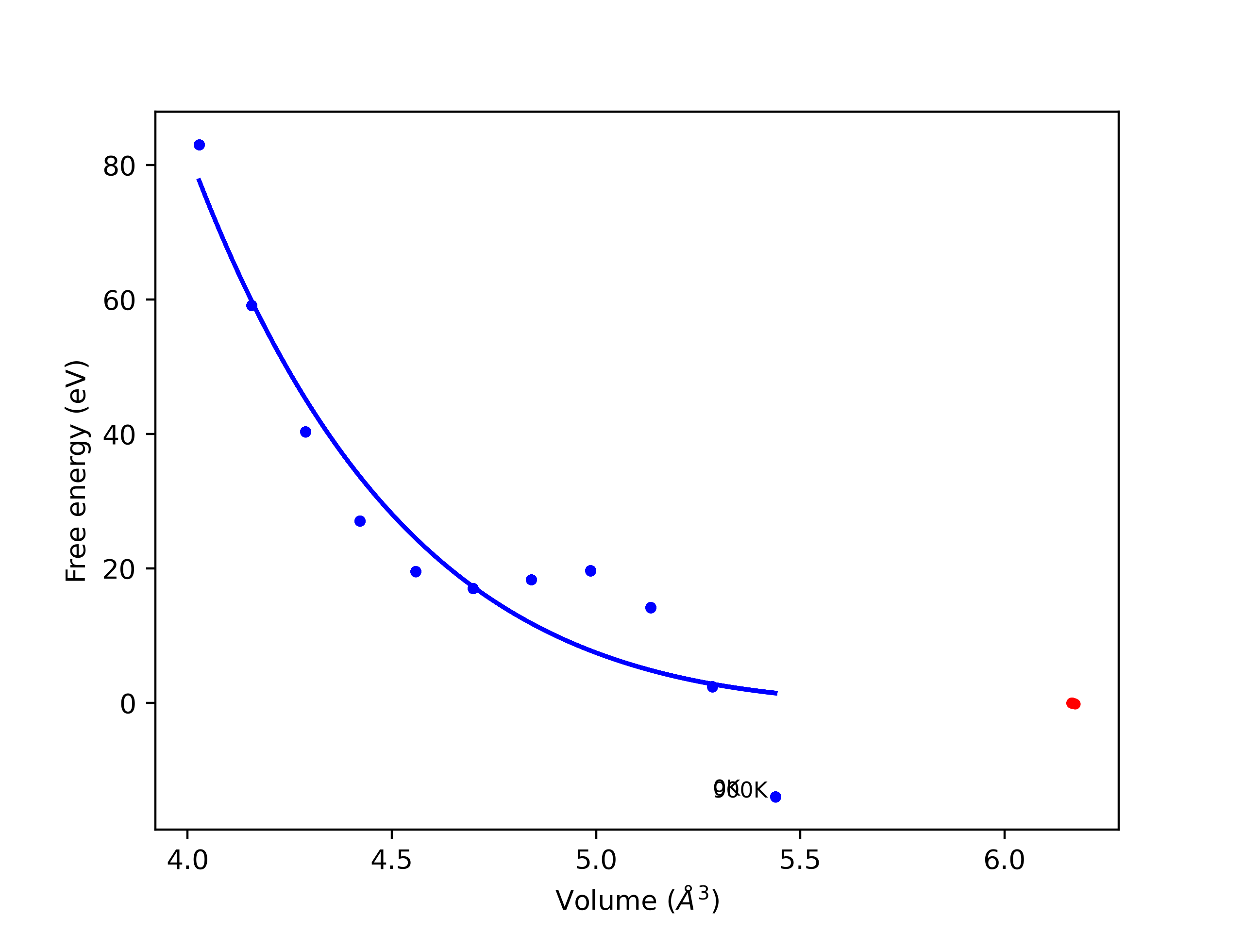 The Gibbs energies of the phases are estimated using thermodynamic integration between the interatomic potential in question and a simpler model with known Gibbs free energy values. For solids, the reference model is an Einstein solid, while for liquids it is the Uhlenbeck-Ford potential. Besides a short run at the start of the solid calculations to estimate Einstein model spring constants, the two calculations proceed similarly. Starting with the final relaxation configurations, the systems are stabilized for 25,000 steps. Then, over the next 50,000 steps the potential is swapped out for the reference potential. The system is then stabilized for another 25,000 steps with the reference model before a reverse swap of 50,000 steps is performed. The simulation ends with one final 25,000 step stabilization period. From the simulation, the irreversible work of transformation is estimated and used to compute the absolute Gibbs free energy of the target phase and potential relative to the reference potential. Entropy is estimated as the difference in enthalpy and Gibbs free energy and divided by temperature.