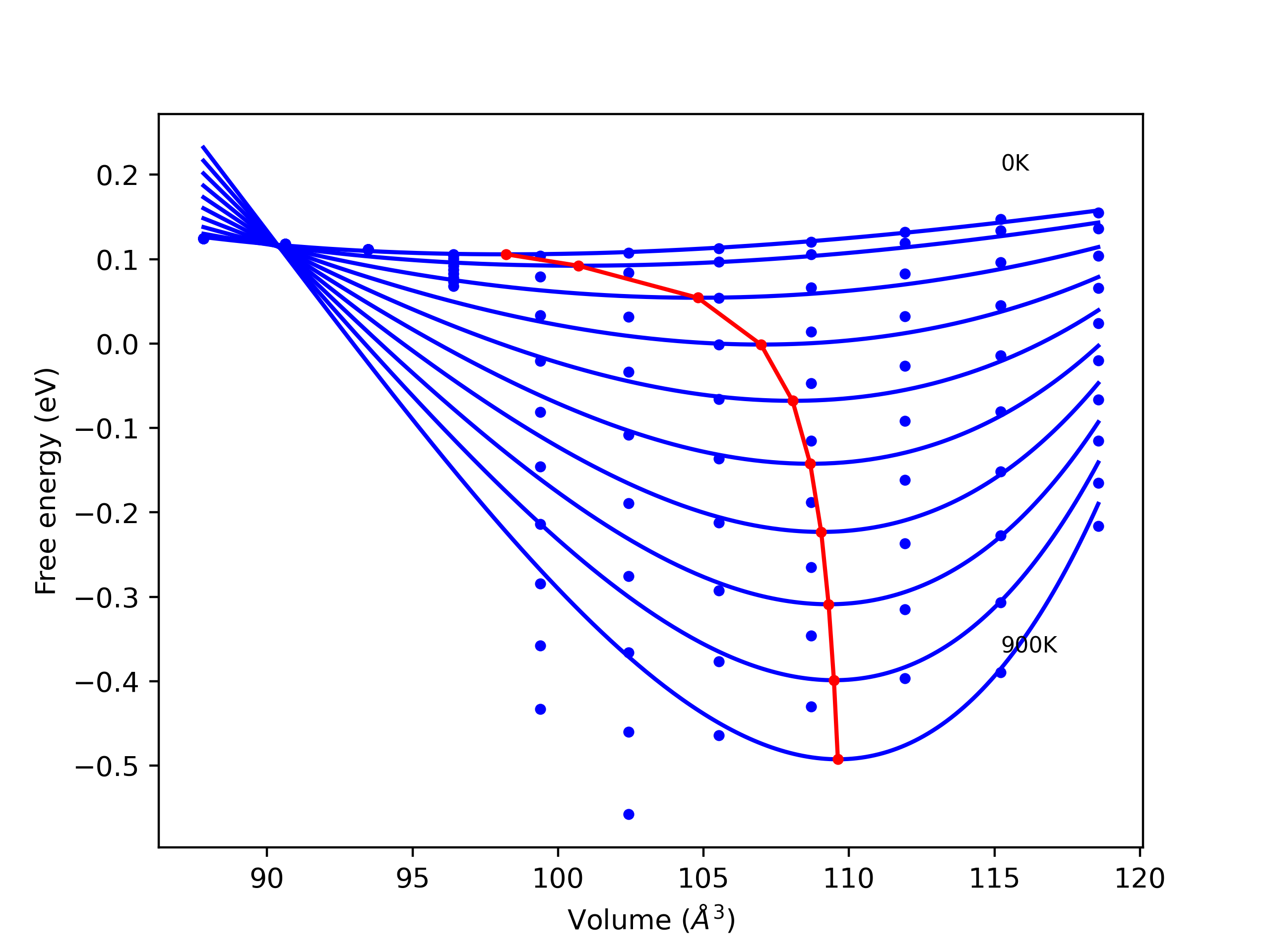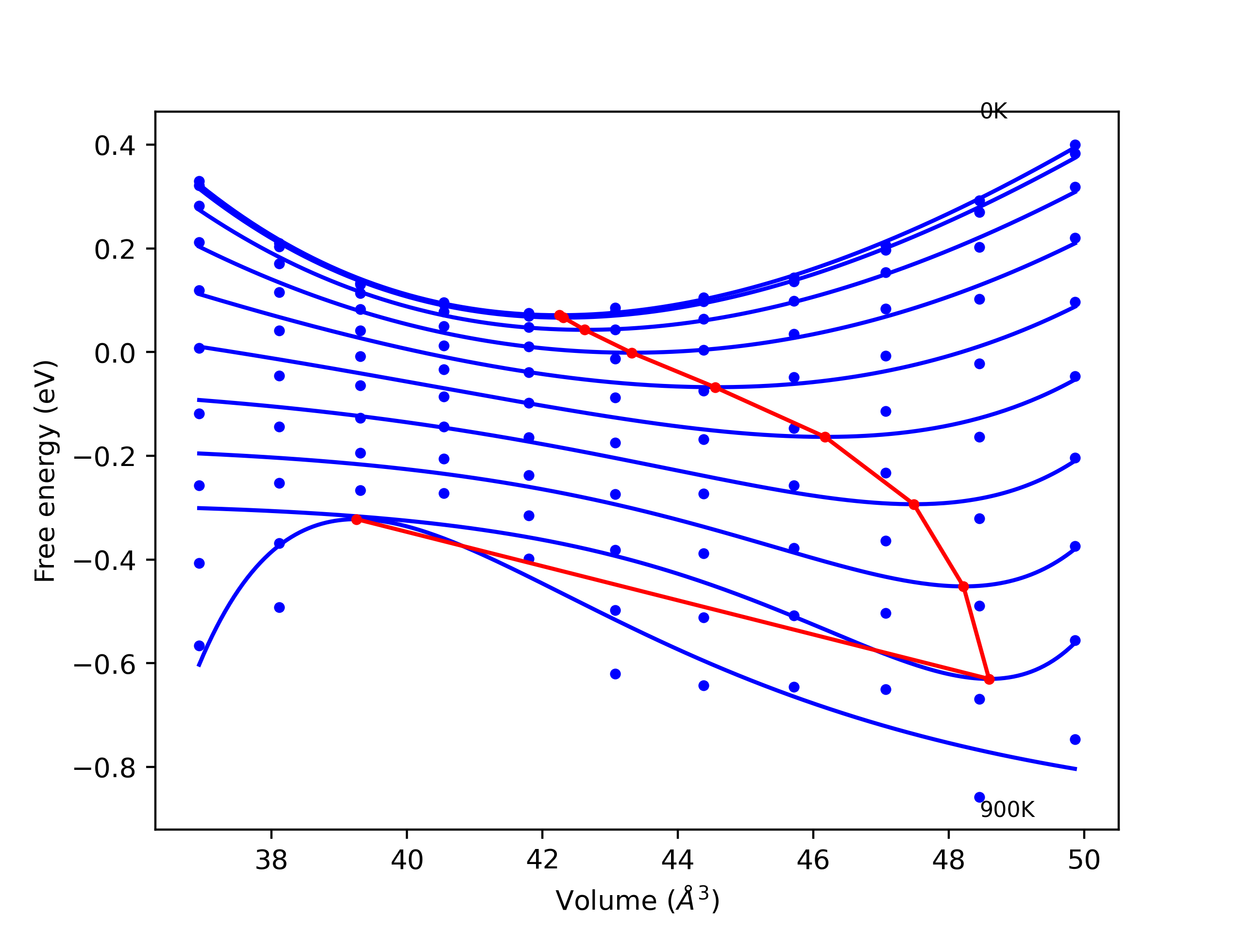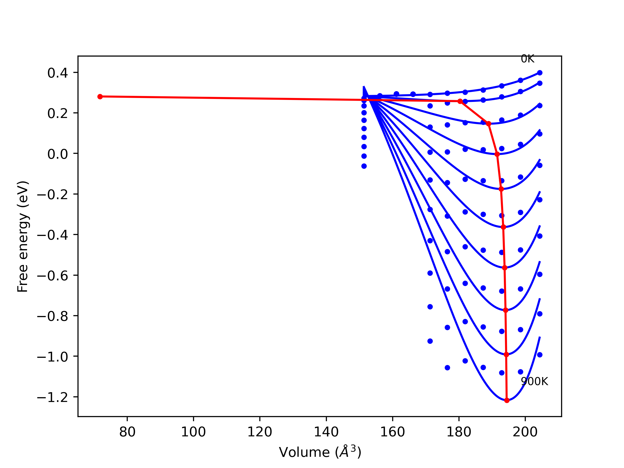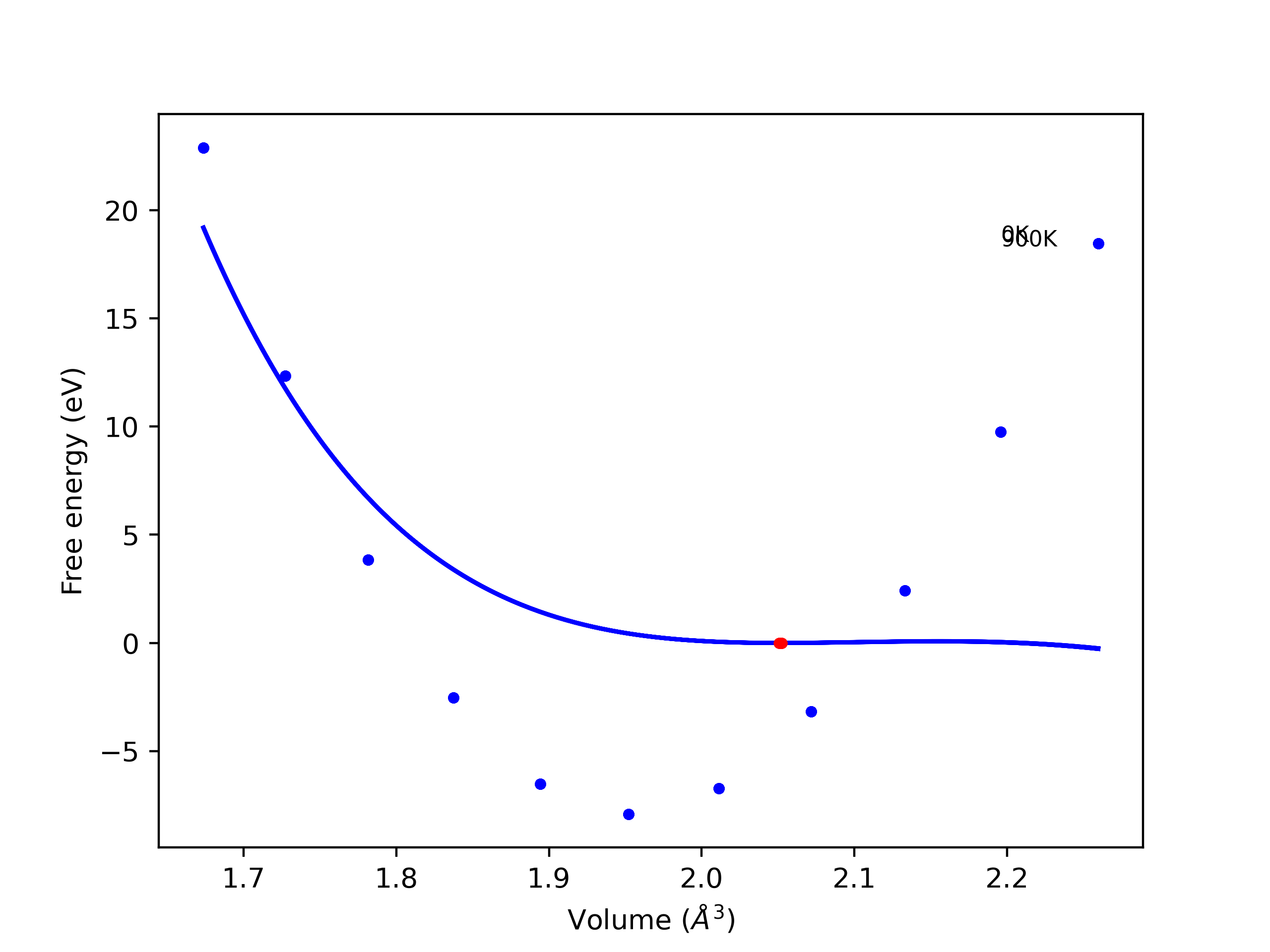 The Gibbs energies of the phases are estimated using thermodynamic integration between the interatomic potential in question and a simpler model with known Gibbs free energy values. For solids, the reference model is an Einstein solid, while for liquids it is the Uhlenbeck-Ford potential. Besides a short run at the start of the solid calculations to estimate Einstein model spring constants, the two calculations proceed similarly. Starting with the final relaxation configurations, the systems are stabilized for 25,000 steps. Then, over the next 50,000 steps the potential is swapped out for the reference potential. The system is then stabilized for another 25,000 steps with the reference model before a reverse swap of 50,000 steps is performed. The simulation ends with one final 25,000 step stabilization period. From the simulation, the irreversible work of transformation is estimated and used to compute the absolute Gibbs free energy of the target phase and potential relative to the reference potential. Entropy is estimated as the difference in enthalpy and Gibbs free energy and divided by temperature.