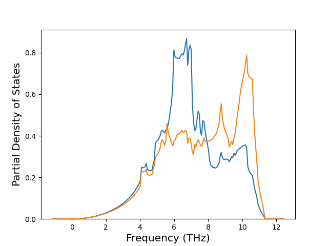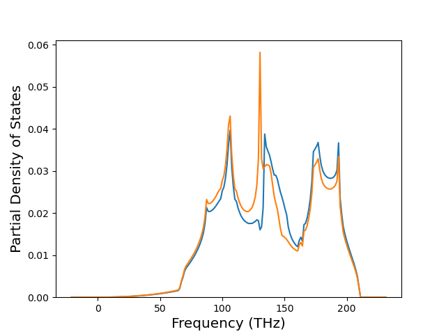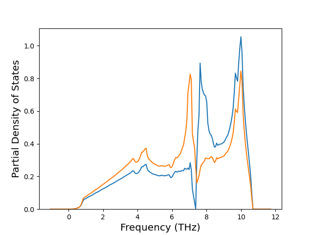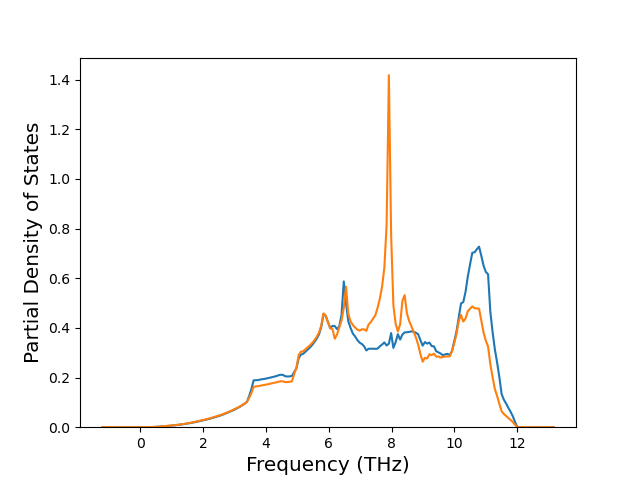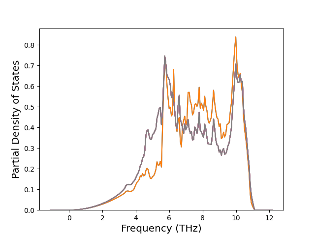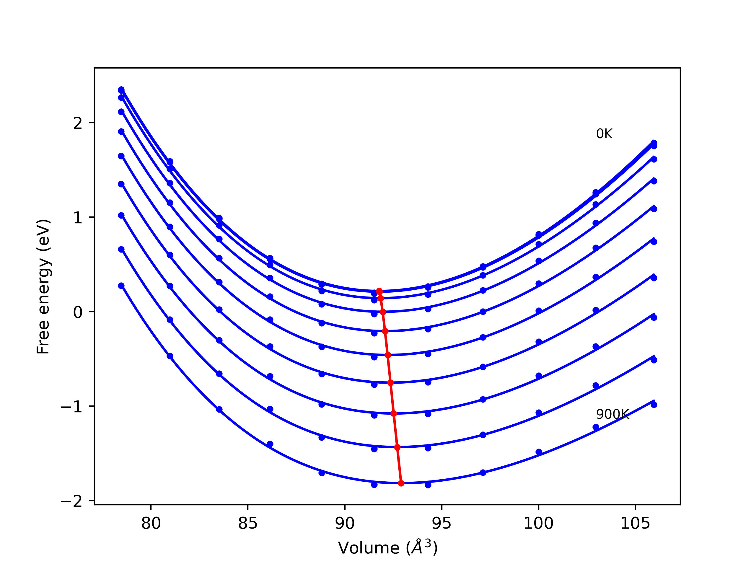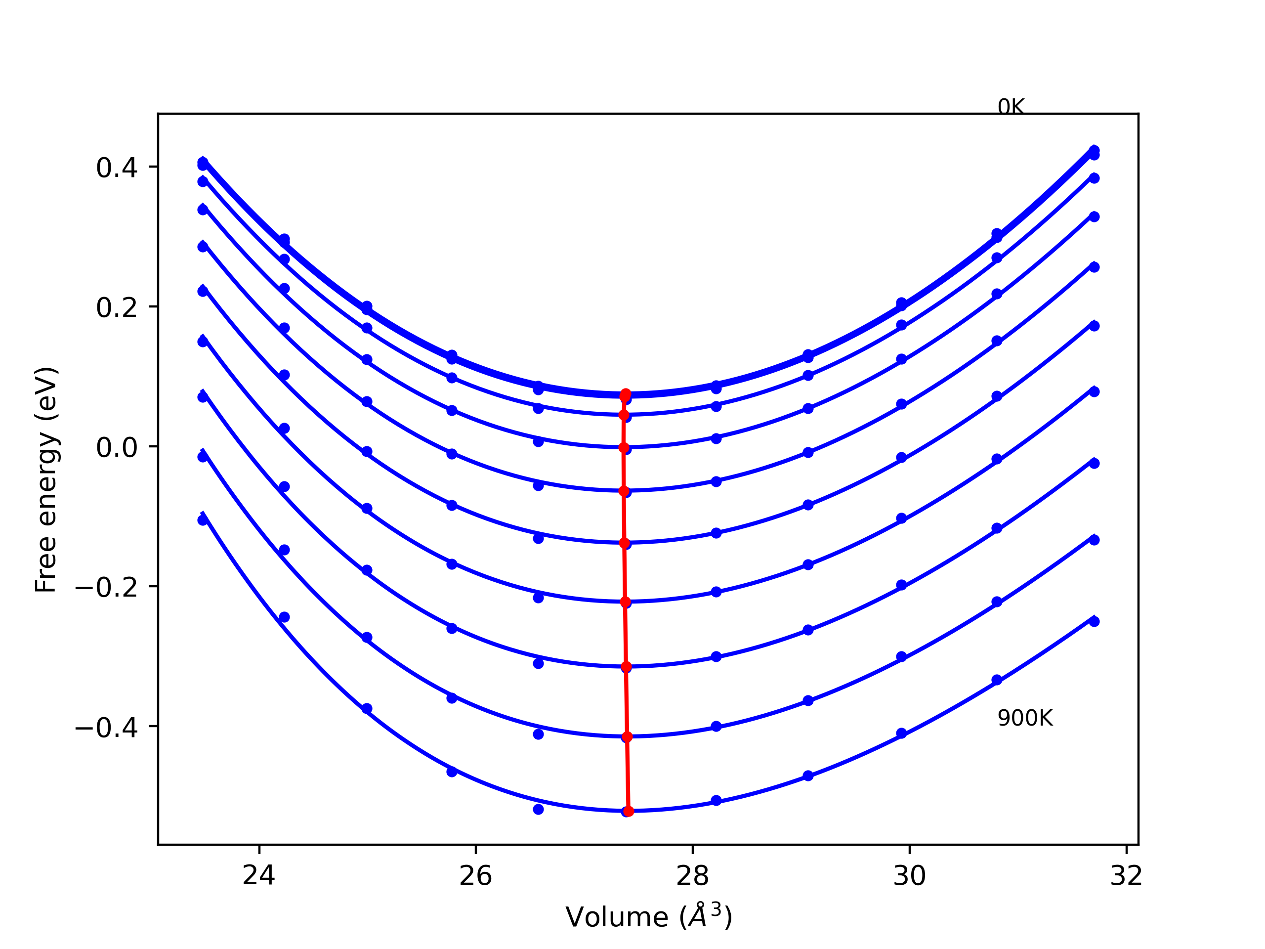 The Gibbs energies of the phases are estimated using thermodynamic integration between the interatomic potential in question and a simpler model with known Gibbs free energy values. For solids, the reference model is an Einstein solid, while for liquids it is the Uhlenbeck-Ford potential. Besides a short run at the start of the solid calculations to estimate Einstein model spring constants, the two calculations proceed similarly. Starting with the final relaxation configurations, the systems are stabilized for 25,000 steps. Then, over the next 50,000 steps the potential is swapped out for the reference potential. The system is then stabilized for another 25,000 steps with the reference model before a reverse swap of 50,000 steps is performed. The simulation ends with one final 25,000 step stabilization period. From the simulation, the irreversible work of transformation is estimated and used to compute the absolute Gibbs free energy of the target phase and potential relative to the reference potential. Entropy is estimated as the difference in enthalpy and Gibbs free energy and divided by temperature.