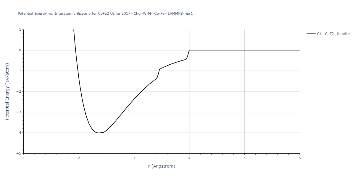Plots of potential energy vs interatomic spacing, r, are shown below for a number of crystal structures. The structures are generated based on the ideal atomic positions and b/a and c/a lattice parameter ratios for a given crystal prototype. The size of the system is then uniformly scaled, and the energy calculated without relaxing the system. To obtain these plots, values of r are evaluated every 0.02 Å up to 6 Å.