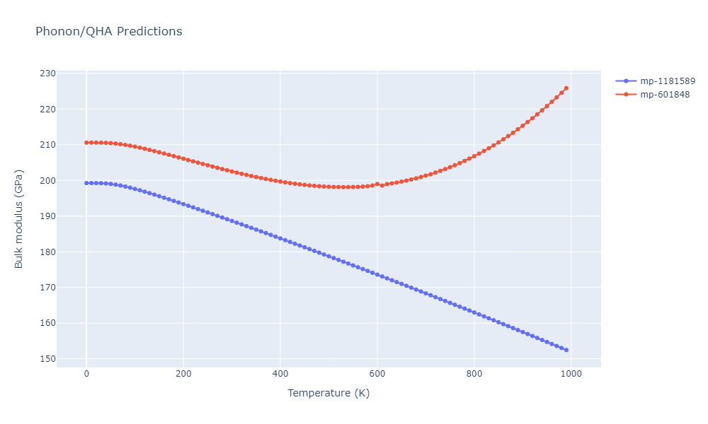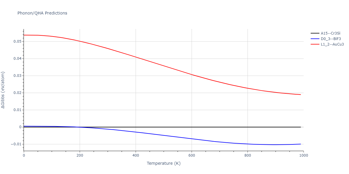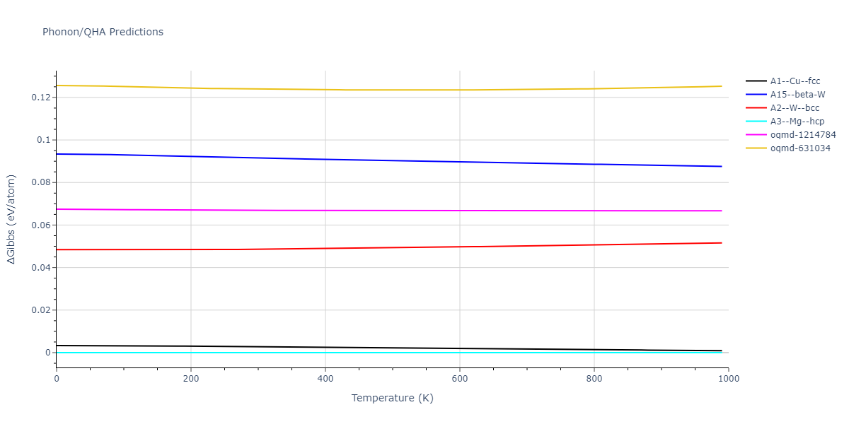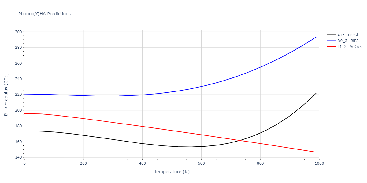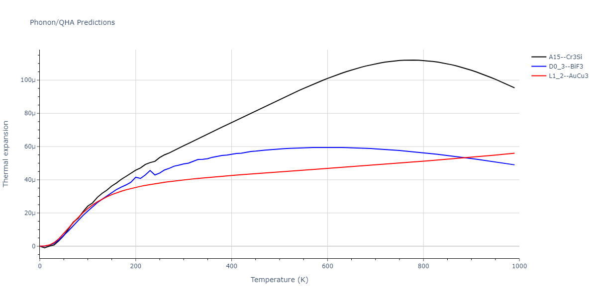 Phonon band structures and crystal properties estimated from quasi-harmonic approximation (QHA) calculations are displayed for select crystals. The calculations were performed using phonopy and LAMMPS. For the phonon calculations, 3x3 supercells of the potential-specific relaxed crystals were used. The QHA calculations were based on 11 strain states ranging from -0.05 to 0.05.