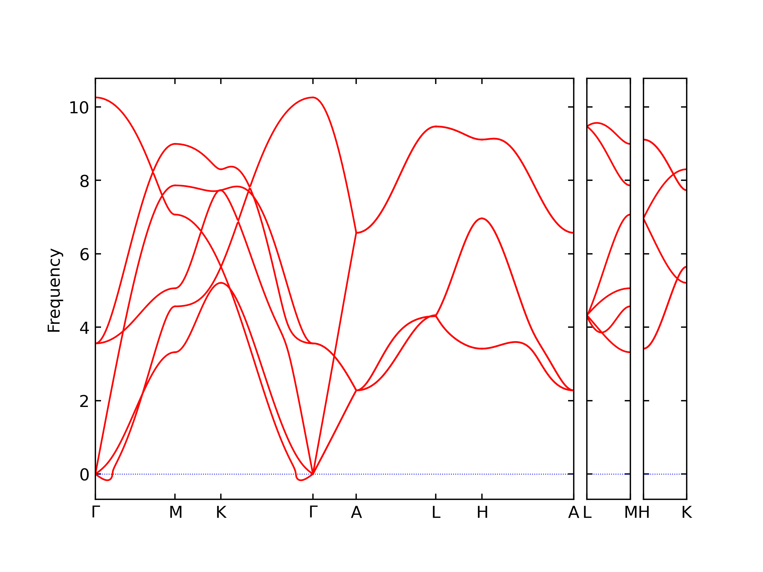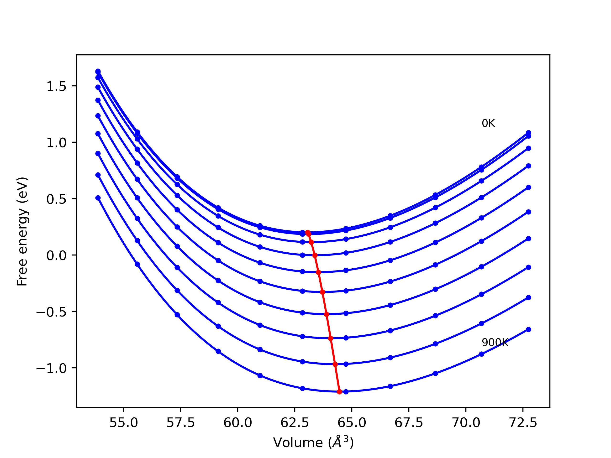 Phonon band structures and crystal properties estimated from quasi-harmonic approximation (QHA) calculations are displayed for select crystals. The calculations were performed using phonopy and LAMMPS. For the phonon calculations, 3x3 supercells of the potential-specific relaxed crystals were used. The QHA calculations were based on 11 strain states ranging from -0.05 to 0.05.