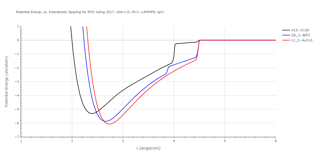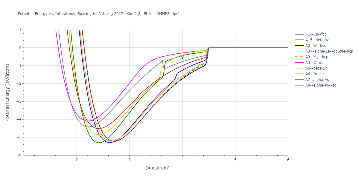 Plots of potential energy vs interatomic spacing, r, are shown below for a number of crystal structures. The structures are generated based on the ideal atomic positions and b/a and c/a lattice parameter ratios for a given crystal prototype. The size of the system is then uniformly scaled, and the energy calculated without relaxing the system. To obtain these plots, values of r are evaluated every 0.02 Å up to 6 Å.