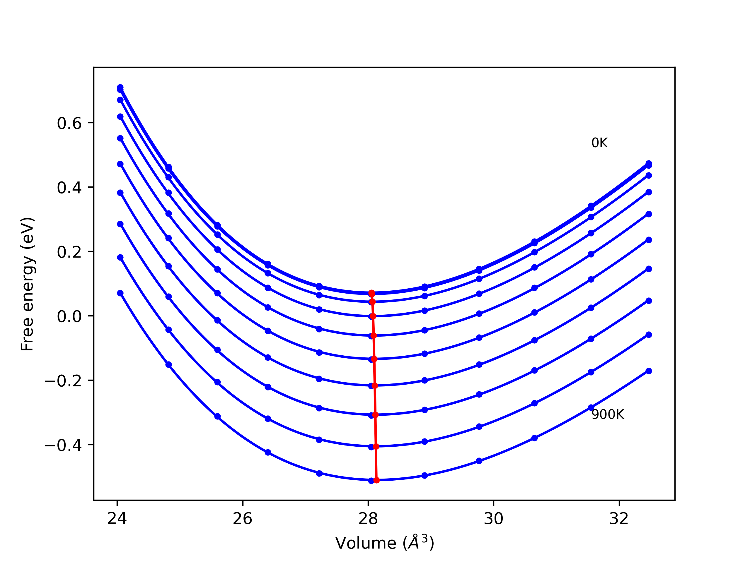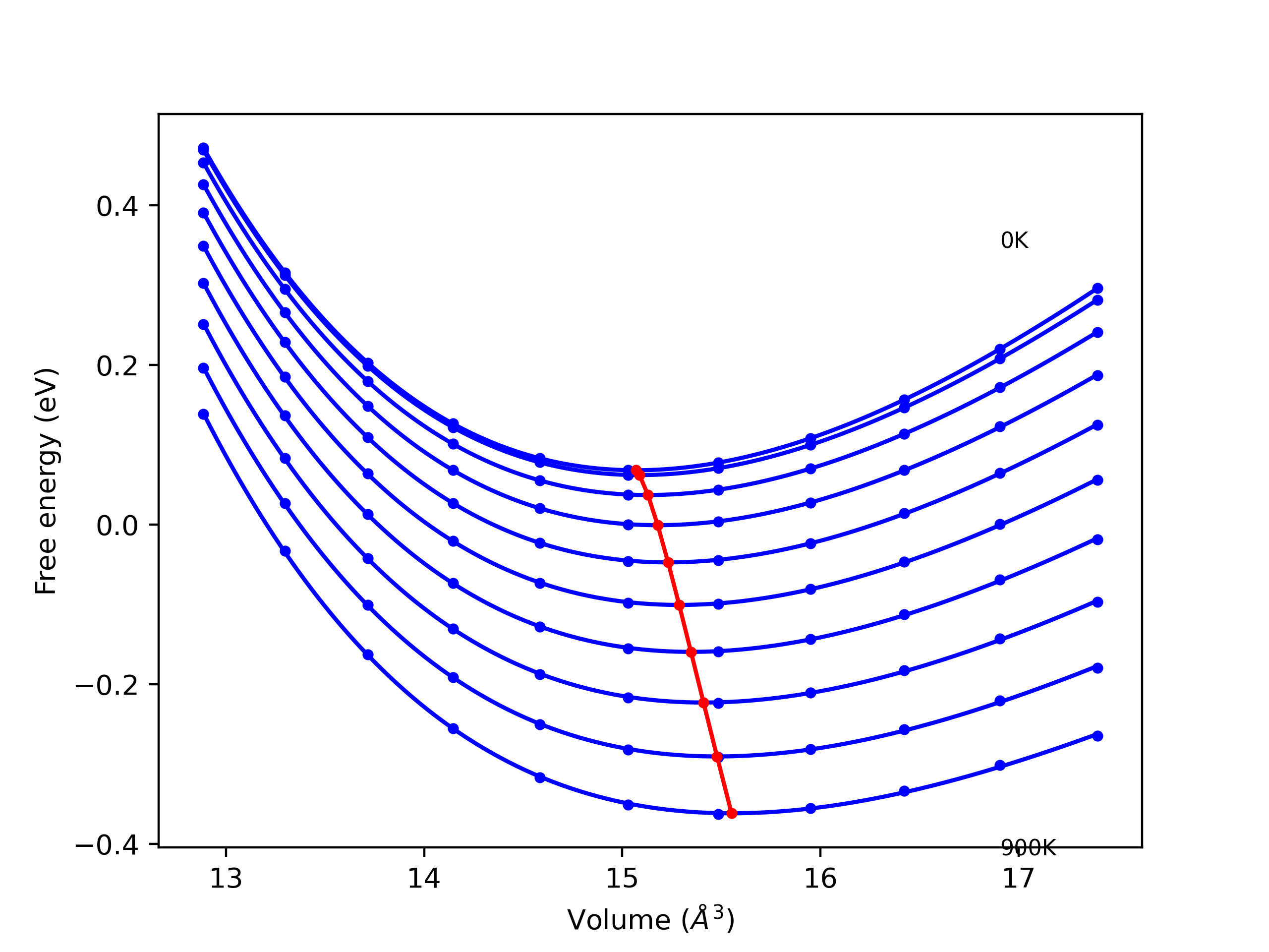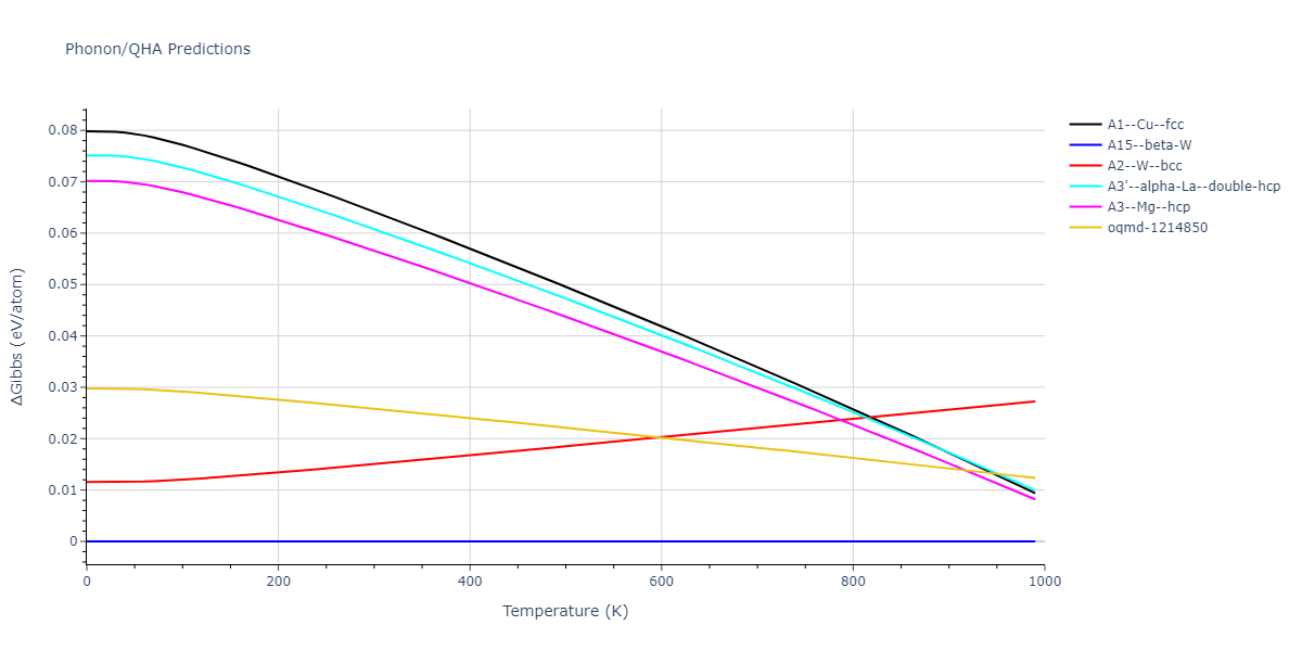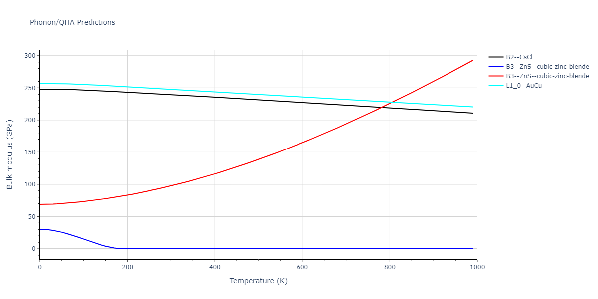 Phonon band structures and crystal properties estimated from quasi-harmonic approximation (QHA) calculations are displayed for select crystals. The calculations were performed using phonopy and LAMMPS. For the phonon calculations, 3x3 supercells of the potential-specific relaxed crystals were used. The QHA calculations were based on 11 strain states ranging from -0.05 to 0.05.