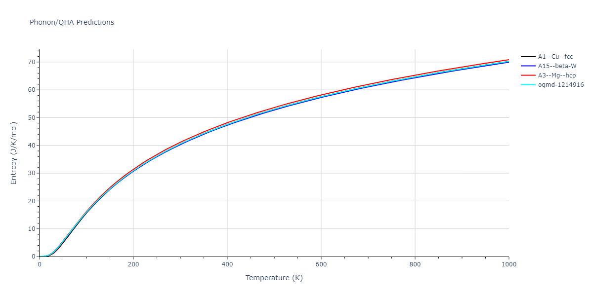 The Gibbs energies of the phases are estimated using thermodynamic integration between the interatomic potential in question and a simpler model with known Gibbs free energy values. For solids, the reference model is an Einstein solid, while for liquids it is the Uhlenbeck-Ford potential. Besides a short run at the start of the solid calculations to estimate Einstein model spring constants, the two calculations proceed similarly. Starting with the final relaxation configurations, the systems are stabilized for 25,000 steps. Then, over the next 50,000 steps the potential is swapped out for the reference potential. The system is then stabilized for another 25,000 steps with the reference model before a reverse swap of 50,000 steps is performed. The simulation ends with one final 25,000 step stabilization period. From the simulation, the irreversible work of transformation is estimated and used to compute the absolute Gibbs free energy of the target phase and potential relative to the reference potential. Entropy is estimated as the difference in enthalpy and Gibbs free energy and divided by temperature.