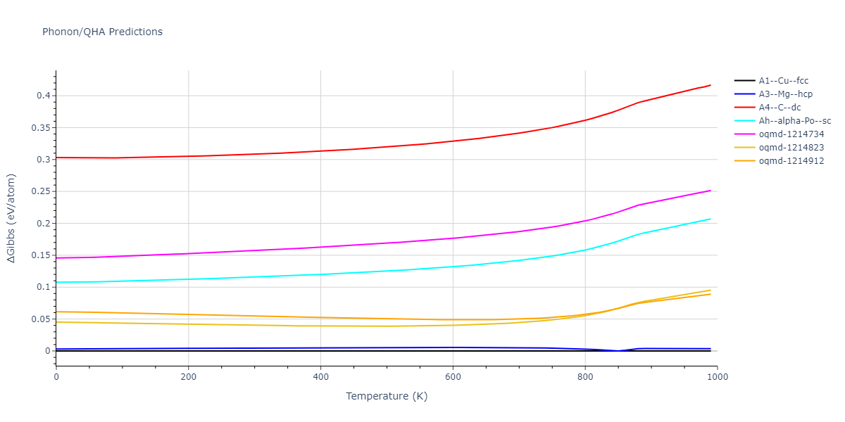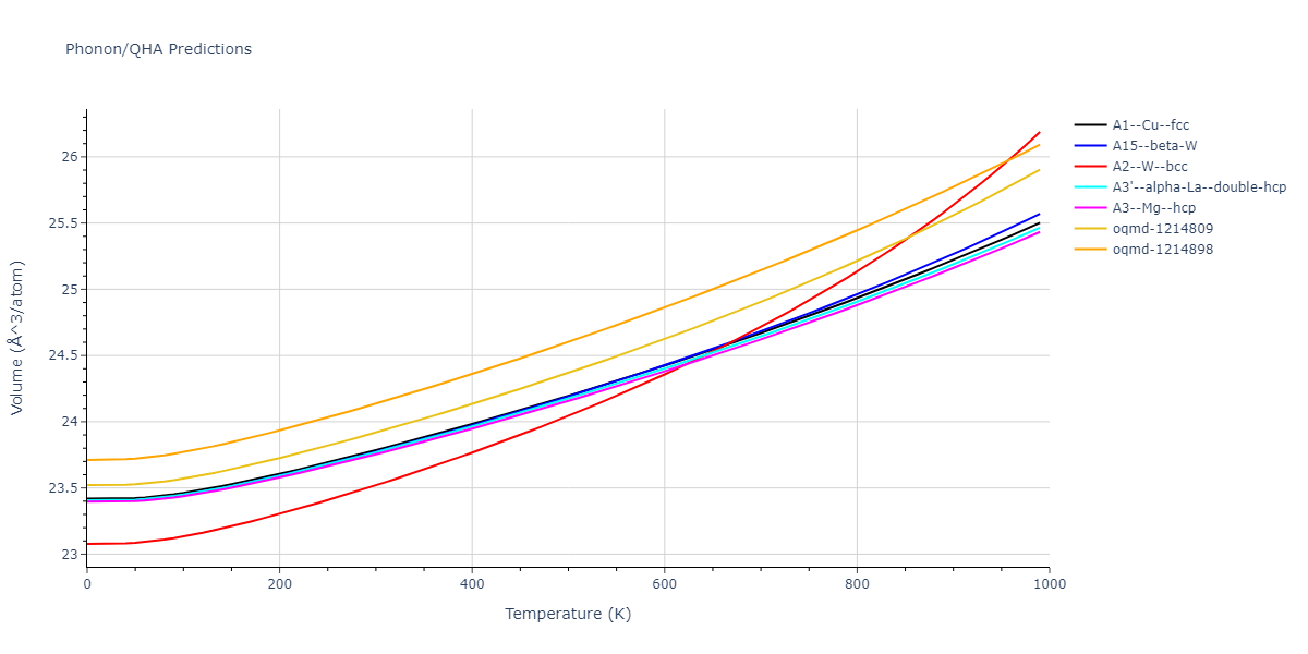 Phonon band structures and crystal properties estimated from quasi-harmonic approximation (QHA) calculations are displayed for select crystals. The calculations were performed using phonopy and LAMMPS. For the phonon calculations, 3x3 supercells of the potential-specific relaxed crystals were used. The QHA calculations were based on 11 strain states ranging from -0.05 to 0.05.