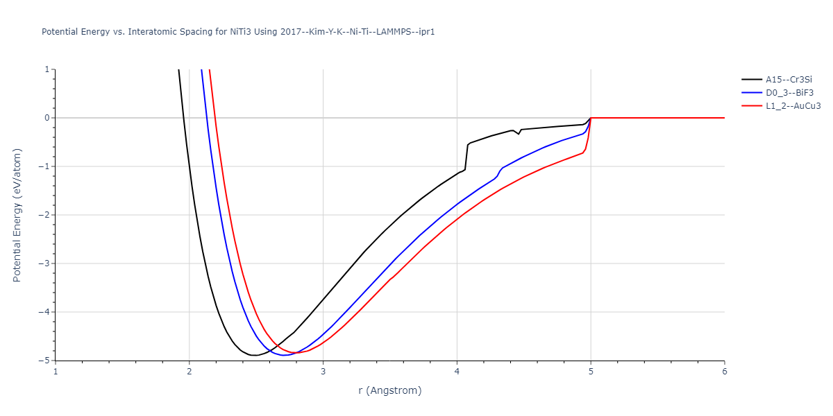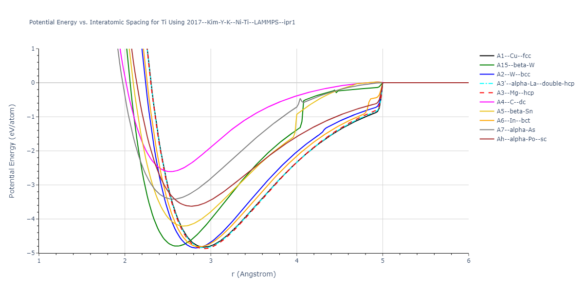 Plots of potential energy vs interatomic spacing, r, are shown below for a number of crystal structures. The structures are generated based on the ideal atomic positions and b/a and c/a lattice parameter ratios for a given crystal prototype. The size of the system is then uniformly scaled, and the energy calculated without relaxing the system. To obtain these plots, values of r are evaluated every 0.02 Å up to 6 Å.