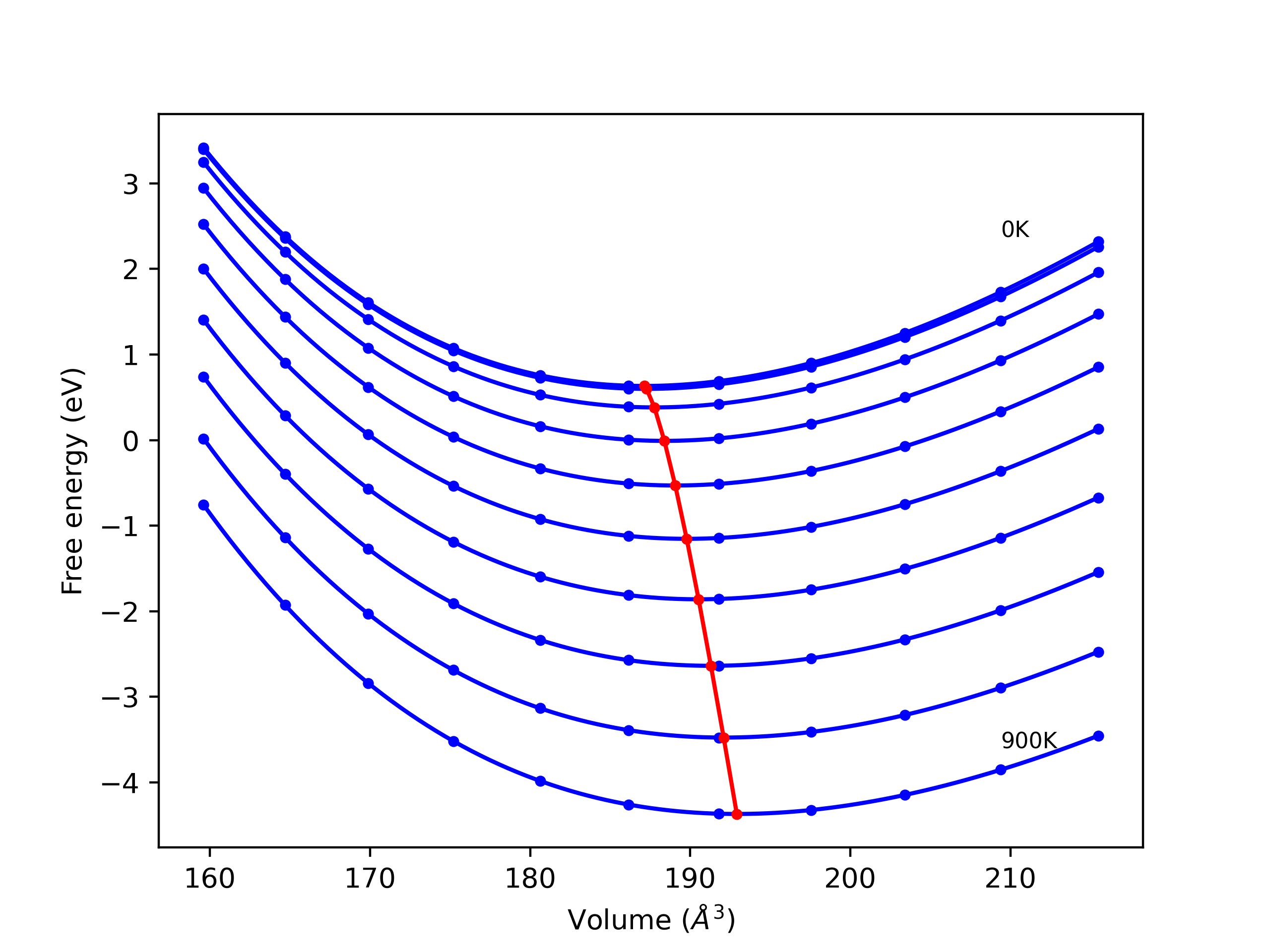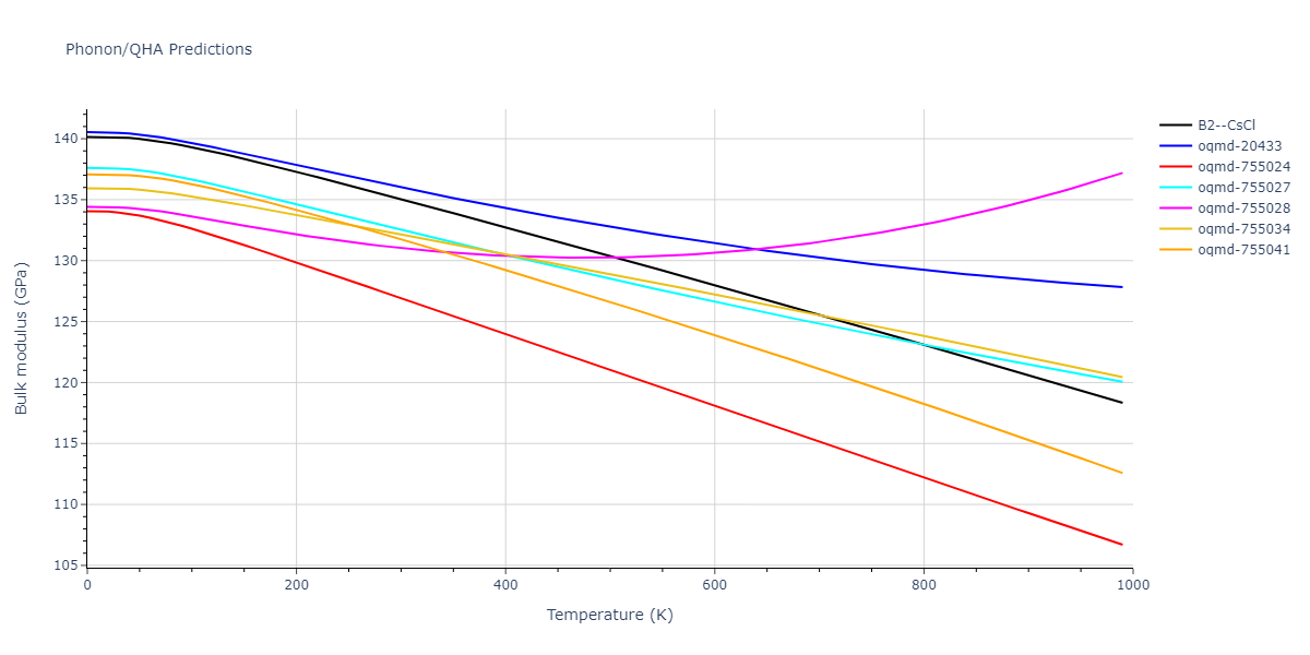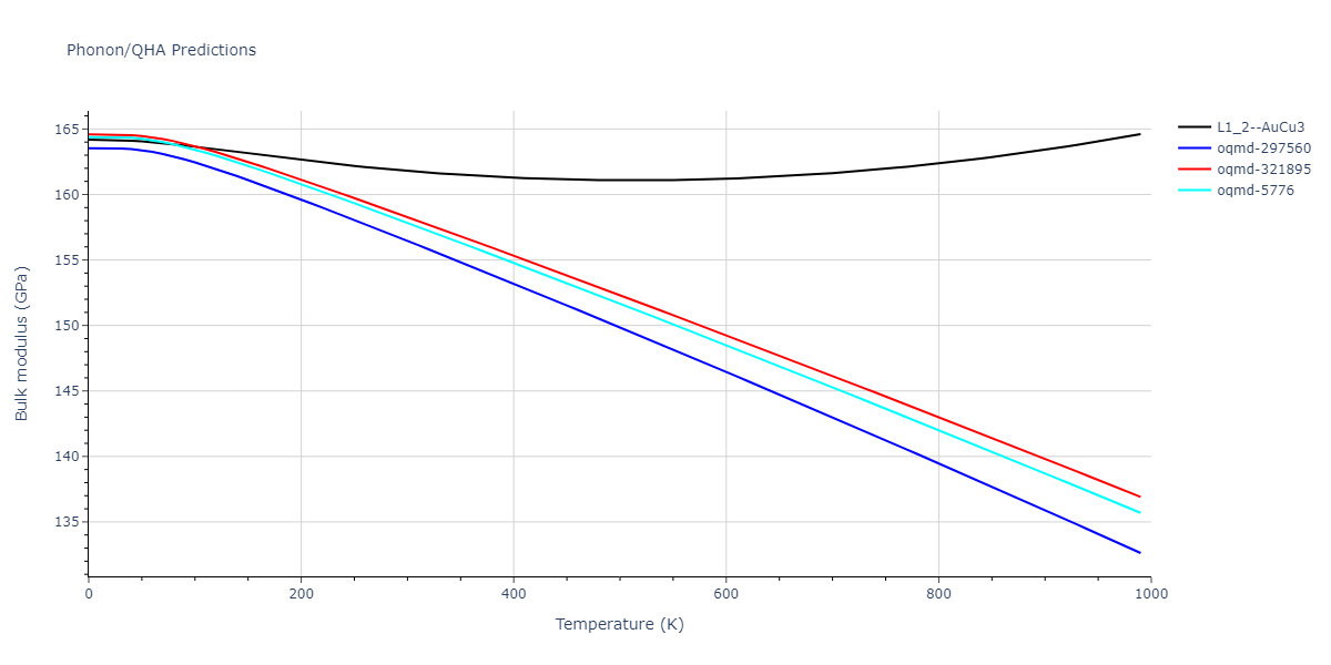 Plots of lattice and elastic constants are shown as a function of temperature. The 0K points were taken from the Crystal Structure Predictions and the Elastic Constants Predictions sections above for the unique crystal structures relaxed with the "dynamic" method. Starting from the 0 K relaxed crystal unit cells, supercell systems are created by replicating all three dimensions by the same multiplier to achieve at least 4000 atoms. The systems are then relaxed at 50 K and zero pressure using 1 million NPT steps. Lattice constants are estimated by averaging the measured box dimensions. Temperatures are iteratively increased by 50 K, with each subsequent relaxation calculation starting from the final atomic configuration at the previous temperature and relaxing for another 1 million steps.