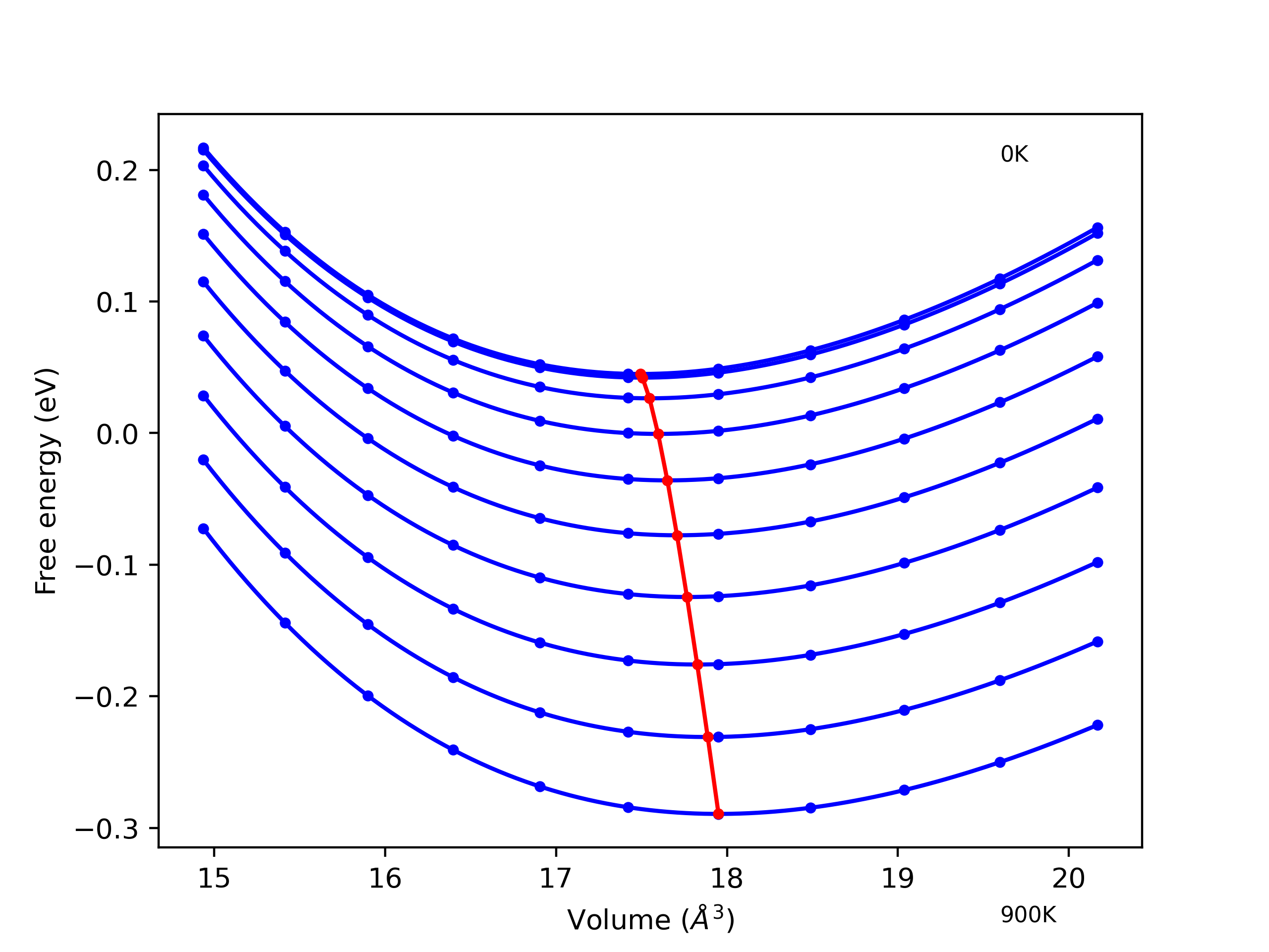 Plots of internal energy, Gibbs free energy, entropy, heat capacity and volume are shown here as a function of temperature for various crystal structures and liquid phases. The included crystal structures correspond to those in the Solid Structures vs. Temperature section, and the liquid phases to those in the Liquid Properties section. Internal energy and volume are taken from the associated structure relaxations mentioned in those previous sections. Constant pressure heat capacity is estimated using 3-point numerical derivatives of enthalpy versus temperature. Note that since all simulations done here are at 0 pressure, internal energy and enthalpy are equivalent.