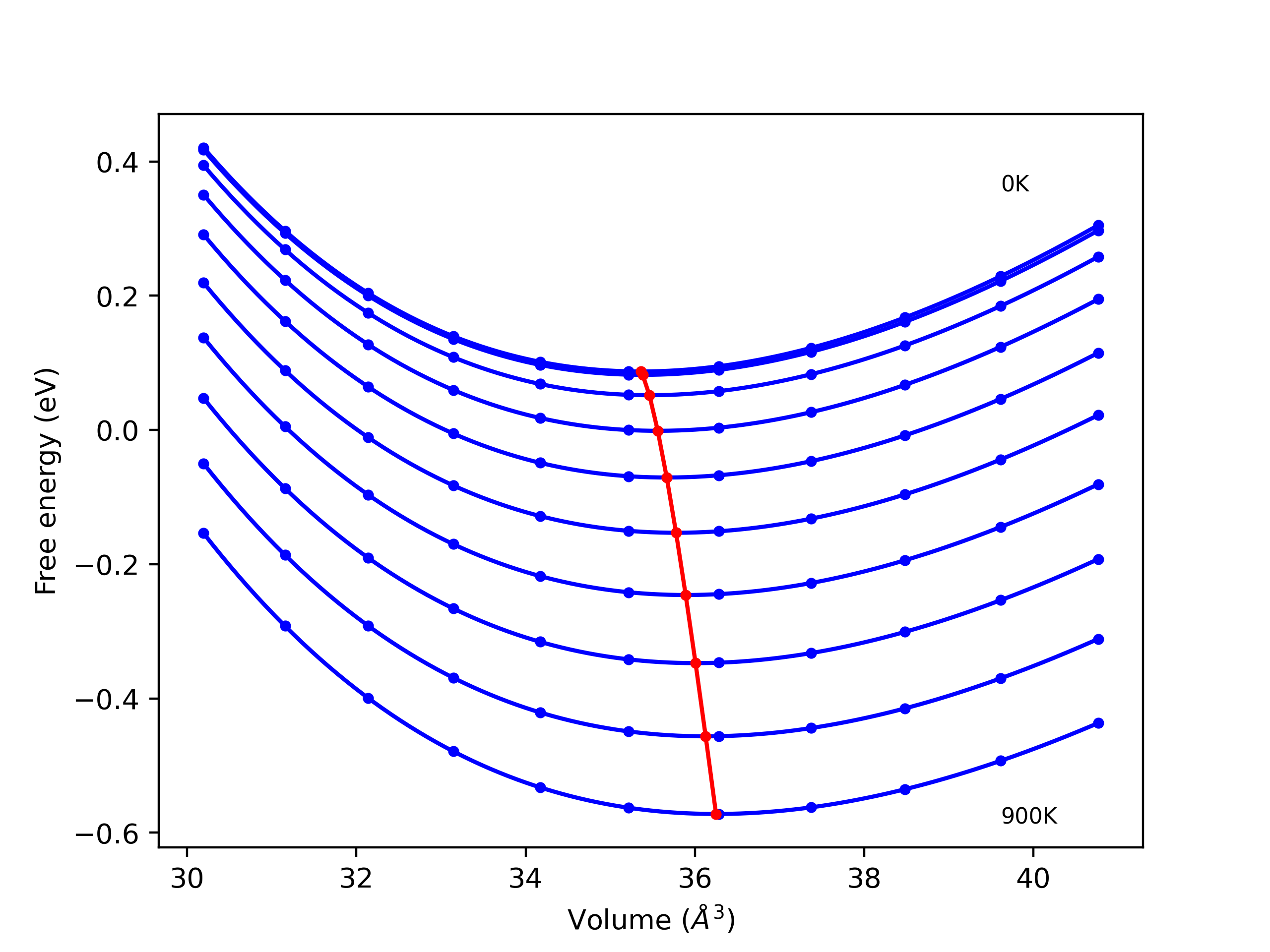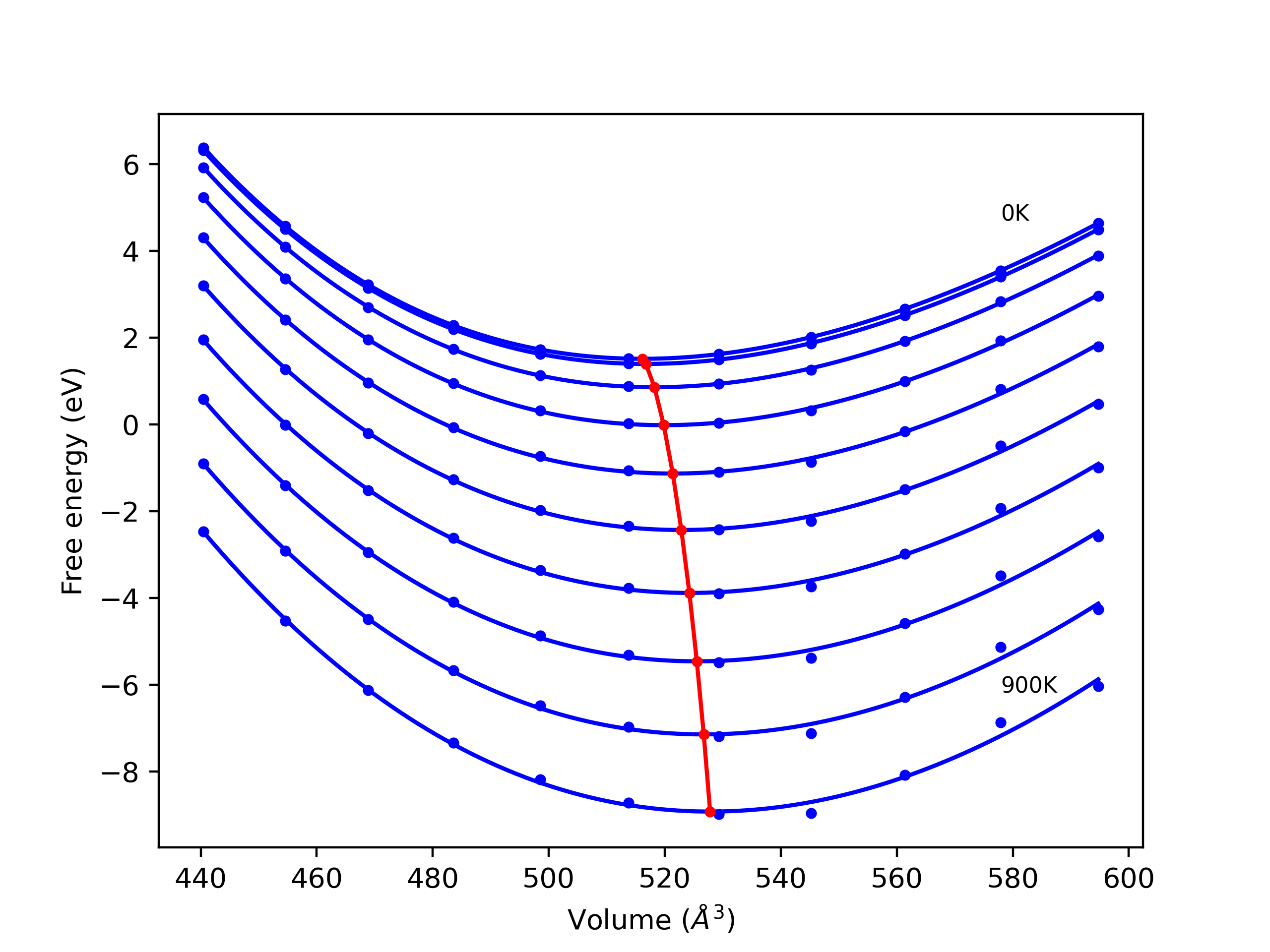 The Gibbs energies of the phases are estimated using thermodynamic integration between the interatomic potential in question and a simpler model with known Gibbs free energy values. For solids, the reference model is an Einstein solid, while for liquids it is the Uhlenbeck-Ford potential. Besides a short run at the start of the solid calculations to estimate Einstein model spring constants, the two calculations proceed similarly. Starting with the final relaxation configurations, the systems are stabilized for 25,000 steps. Then, over the next 50,000 steps the potential is swapped out for the reference potential. The system is then stabilized for another 25,000 steps with the reference model before a reverse swap of 50,000 steps is performed. The simulation ends with one final 25,000 step stabilization period. From the simulation, the irreversible work of transformation is estimated and used to compute the absolute Gibbs free energy of the target phase and potential relative to the reference potential. Entropy is estimated as the difference in enthalpy and Gibbs free energy and divided by temperature.