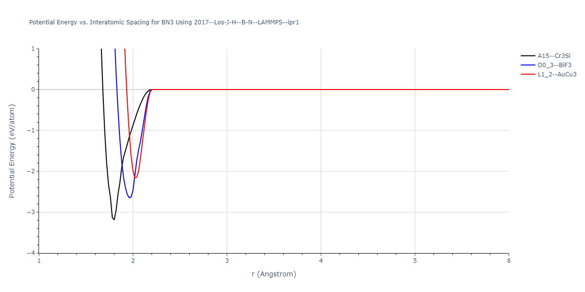 Plots of potential energy vs interatomic spacing, r, are shown below for a number of crystal structures. The structures are generated based on the ideal atomic positions and b/a and c/a lattice parameter ratios for a given crystal prototype. The size of the system is then uniformly scaled, and the energy calculated without relaxing the system. To obtain these plots, values of r are evaluated every 0.02 Å up to 6 Å.