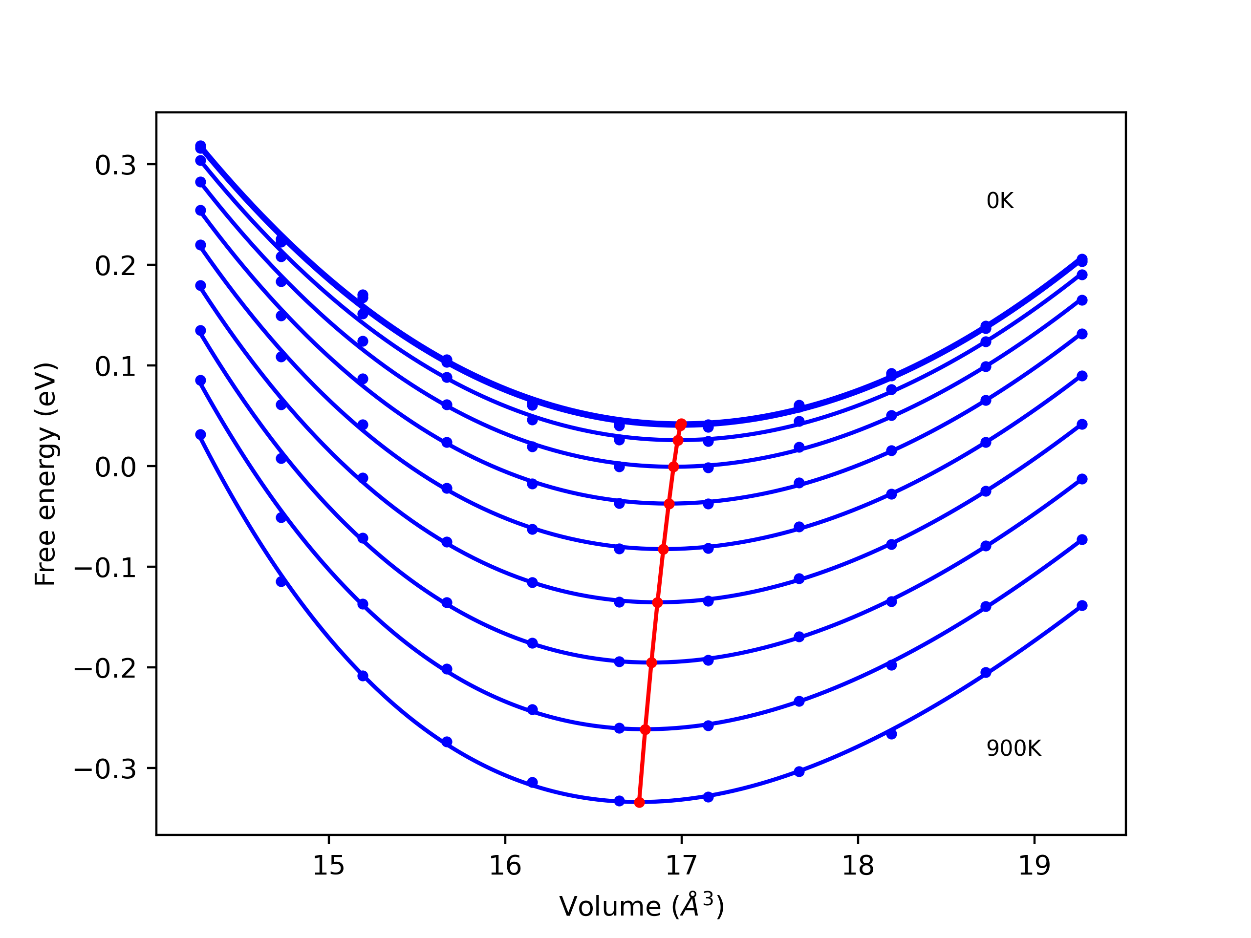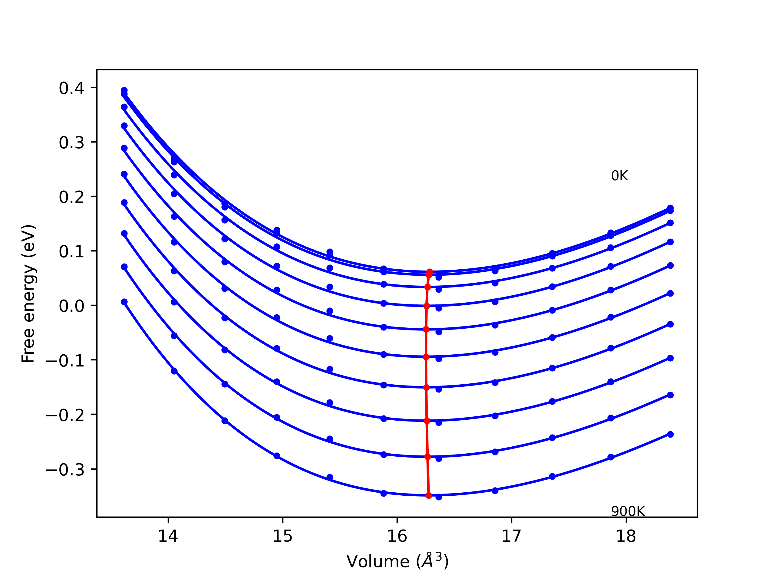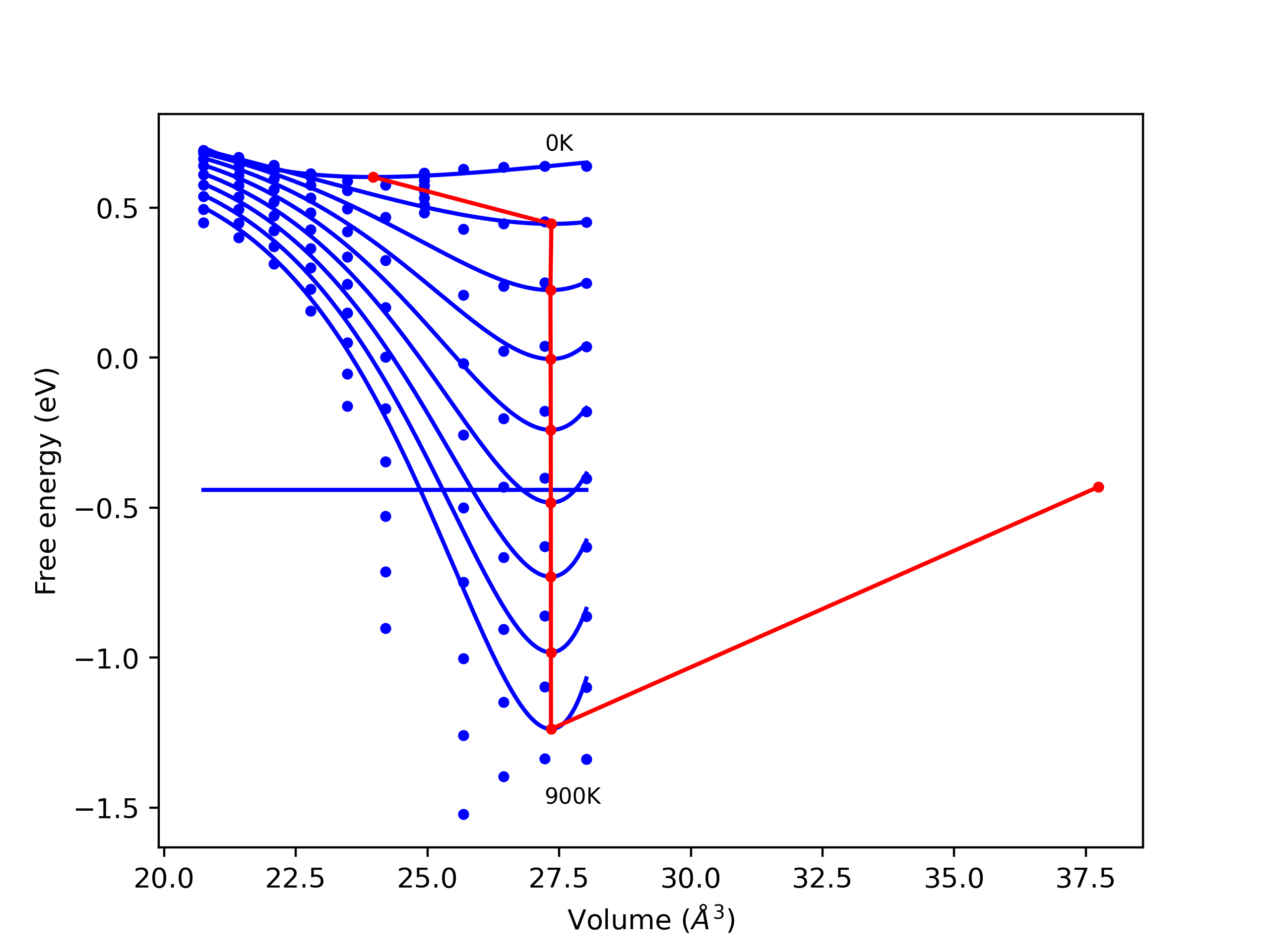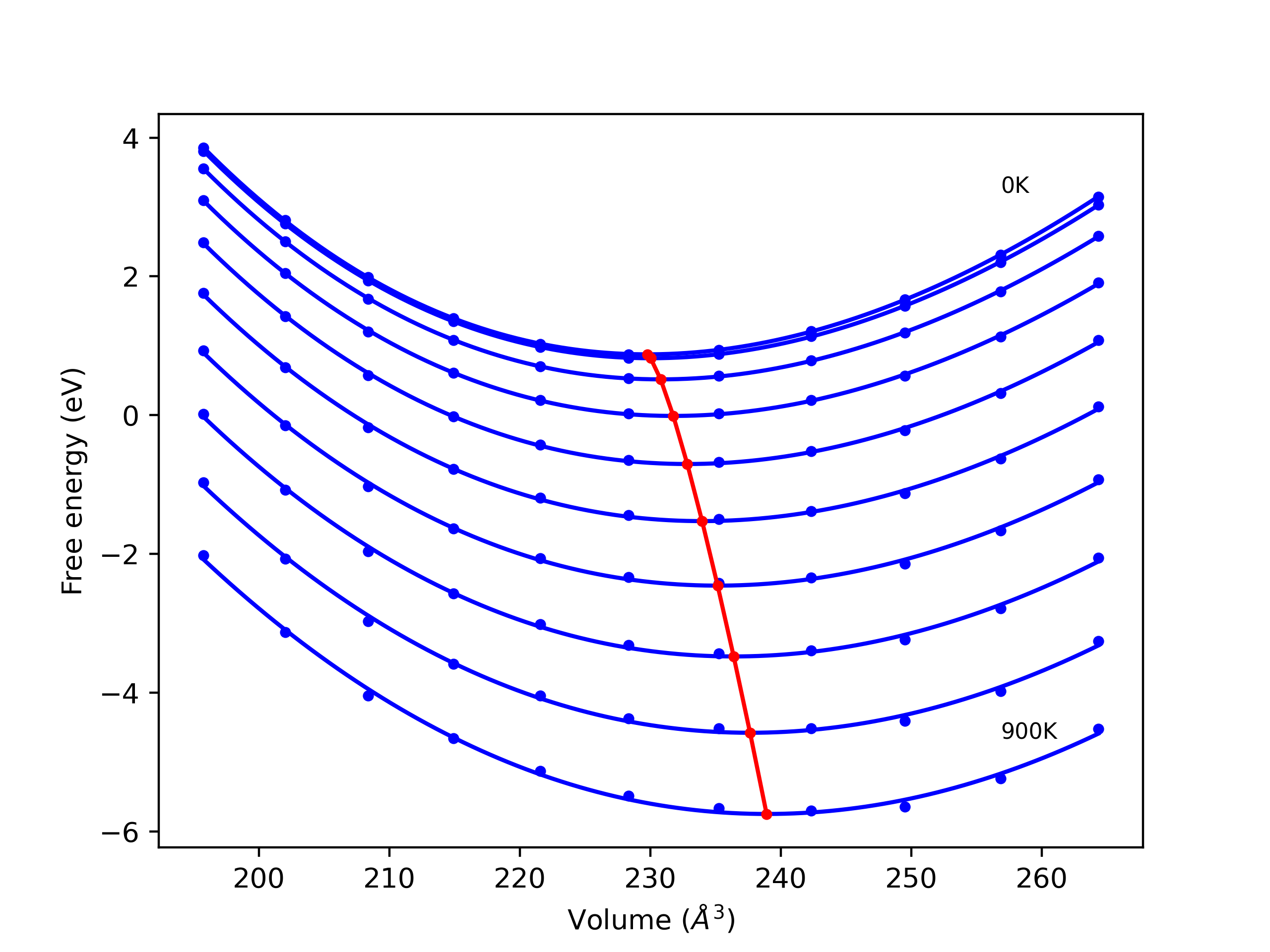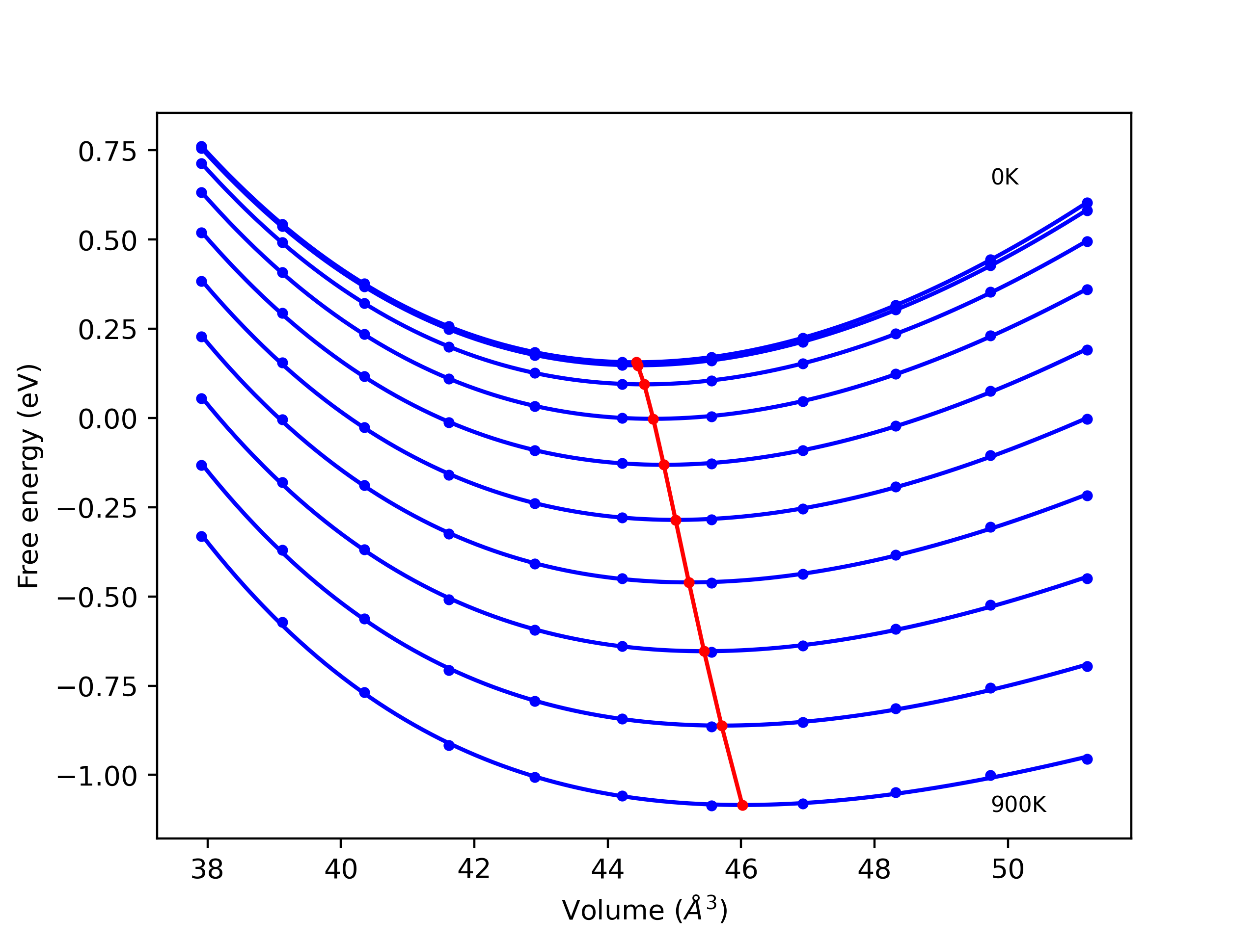 Phonon band structures and crystal properties estimated from quasi-harmonic approximation (QHA) calculations are displayed for select crystals. The calculations were performed using phonopy and LAMMPS. For the phonon calculations, 3x3 supercells of the potential-specific relaxed crystals were used. The QHA calculations were based on 11 strain states ranging from -0.05 to 0.05.