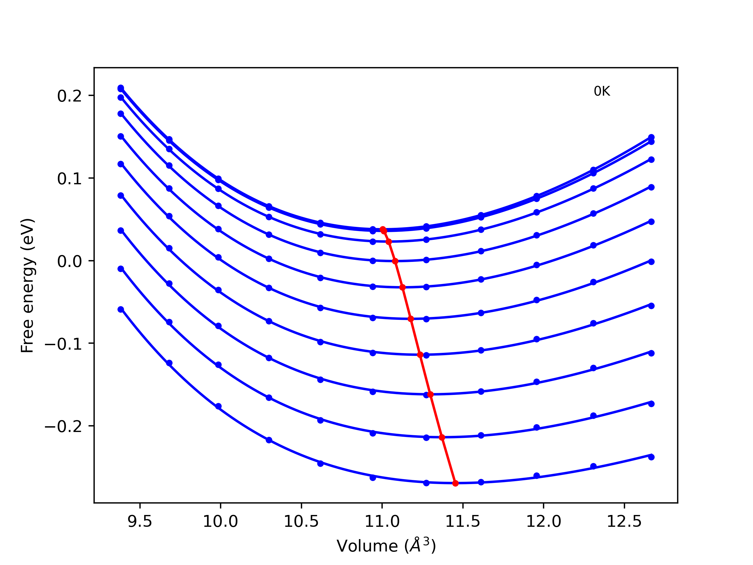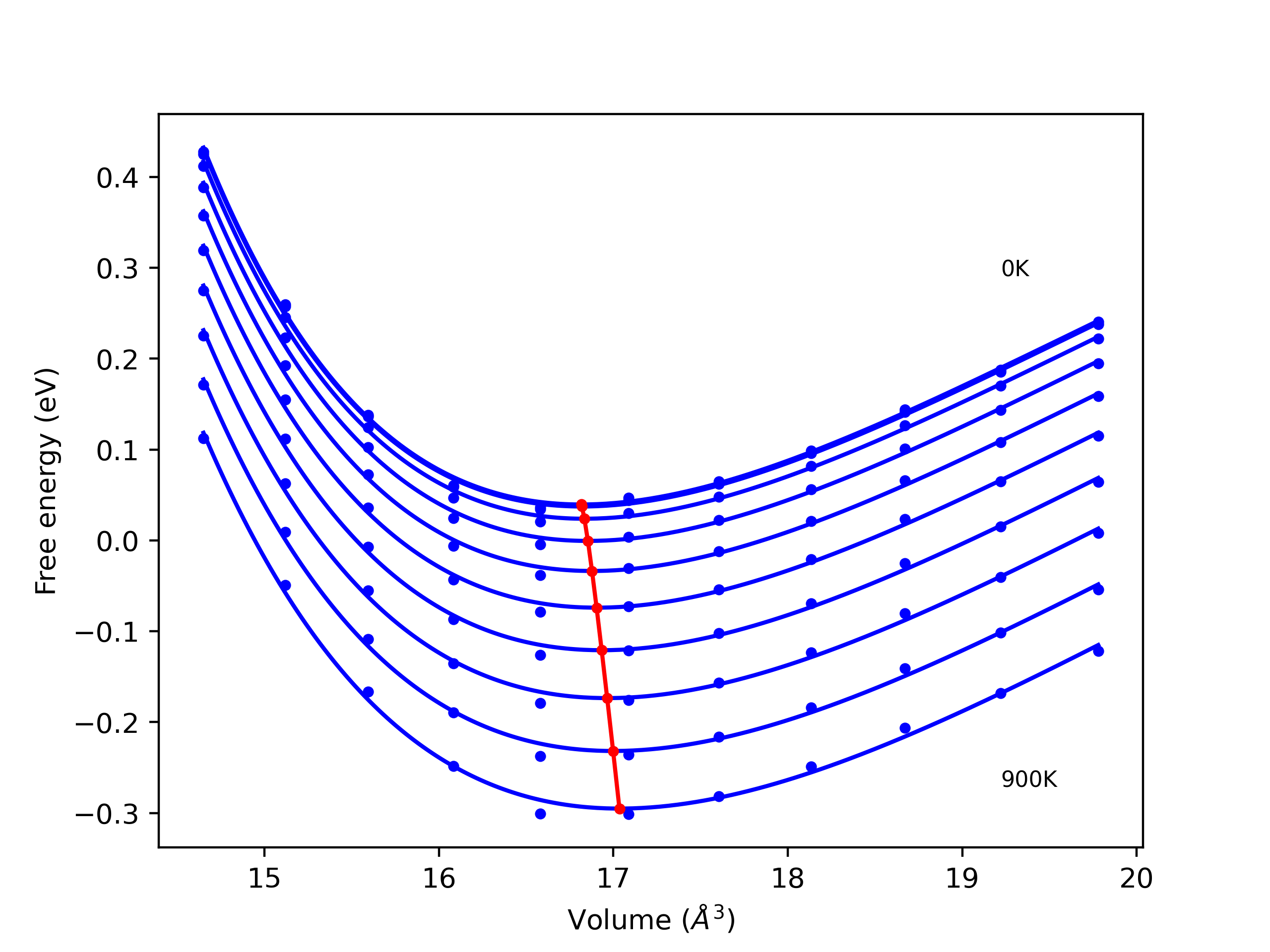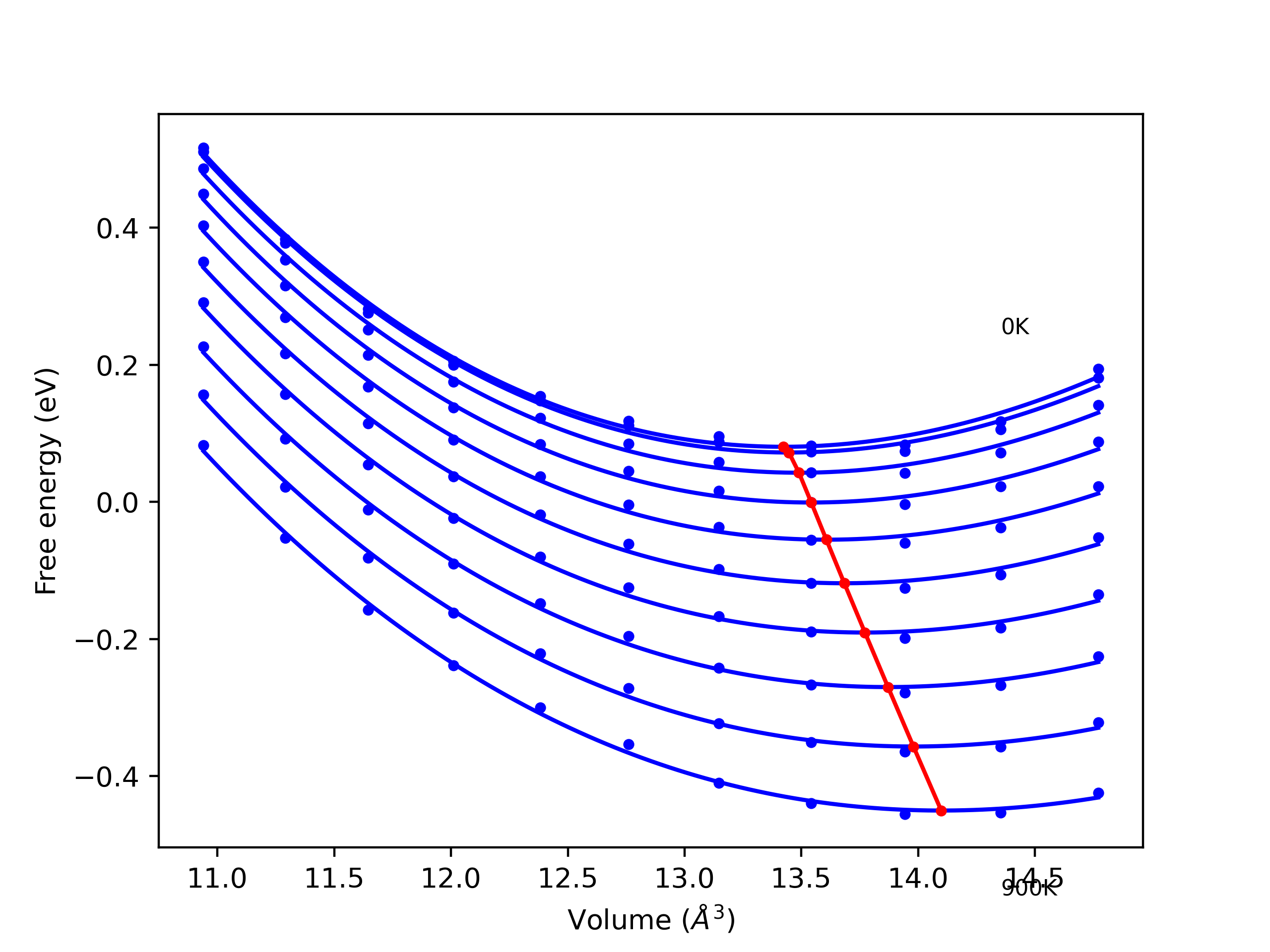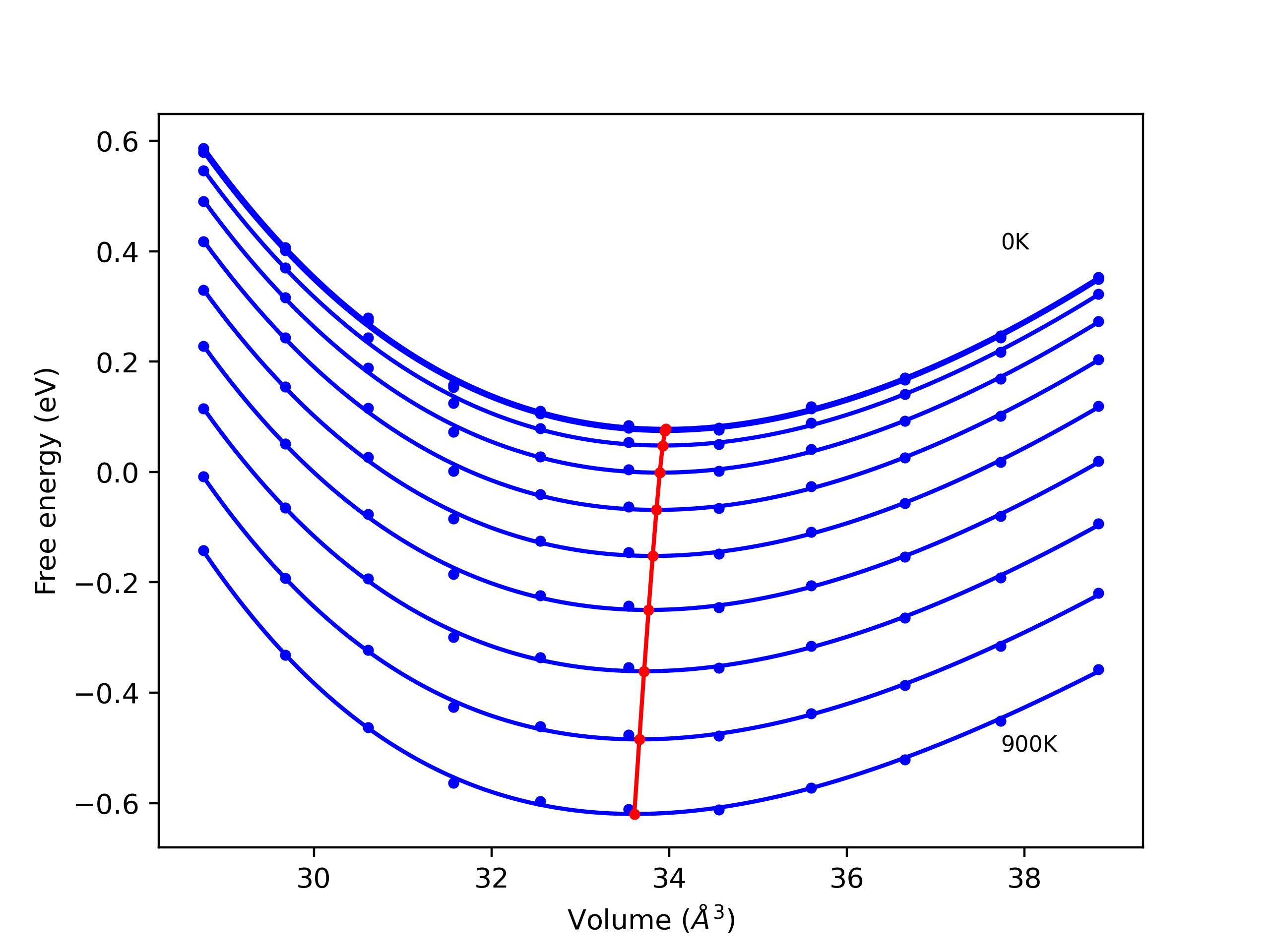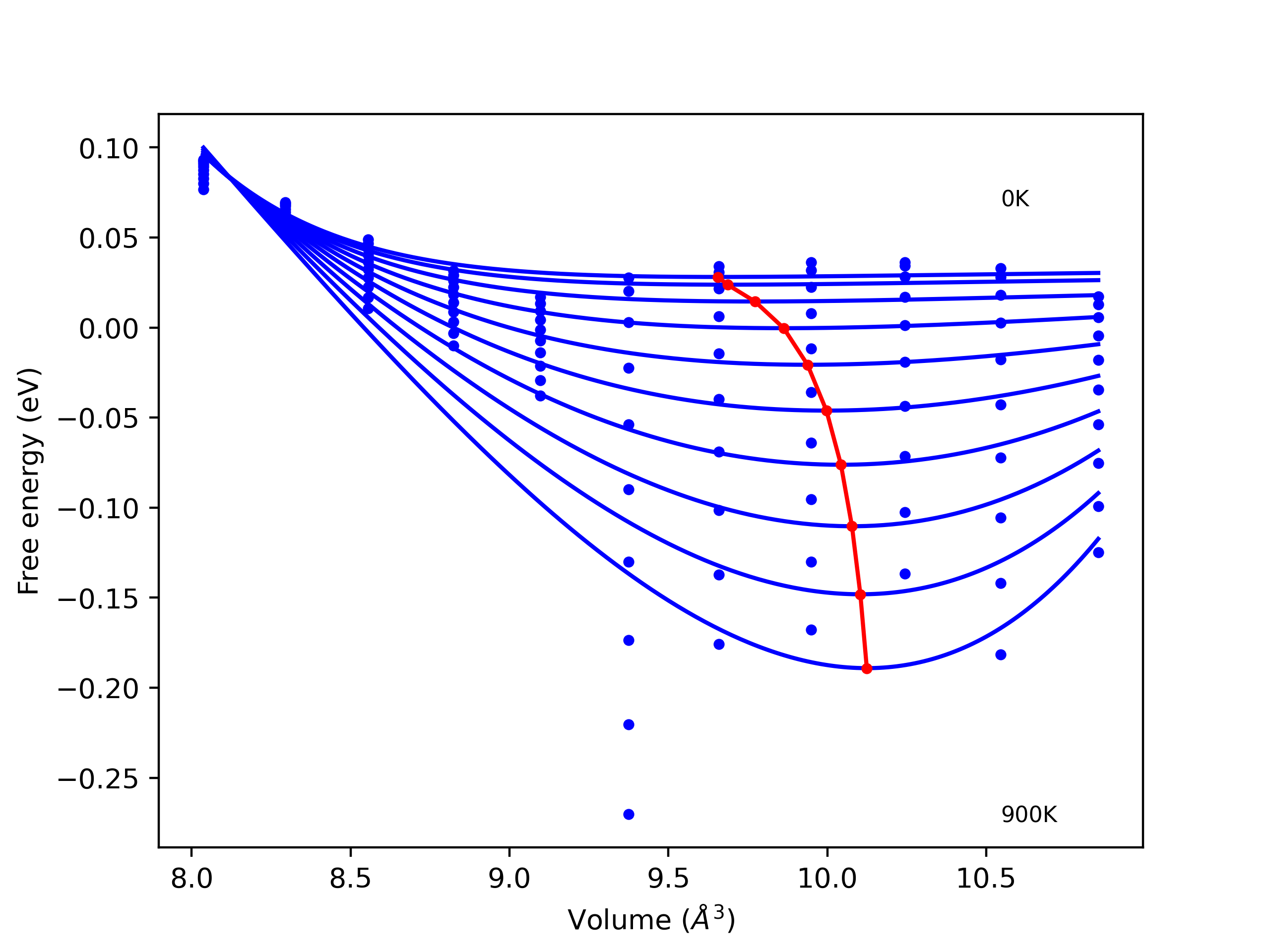 Phonon band structures and crystal properties estimated from quasi-harmonic approximation (QHA) calculations are displayed for select crystals. The calculations were performed using phonopy and LAMMPS. For the phonon calculations, 3x3 supercells of the potential-specific relaxed crystals were used. The QHA calculations were based on 11 strain states ranging from -0.05 to 0.05.
