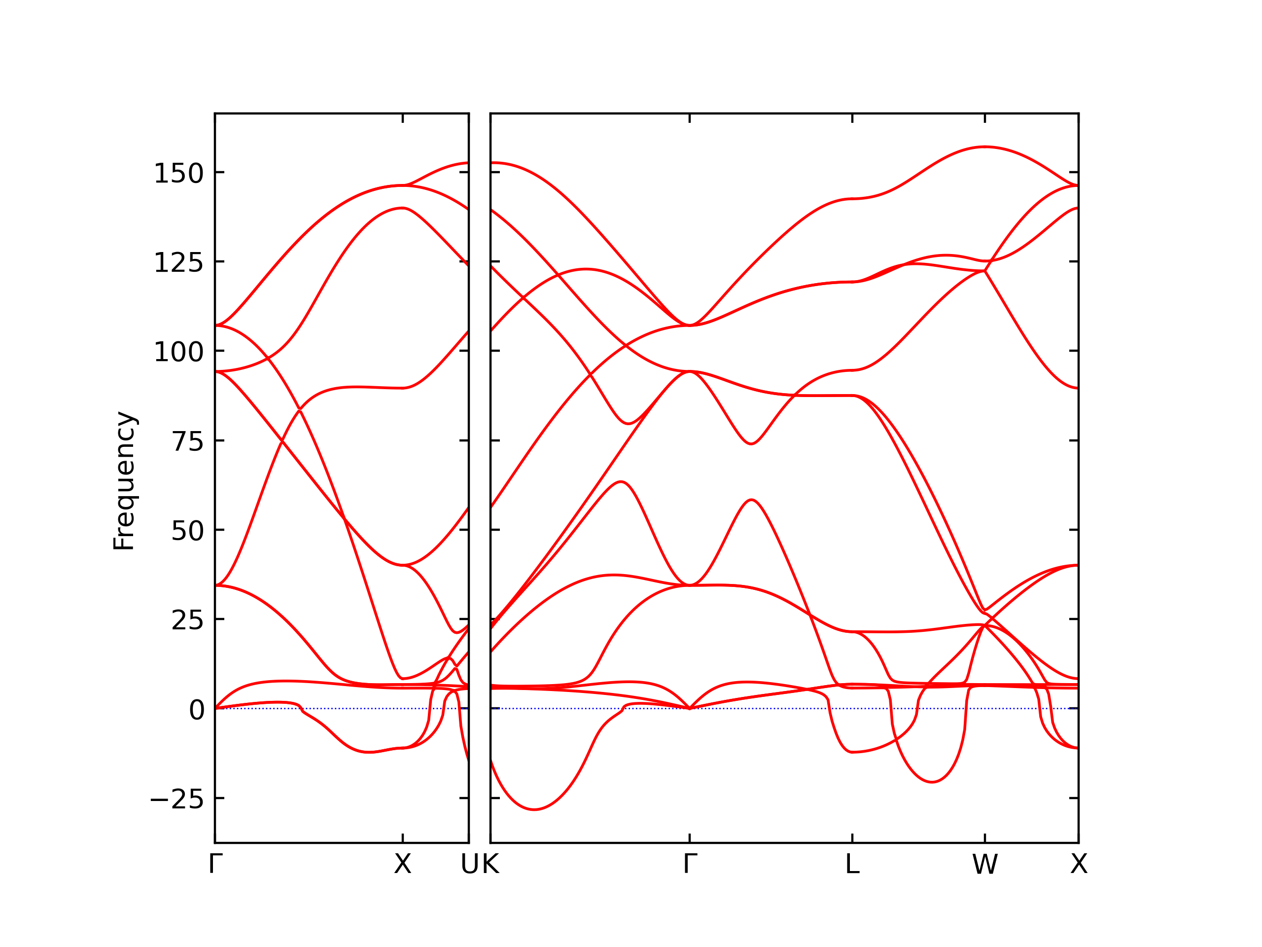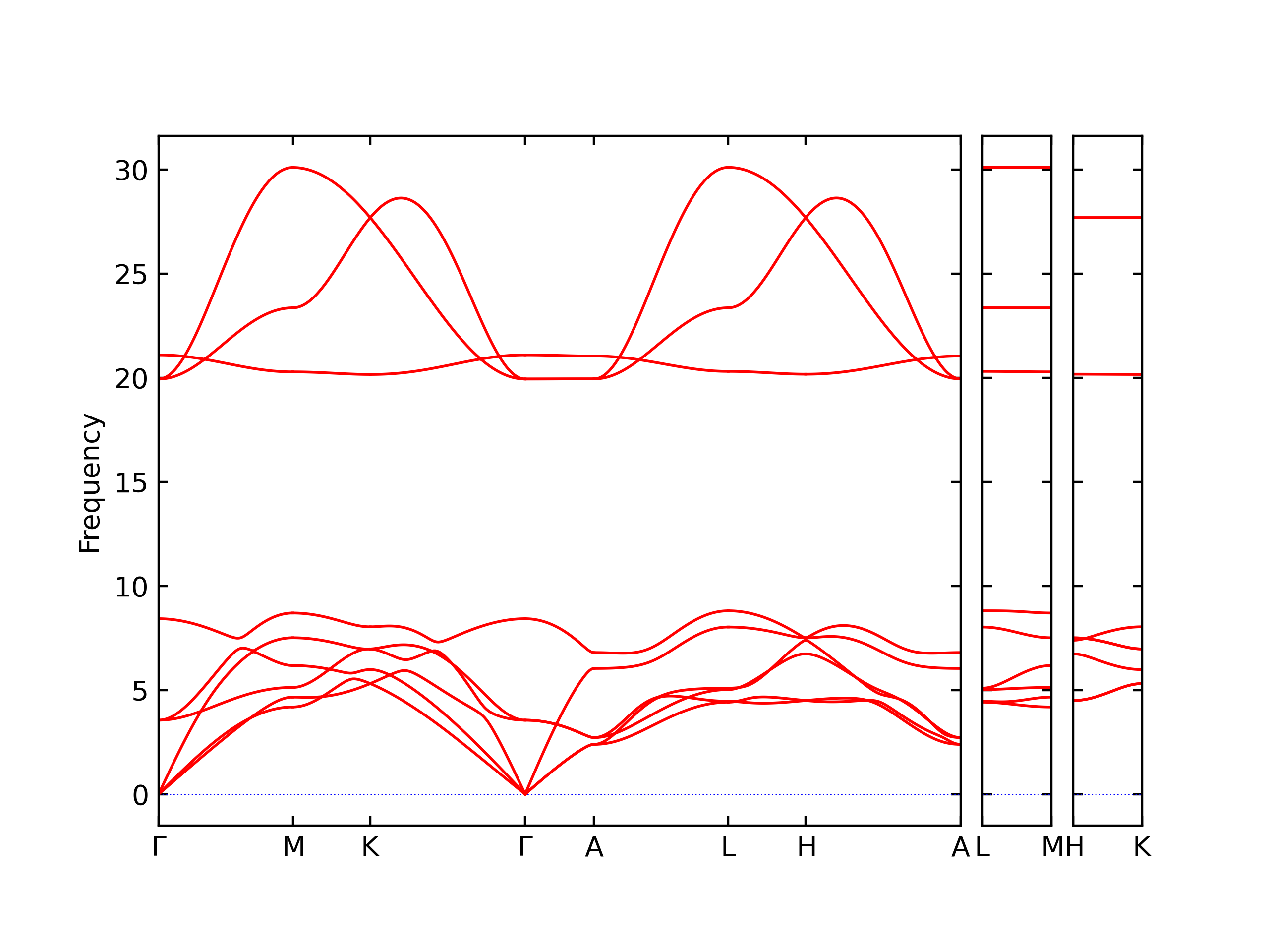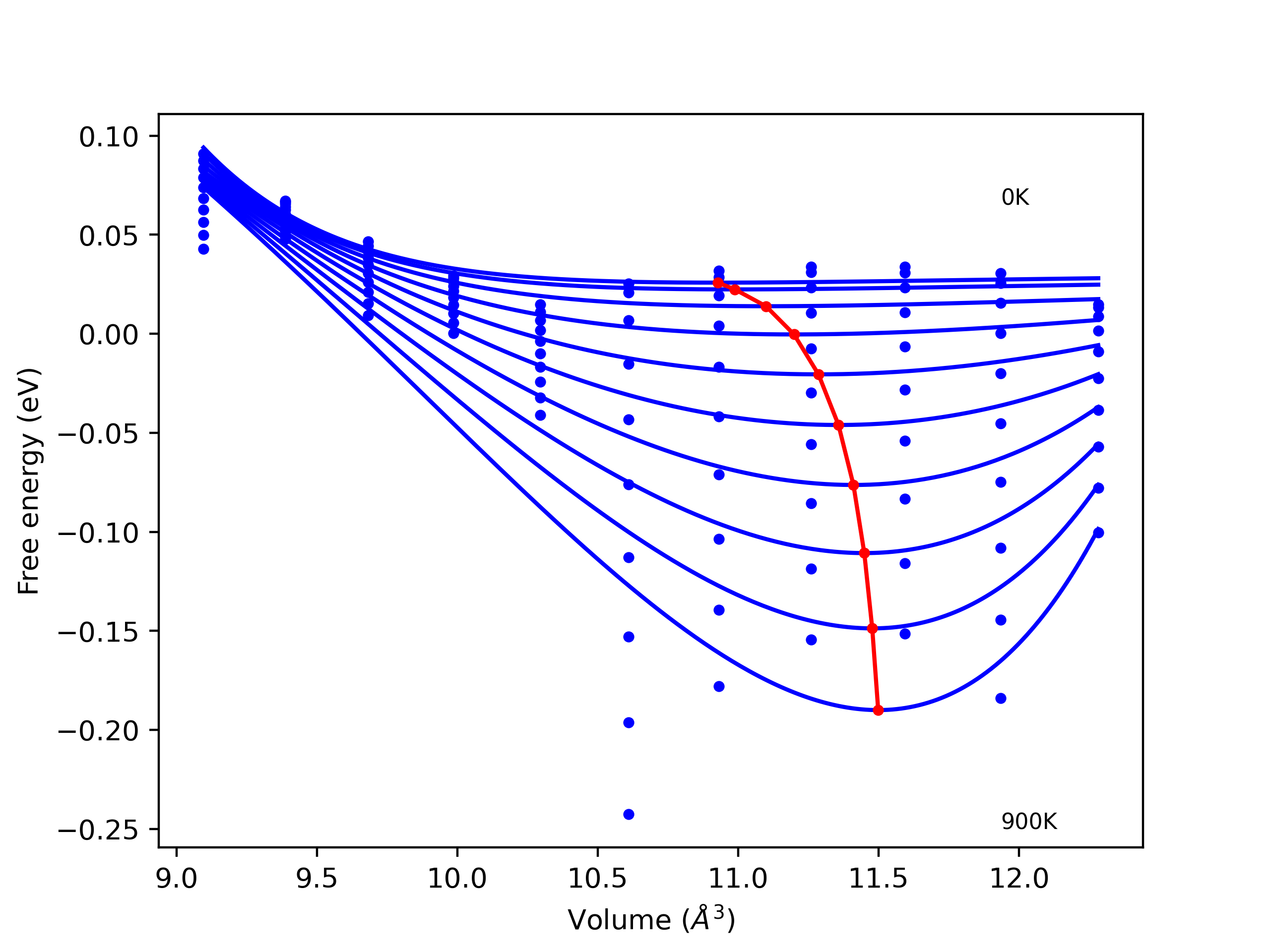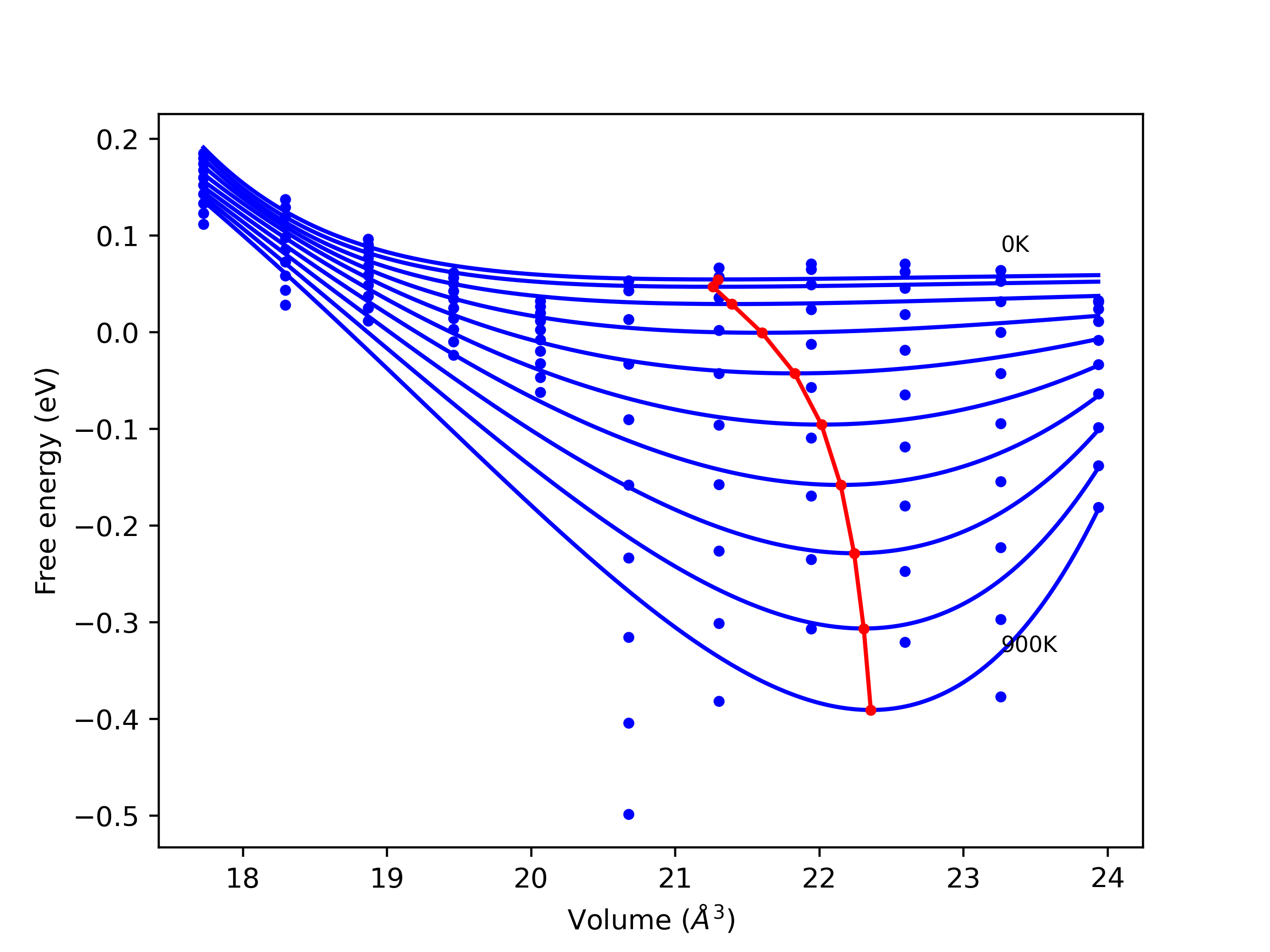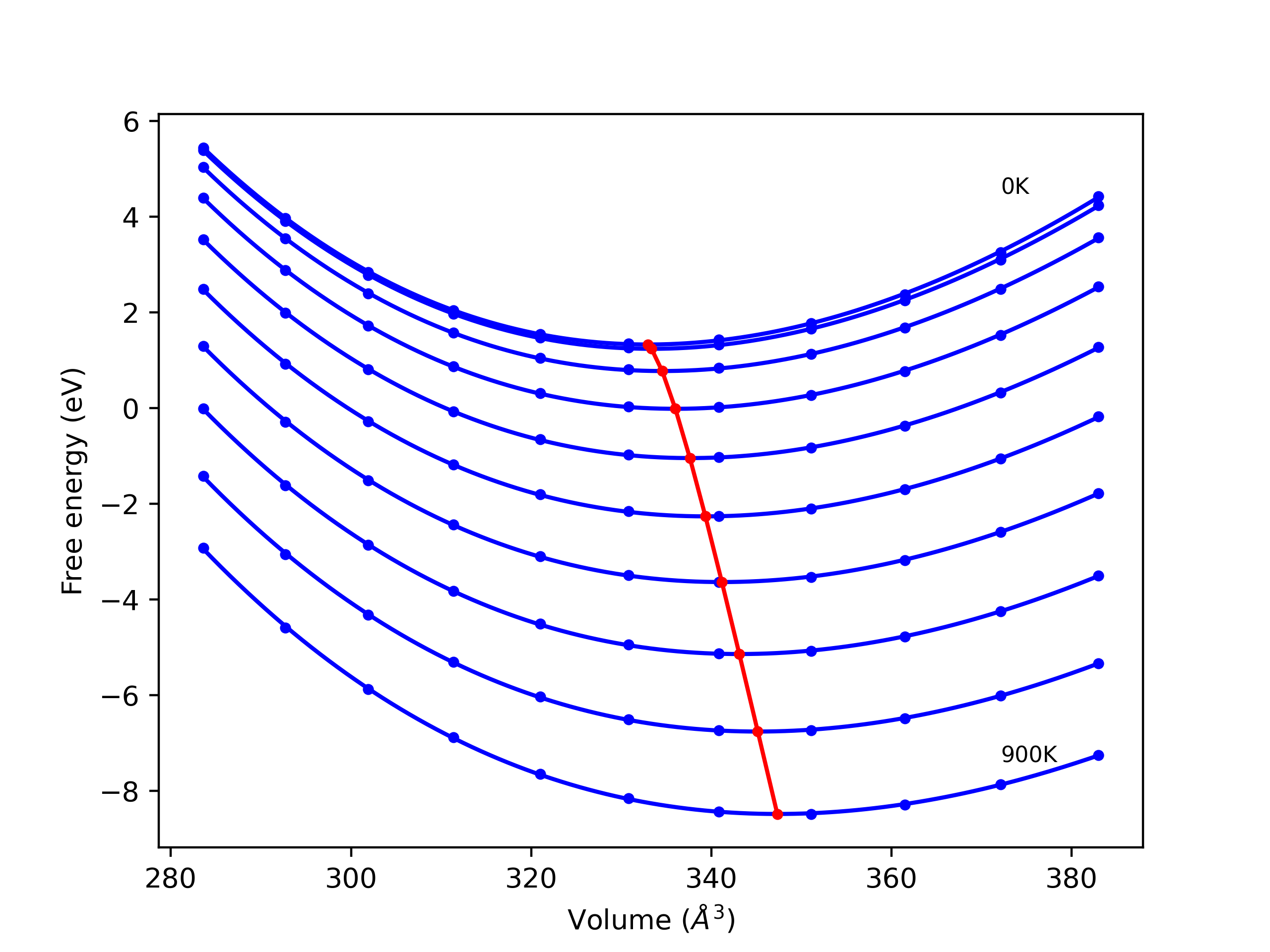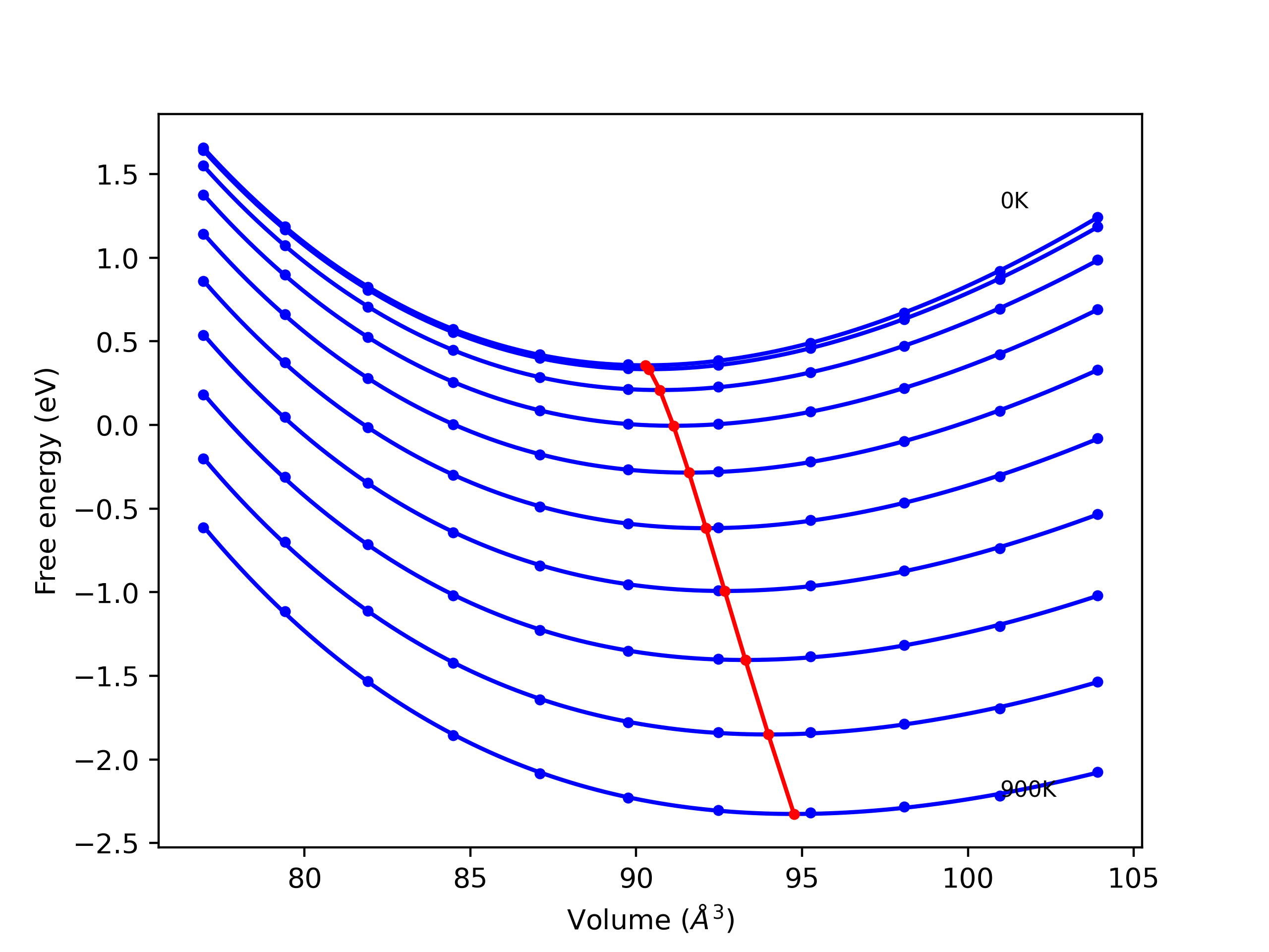Phonon band structures and crystal properties estimated from quasi-harmonic approximation (QHA) calculations are displayed for select crystals. The calculations were performed using phonopy and LAMMPS. For the phonon calculations, 3x3 supercells of the potential-specific relaxed crystals were used. The QHA calculations were based on 11 strain states ranging from -0.05 to 0.05.
