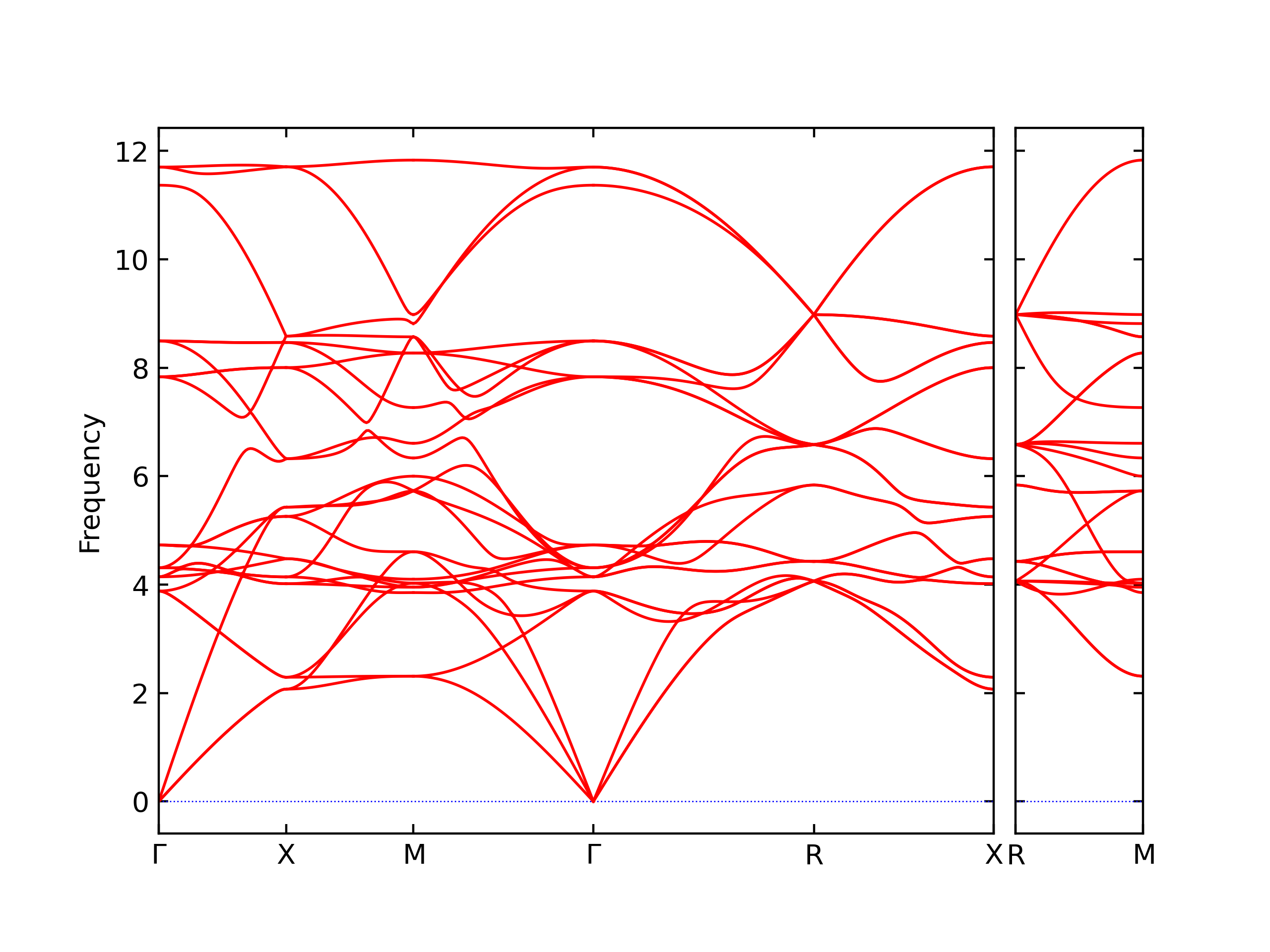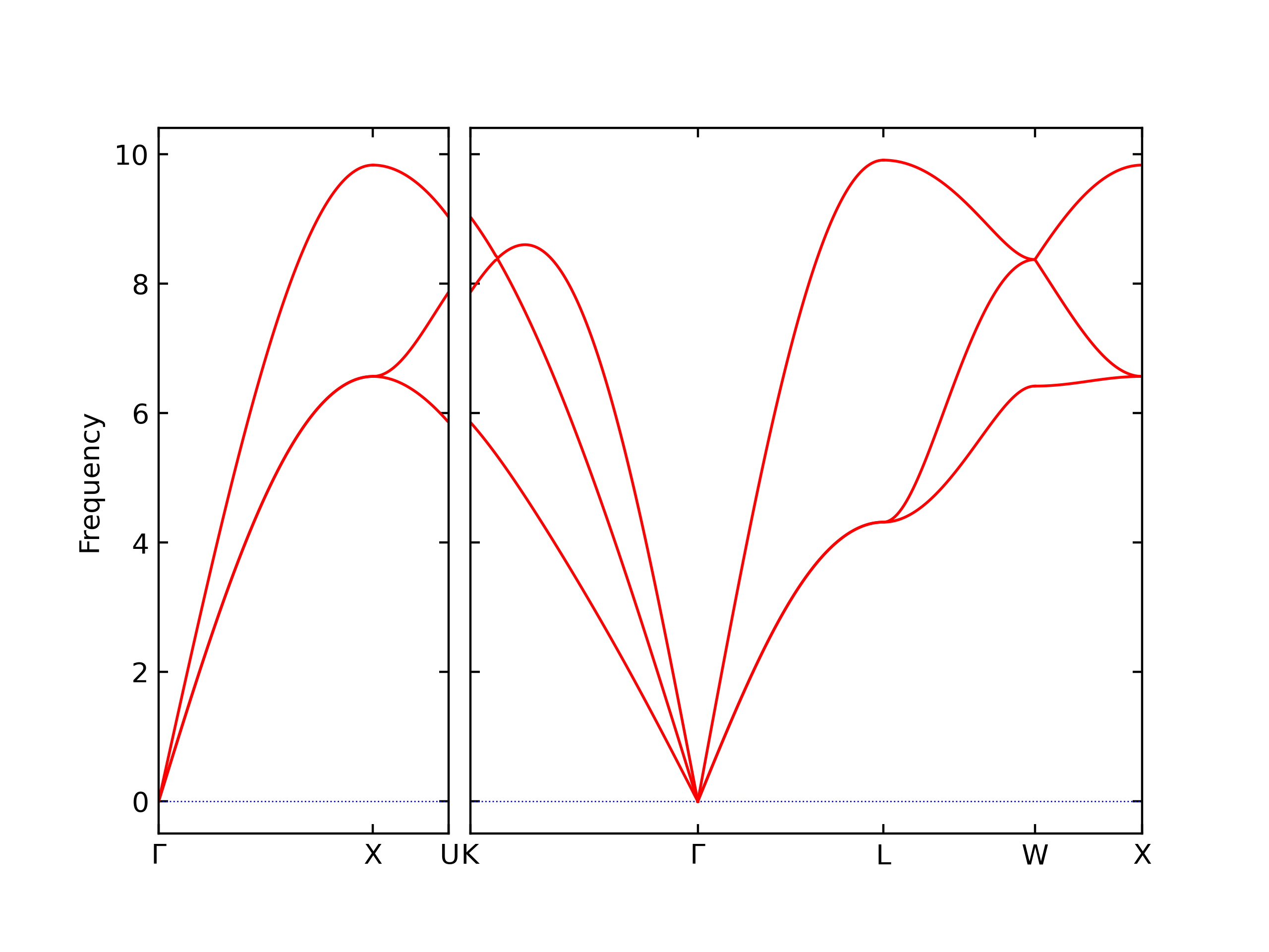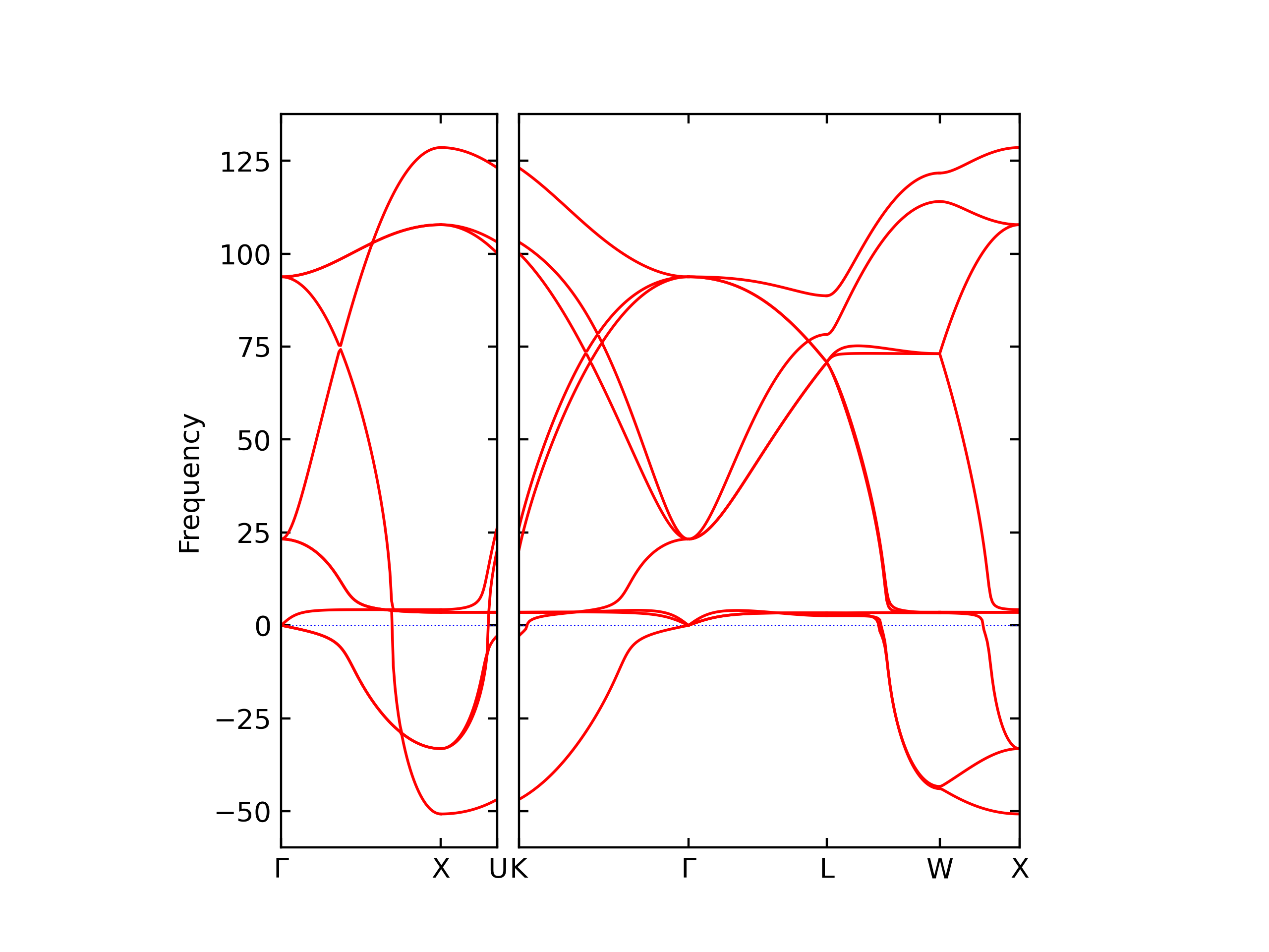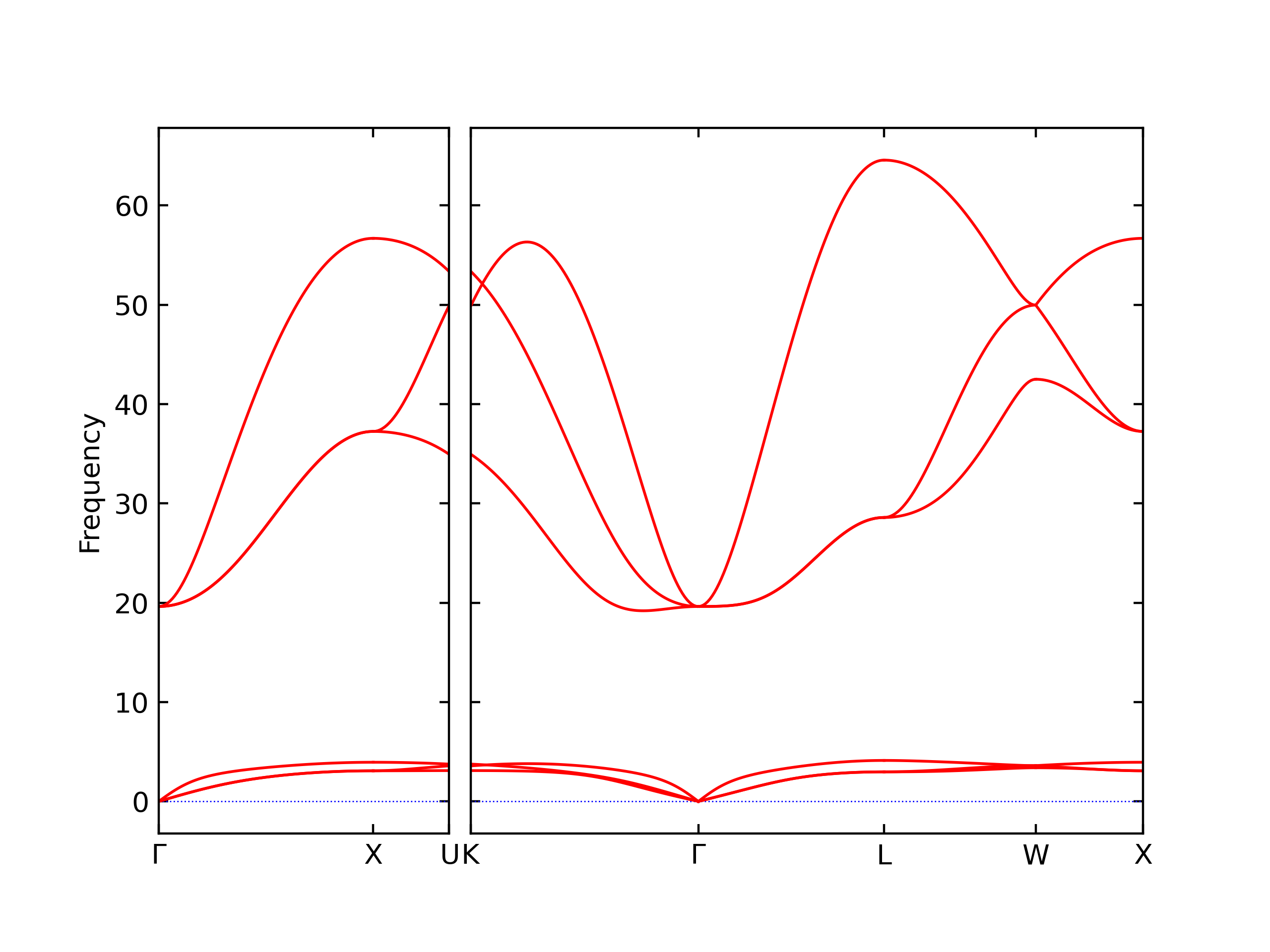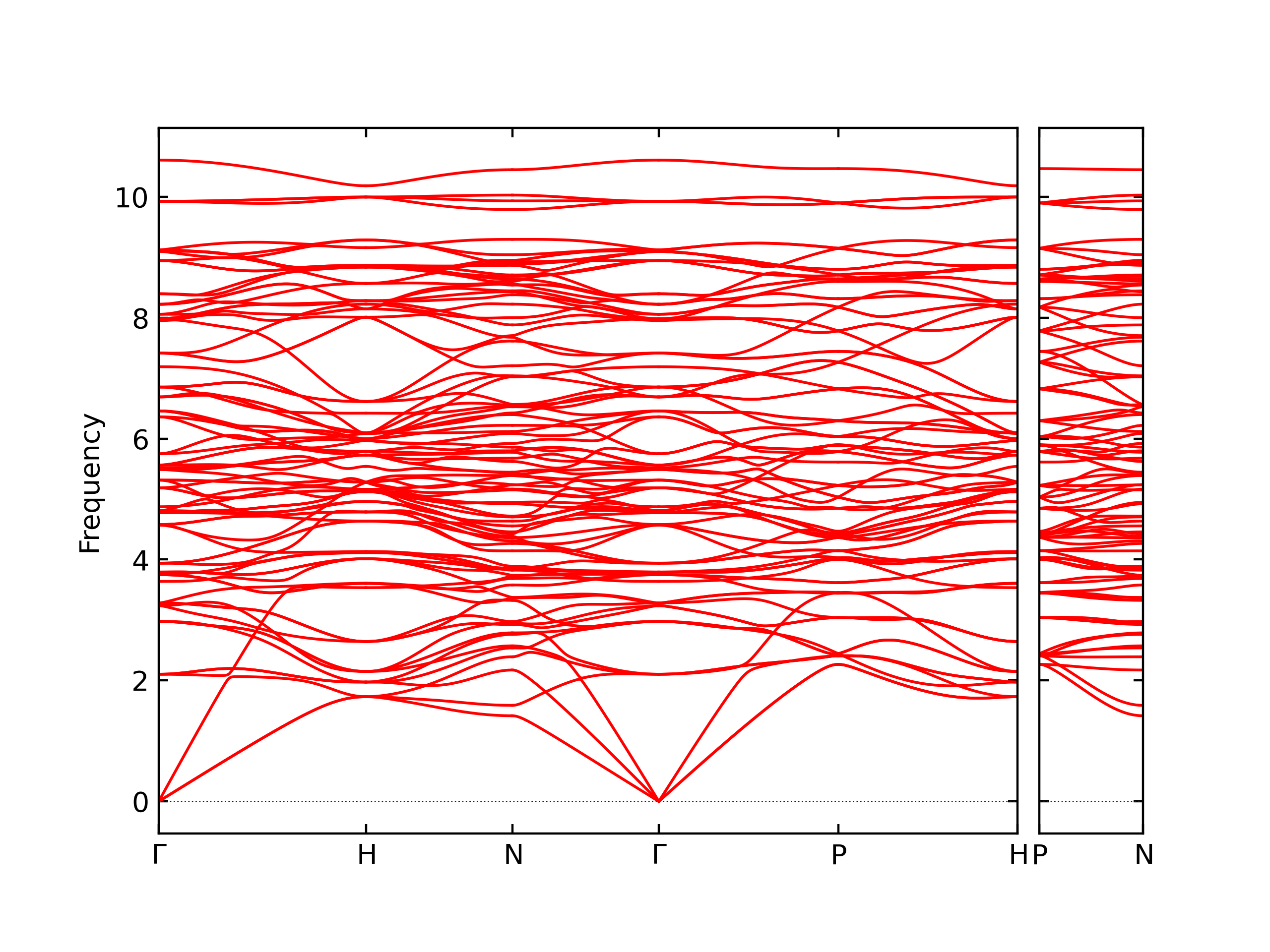 Phonon band structures and crystal properties estimated from quasi-harmonic approximation (QHA) calculations are displayed for select crystals. The calculations were performed using phonopy and LAMMPS. For the phonon calculations, 3x3 supercells of the potential-specific relaxed crystals were used. The QHA calculations were based on 11 strain states ranging from -0.05 to 0.05.