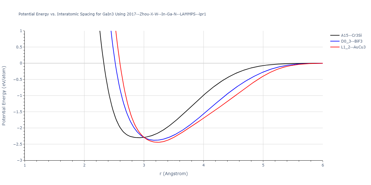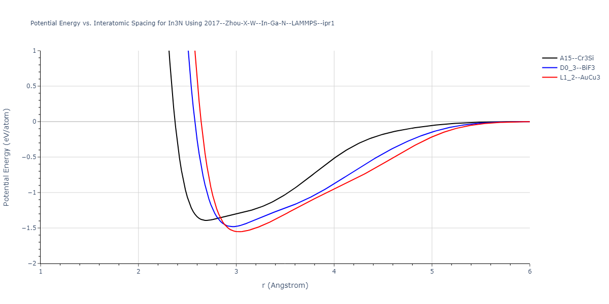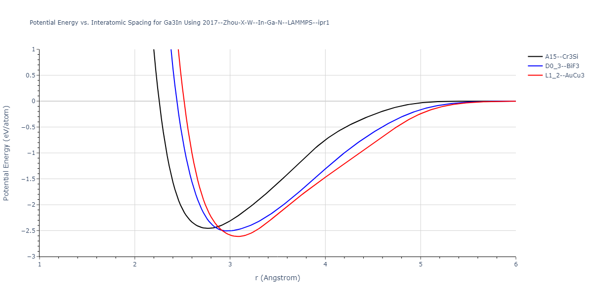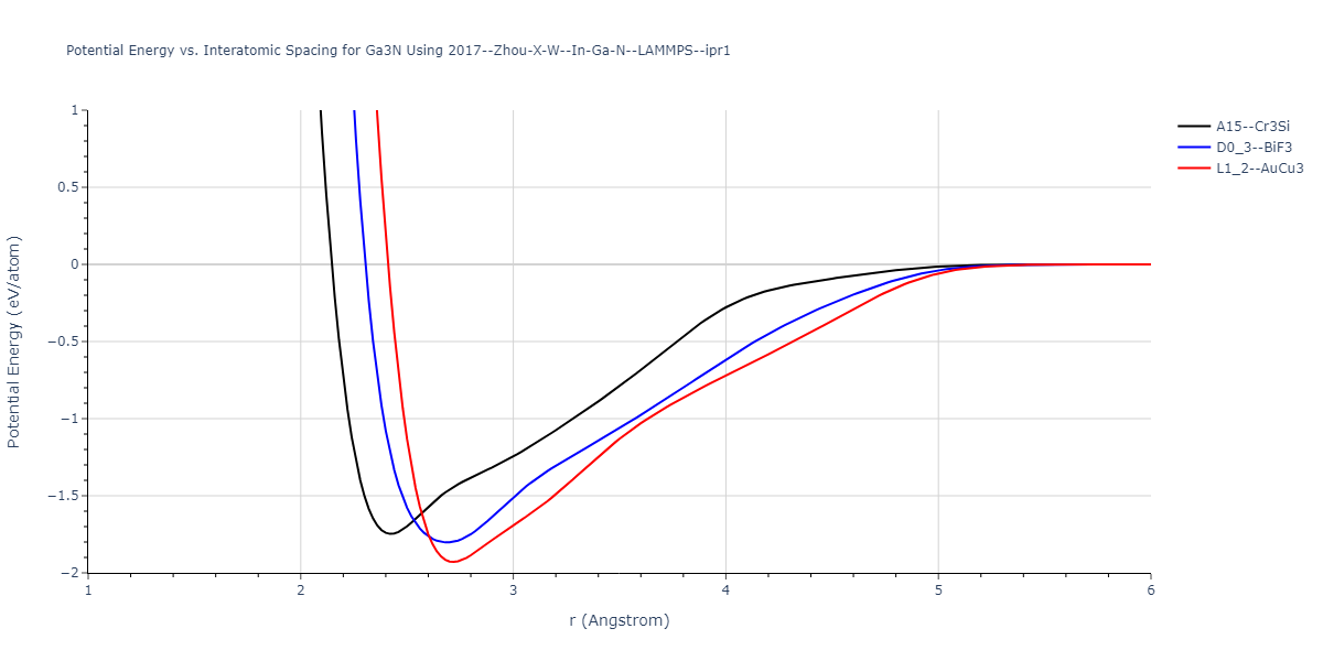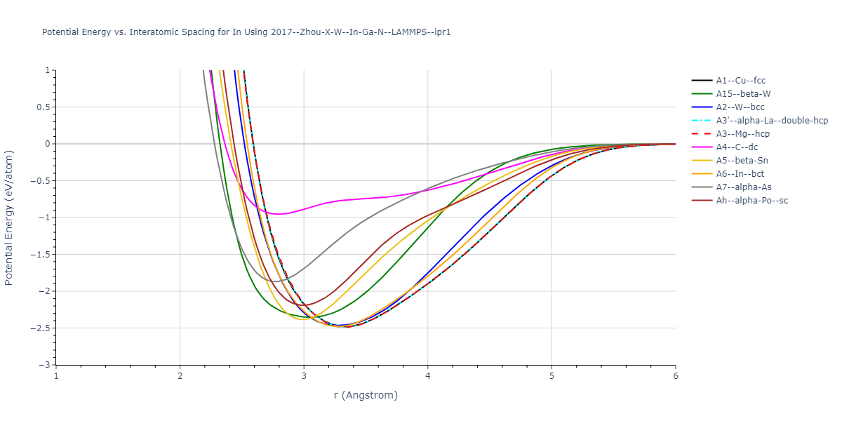 Plots of potential energy vs interatomic spacing, r, are shown below for a number of crystal structures. The structures are generated based on the ideal atomic positions and b/a and c/a lattice parameter ratios for a given crystal prototype. The size of the system is then uniformly scaled, and the energy calculated without relaxing the system. To obtain these plots, values of r are evaluated every 0.02 Å up to 6 Å.