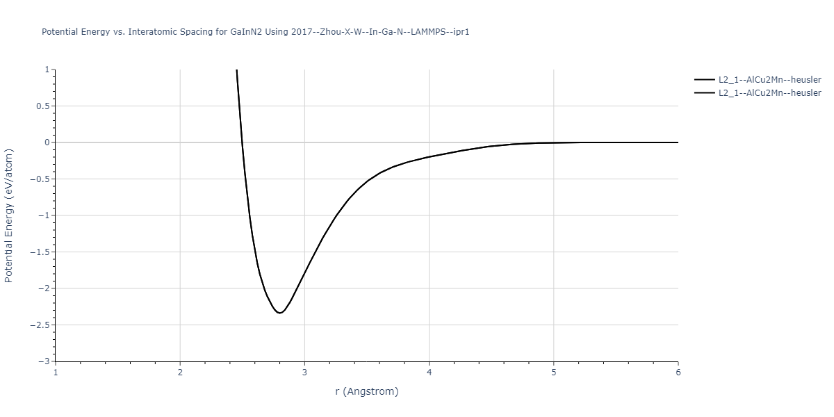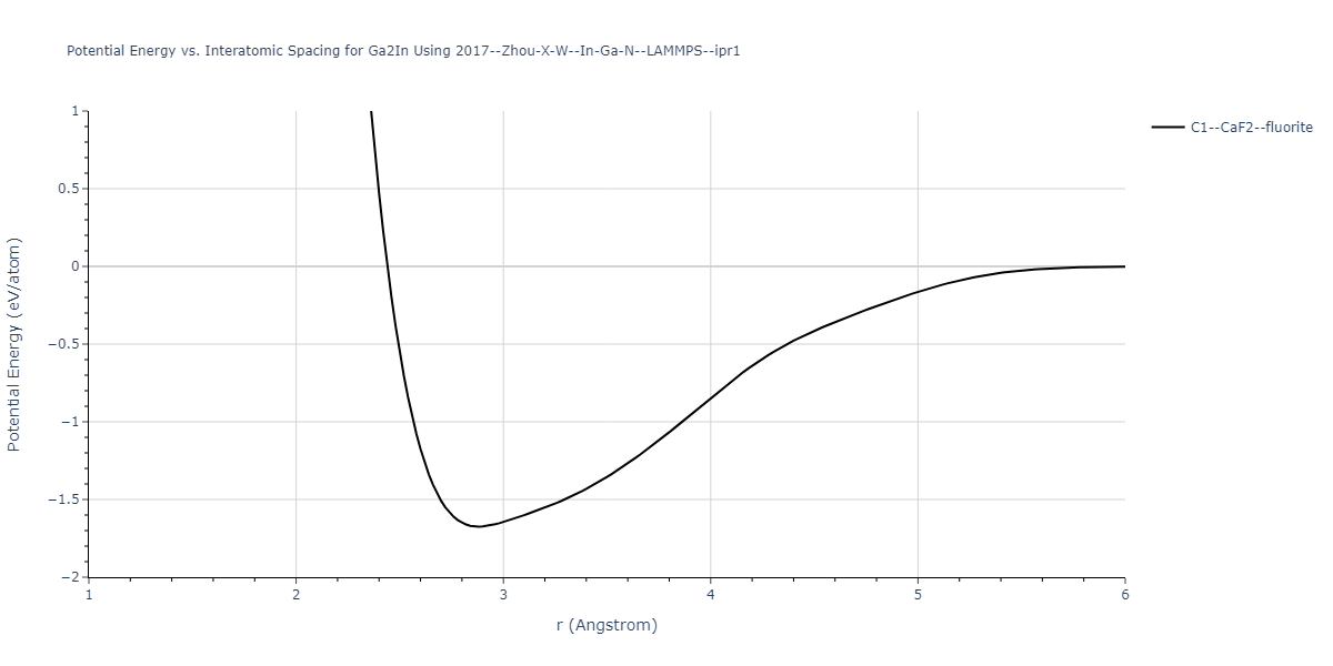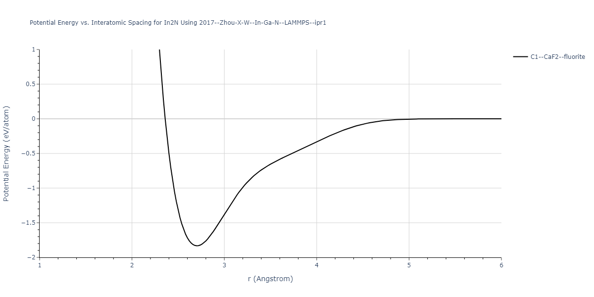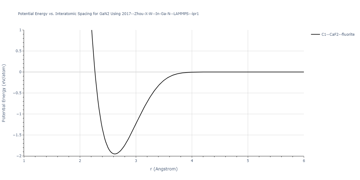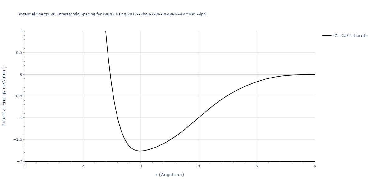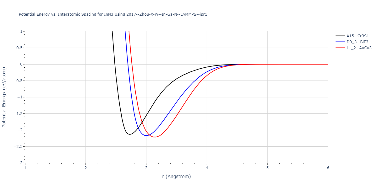Plots of potential energy vs interatomic spacing, r, are shown below for a number of crystal structures. The structures are generated based on the ideal atomic positions and b/a and c/a lattice parameter ratios for a given crystal prototype. The size of the system is then uniformly scaled, and the energy calculated without relaxing the system. To obtain these plots, values of r are evaluated every 0.02 Å up to 6 Å.