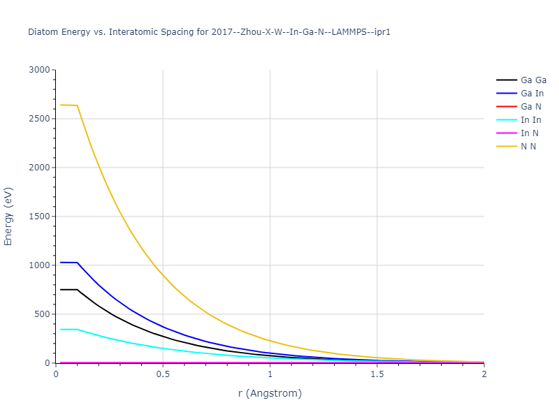 Plots of the potential energy vs interatomic spacing, r, are shown below for all diatom sets associated with the interatomic potential. This calculation provides insights into the functional form of the potential's two-body interactions. A system consisting of only two atoms is created, and the potential energy is evaluated for the atoms separated by 0.02 Å <= r <= 6.0> Å in intervals of 0.02 Å. Two plots are shown: one for the "standard" interaction distance range, and one for small values of r. The small r plot is useful for determining whether the potential is suitable for radiation studies.