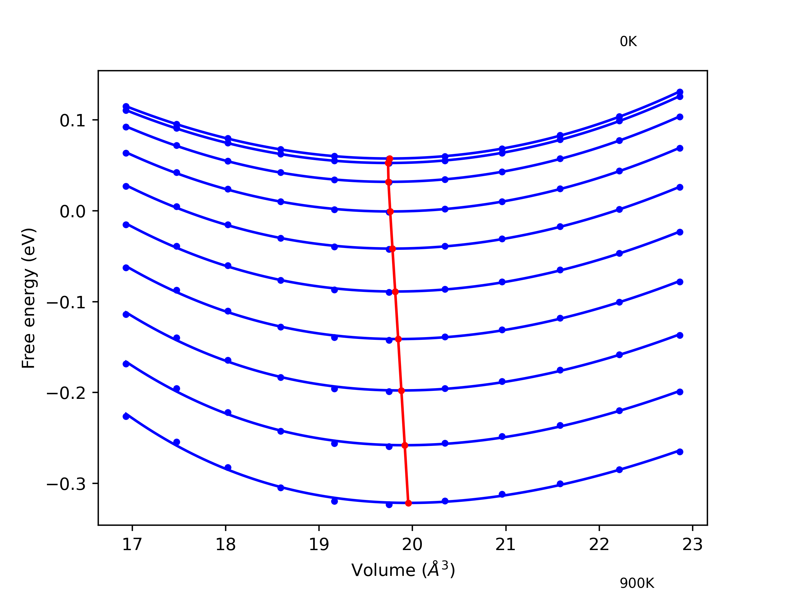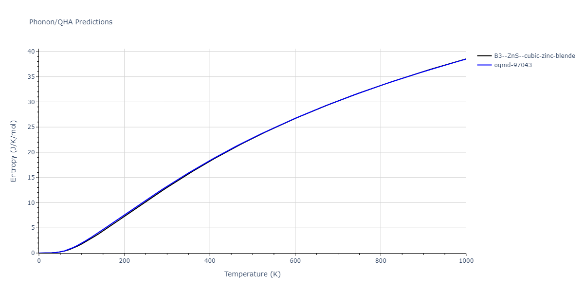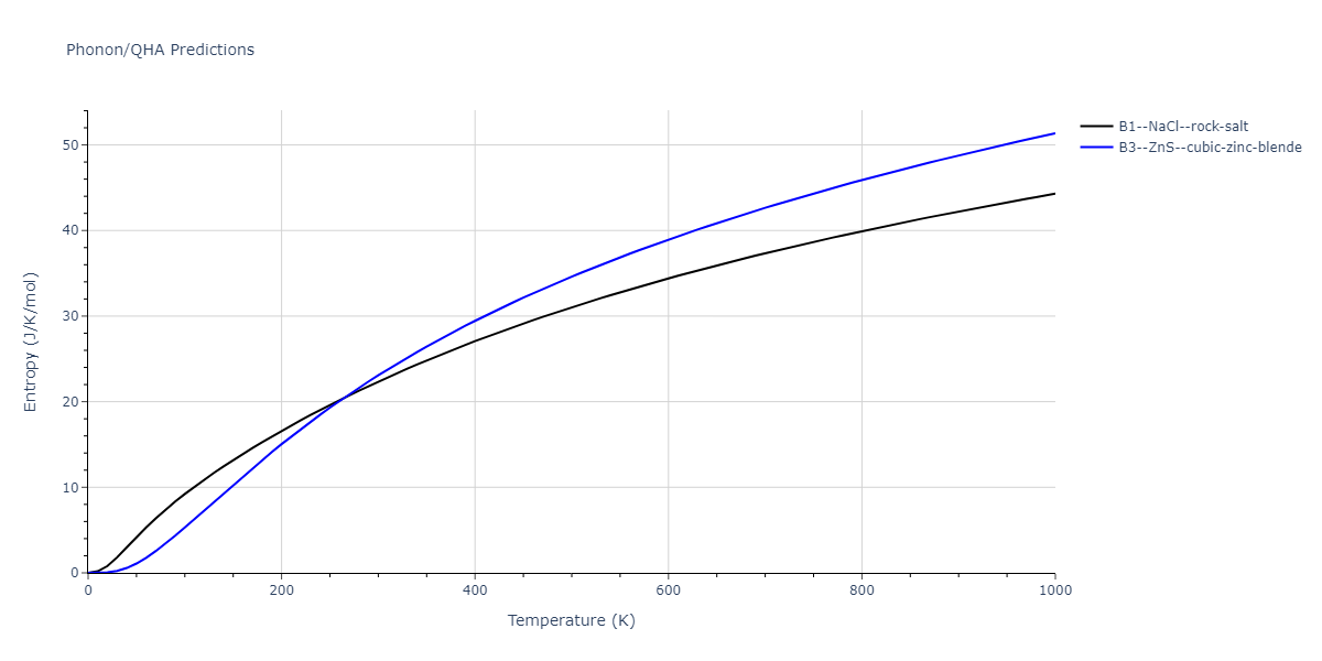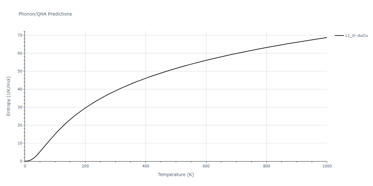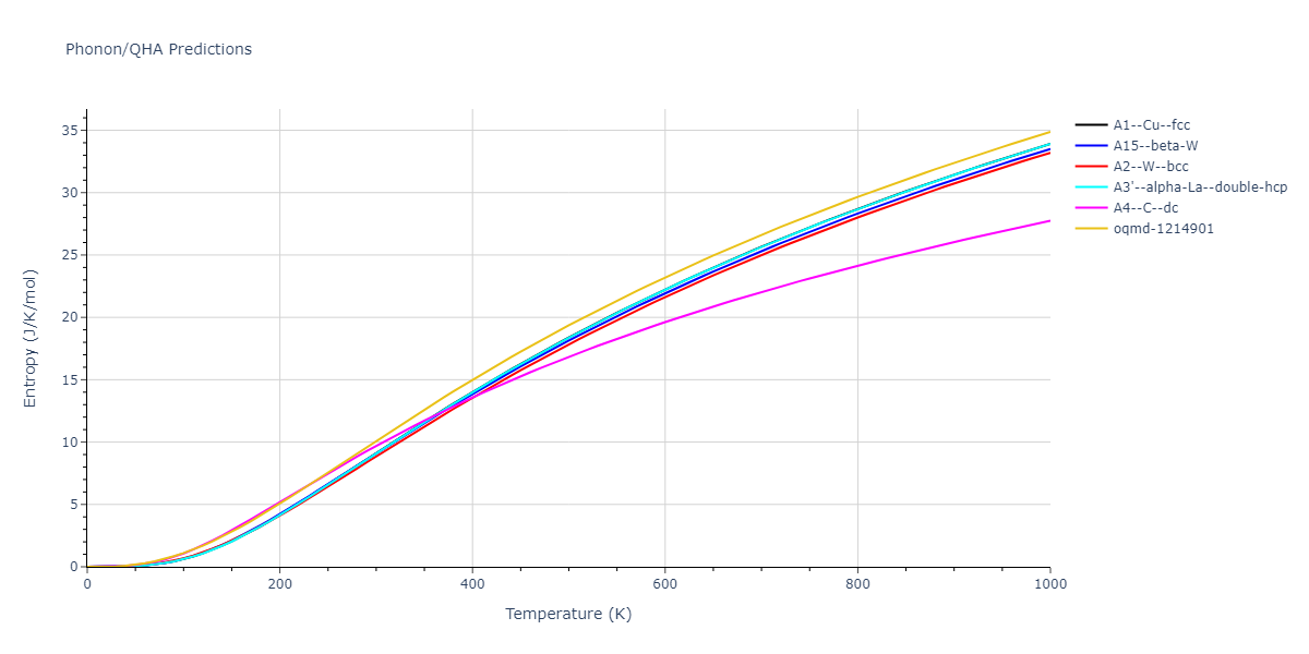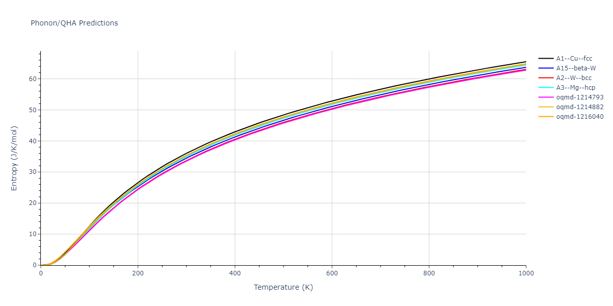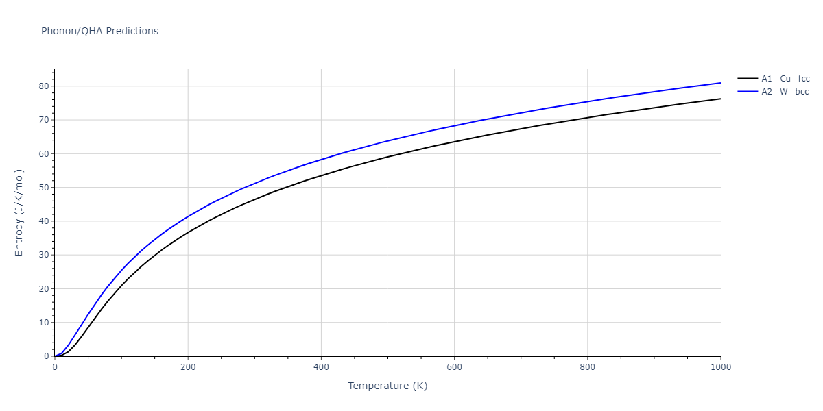The Gibbs energies of the phases are estimated using thermodynamic integration between the interatomic potential in question and a simpler model with known Gibbs free energy values. For solids, the reference model is an Einstein solid, while for liquids it is the Uhlenbeck-Ford potential. Besides a short run at the start of the solid calculations to estimate Einstein model spring constants, the two calculations proceed similarly. Starting with the final relaxation configurations, the systems are stabilized for 25,000 steps. Then, over the next 50,000 steps the potential is swapped out for the reference potential. The system is then stabilized for another 25,000 steps with the reference model before a reverse swap of 50,000 steps is performed. The simulation ends with one final 25,000 step stabilization period. From the simulation, the irreversible work of transformation is estimated and used to compute the absolute Gibbs free energy of the target phase and potential relative to the reference potential. Entropy is estimated as the difference in enthalpy and Gibbs free energy and divided by temperature.