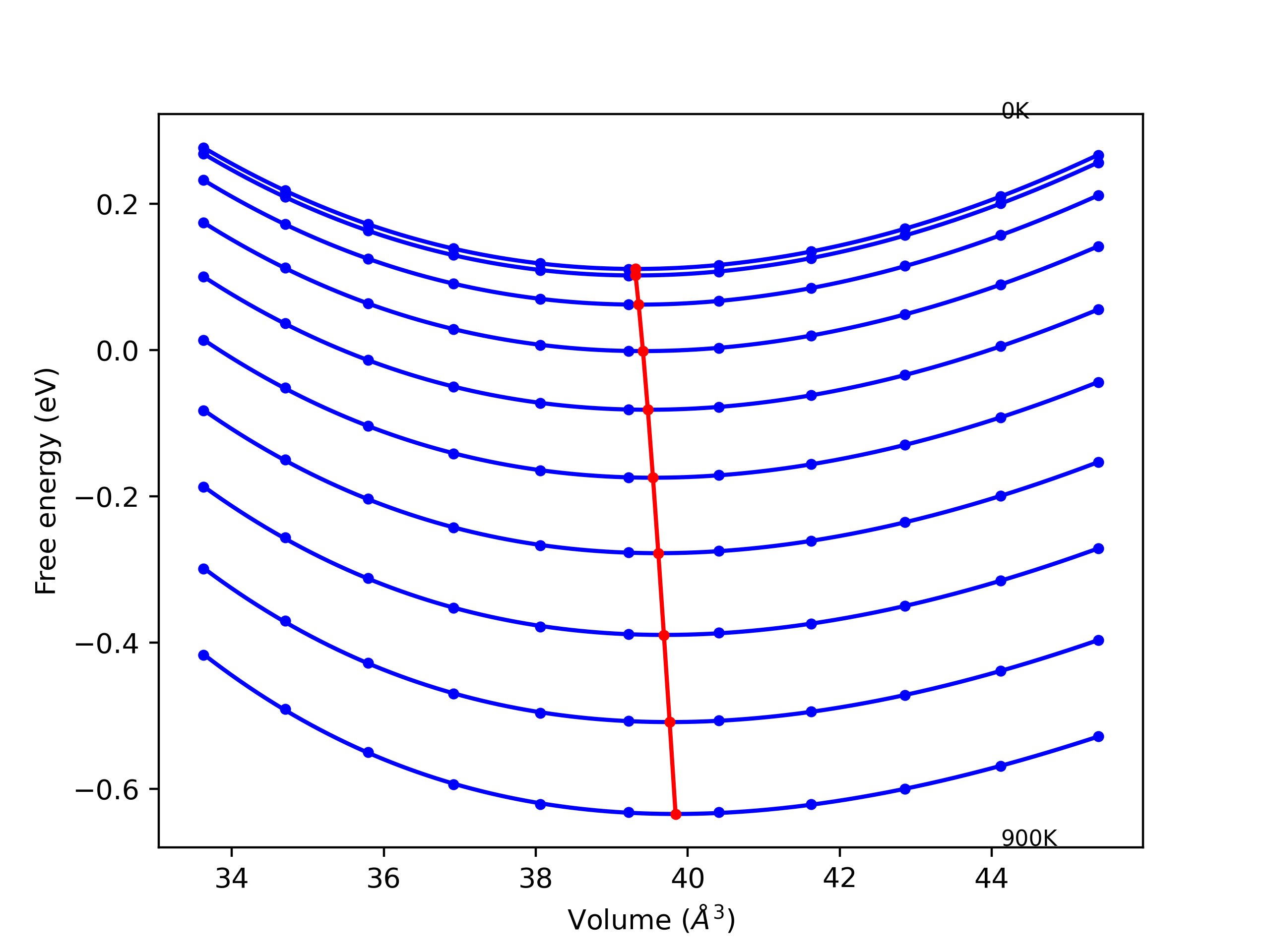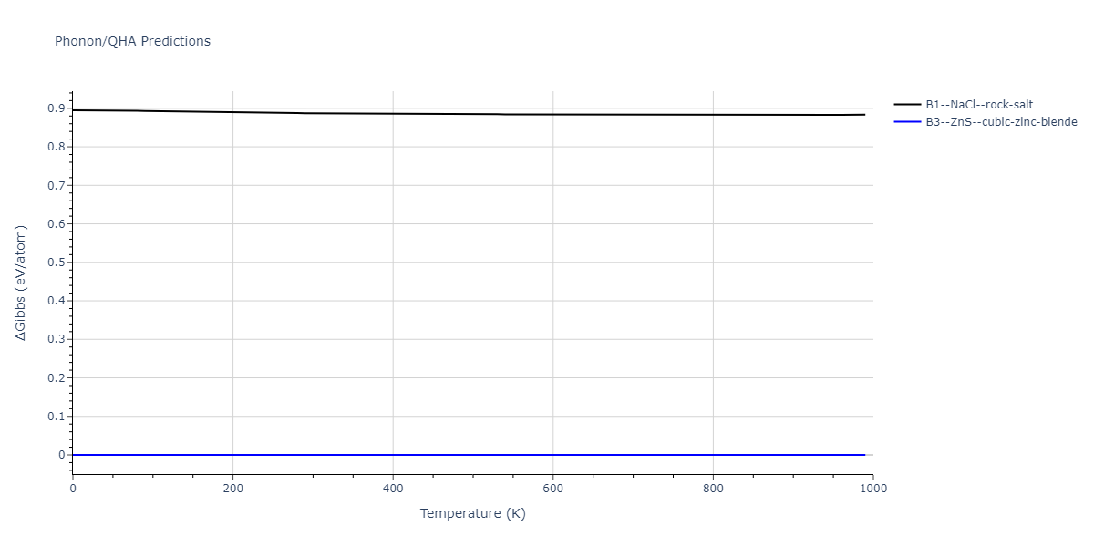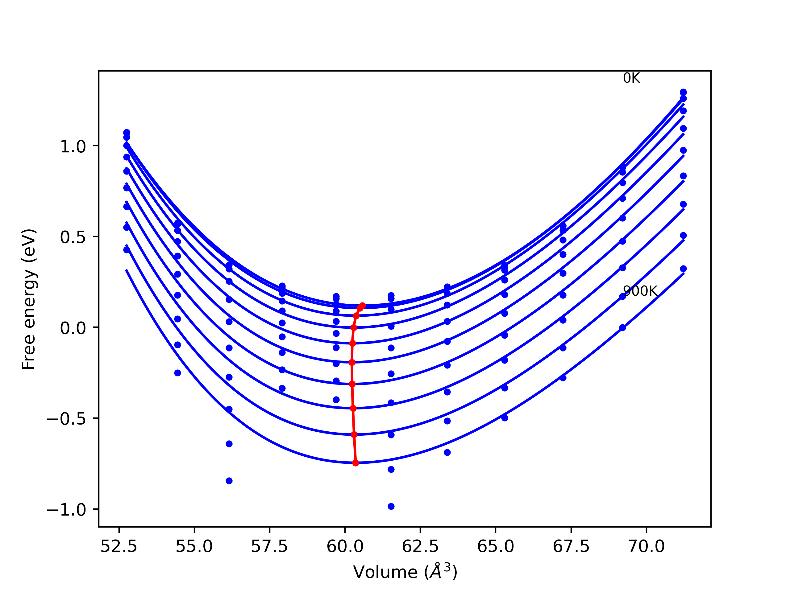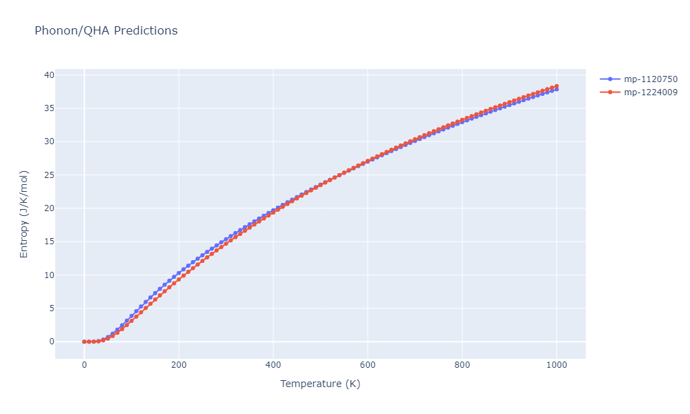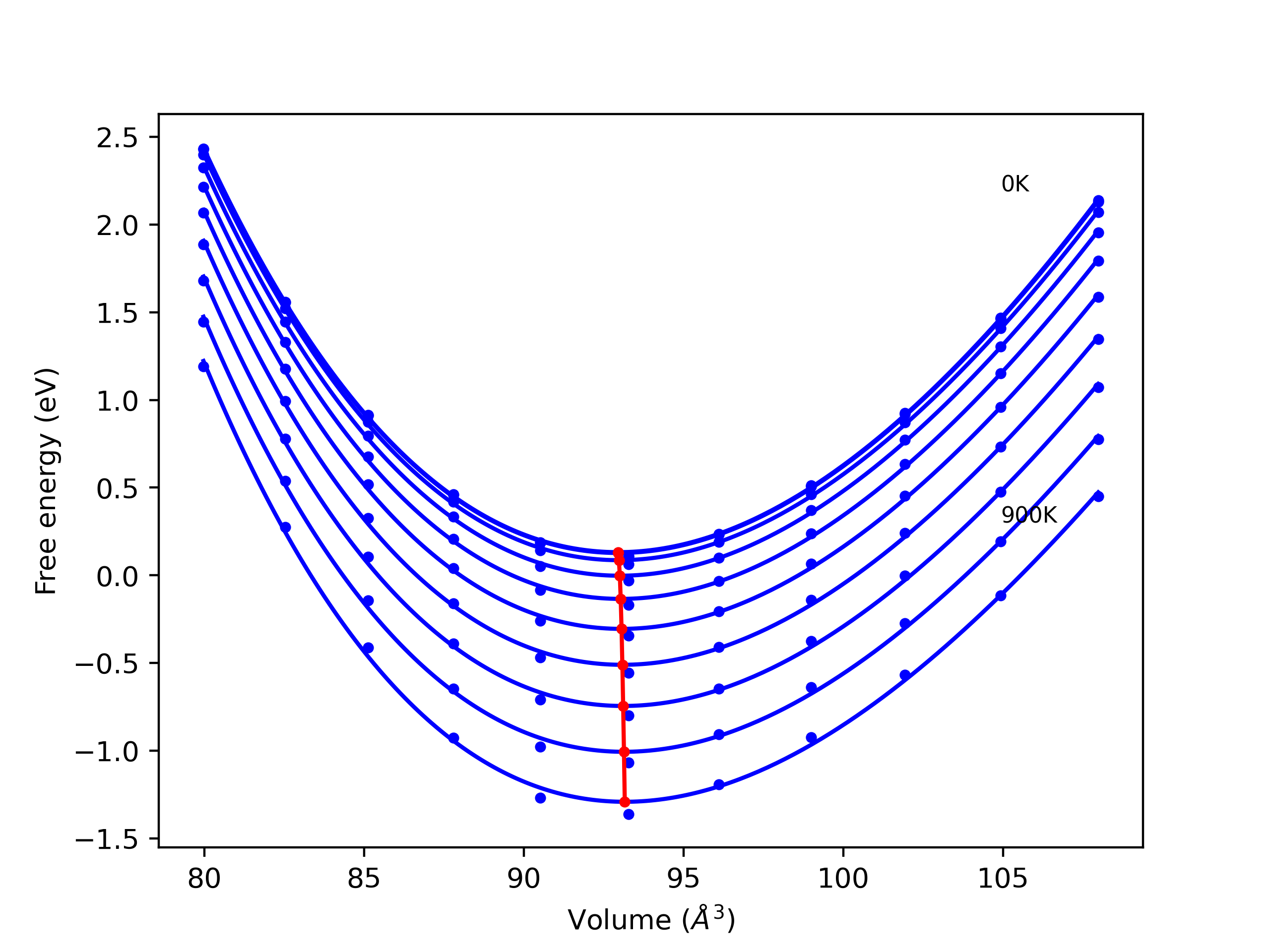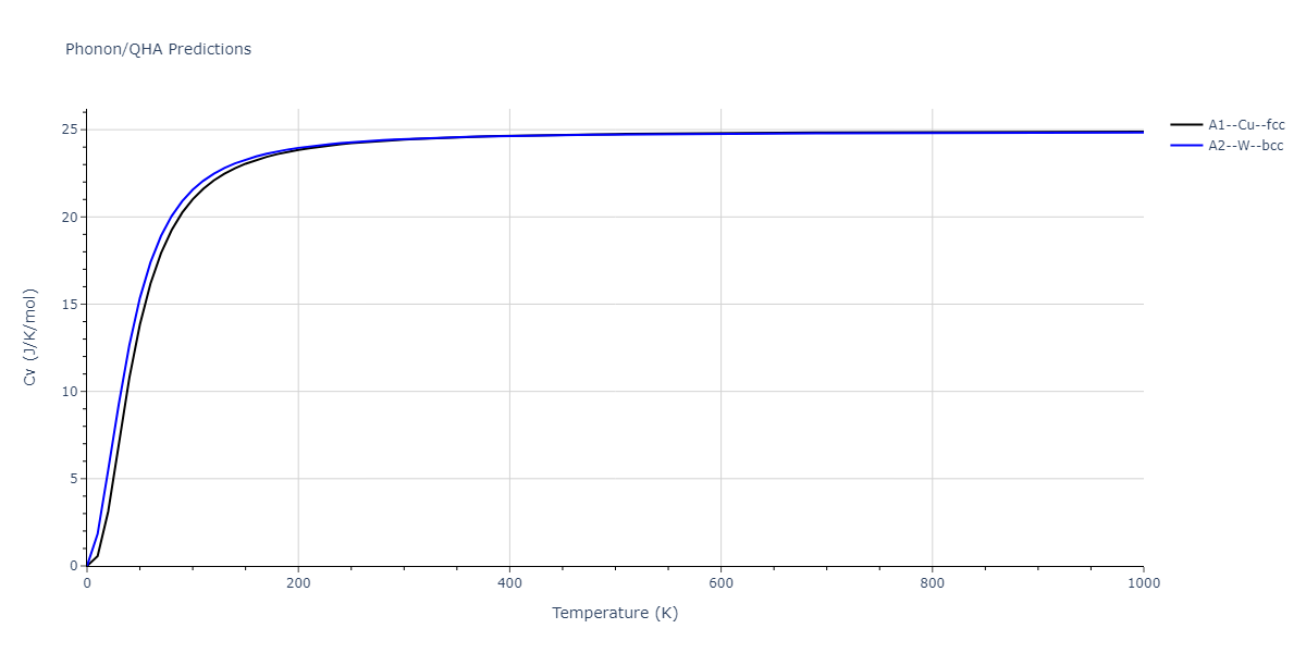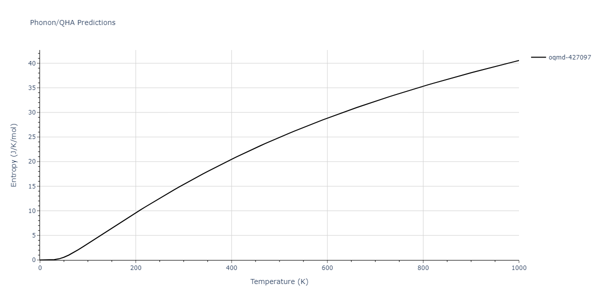 The Gibbs energies of the phases are estimated using thermodynamic integration between the interatomic potential in question and a simpler model with known Gibbs free energy values. For solids, the reference model is an Einstein solid, while for liquids it is the Uhlenbeck-Ford potential. Besides a short run at the start of the solid calculations to estimate Einstein model spring constants, the two calculations proceed similarly. Starting with the final relaxation configurations, the systems are stabilized for 25,000 steps. Then, over the next 50,000 steps the potential is swapped out for the reference potential. The system is then stabilized for another 25,000 steps with the reference model before a reverse swap of 50,000 steps is performed. The simulation ends with one final 25,000 step stabilization period. From the simulation, the irreversible work of transformation is estimated and used to compute the absolute Gibbs free energy of the target phase and potential relative to the reference potential. Entropy is estimated as the difference in enthalpy and Gibbs free energy and divided by temperature.