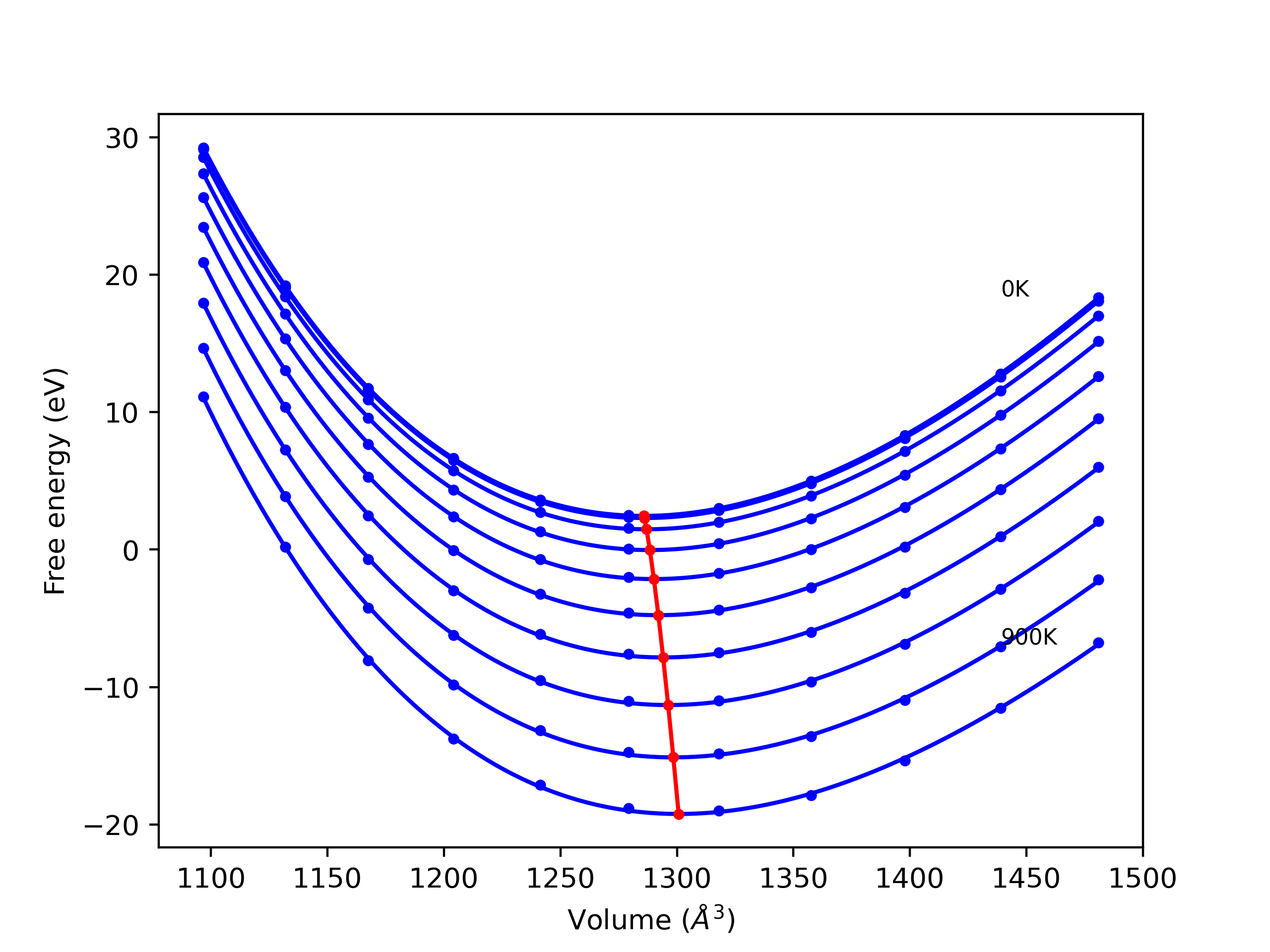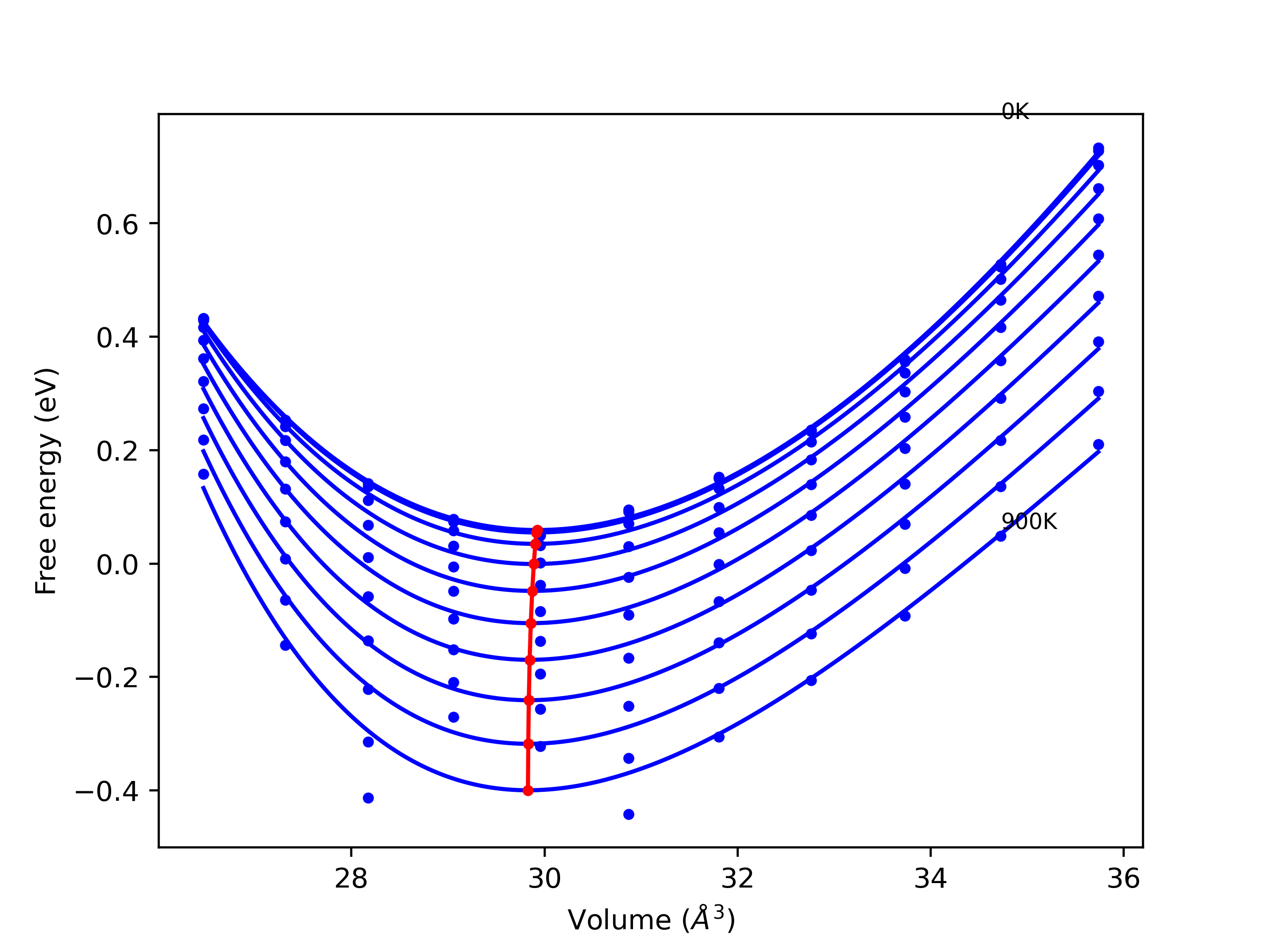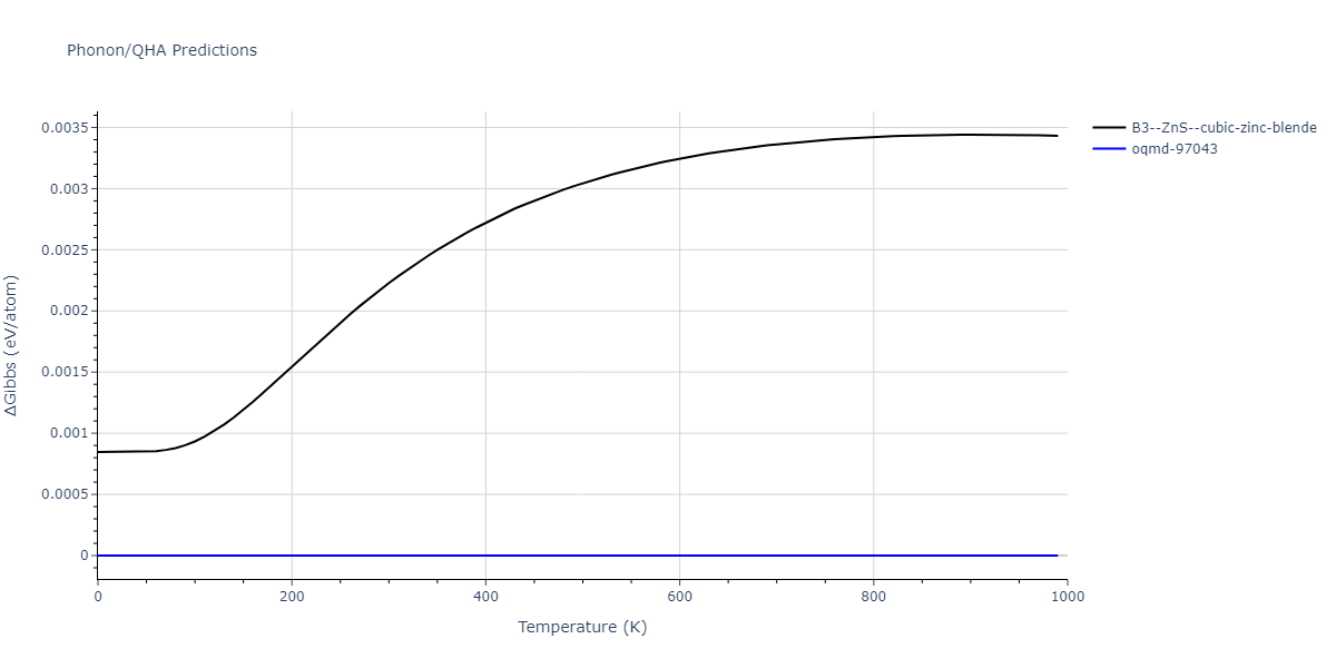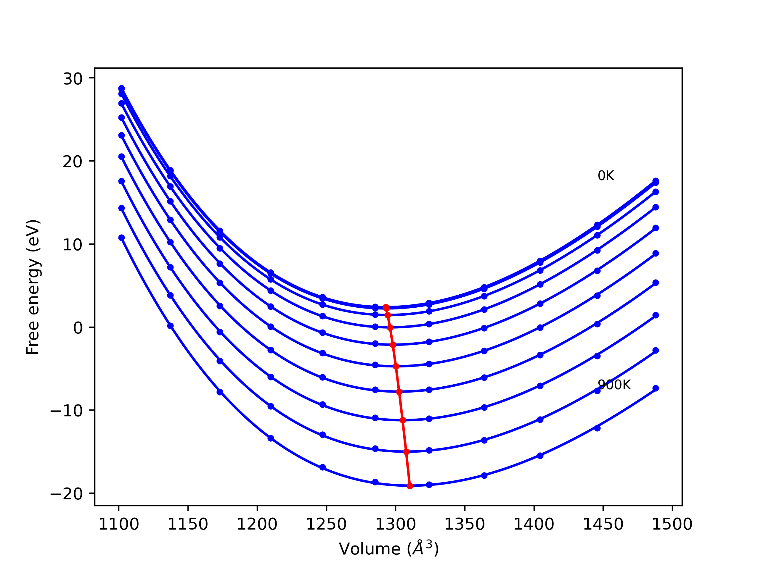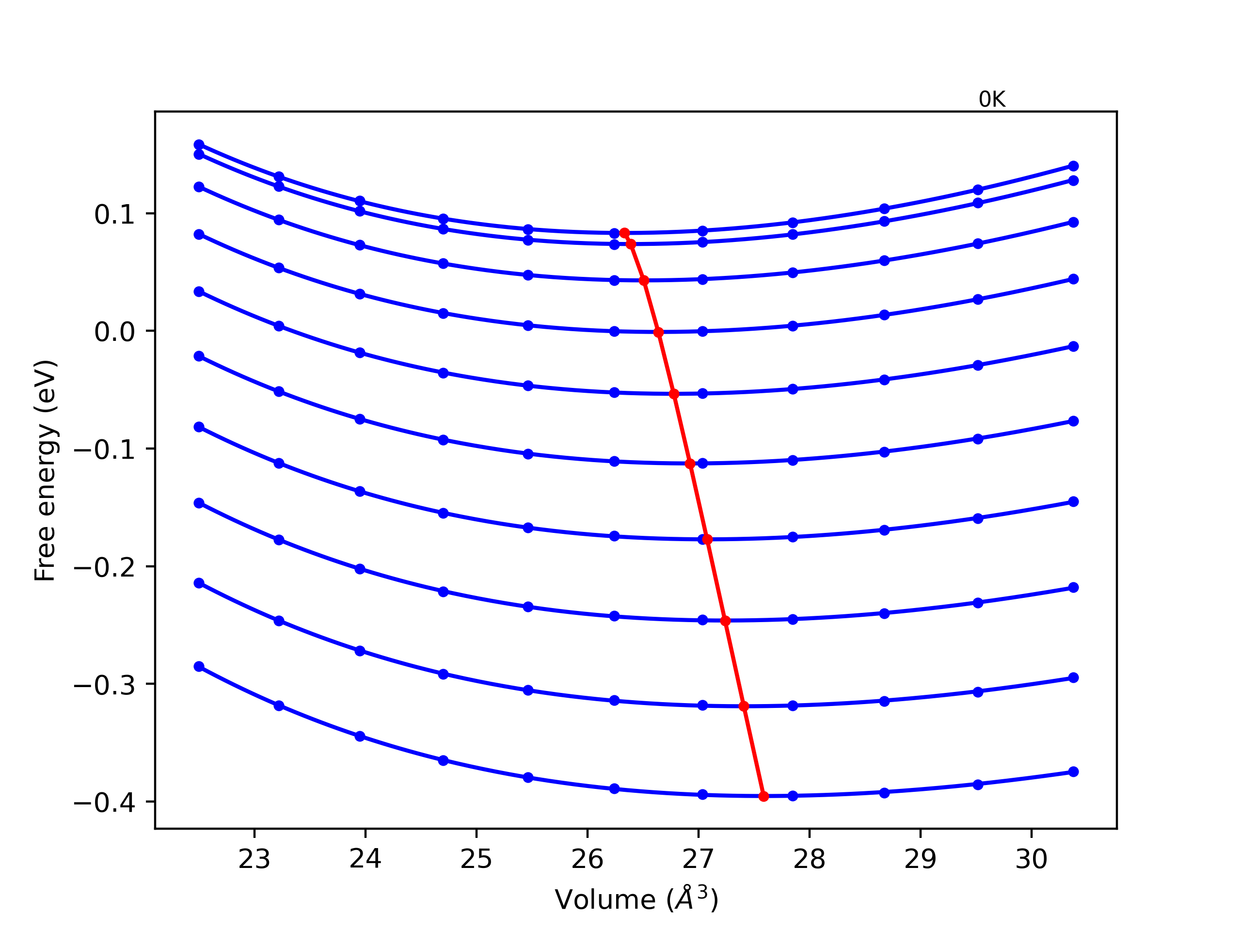 The Gibbs energies of the phases are estimated using thermodynamic integration between the interatomic potential in question and a simpler model with known Gibbs free energy values. For solids, the reference model is an Einstein solid, while for liquids it is the Uhlenbeck-Ford potential. Besides a short run at the start of the solid calculations to estimate Einstein model spring constants, the two calculations proceed similarly. Starting with the final relaxation configurations, the systems are stabilized for 25,000 steps. Then, over the next 50,000 steps the potential is swapped out for the reference potential. The system is then stabilized for another 25,000 steps with the reference model before a reverse swap of 50,000 steps is performed. The simulation ends with one final 25,000 step stabilization period. From the simulation, the irreversible work of transformation is estimated and used to compute the absolute Gibbs free energy of the target phase and potential relative to the reference potential. Entropy is estimated as the difference in enthalpy and Gibbs free energy and divided by temperature.