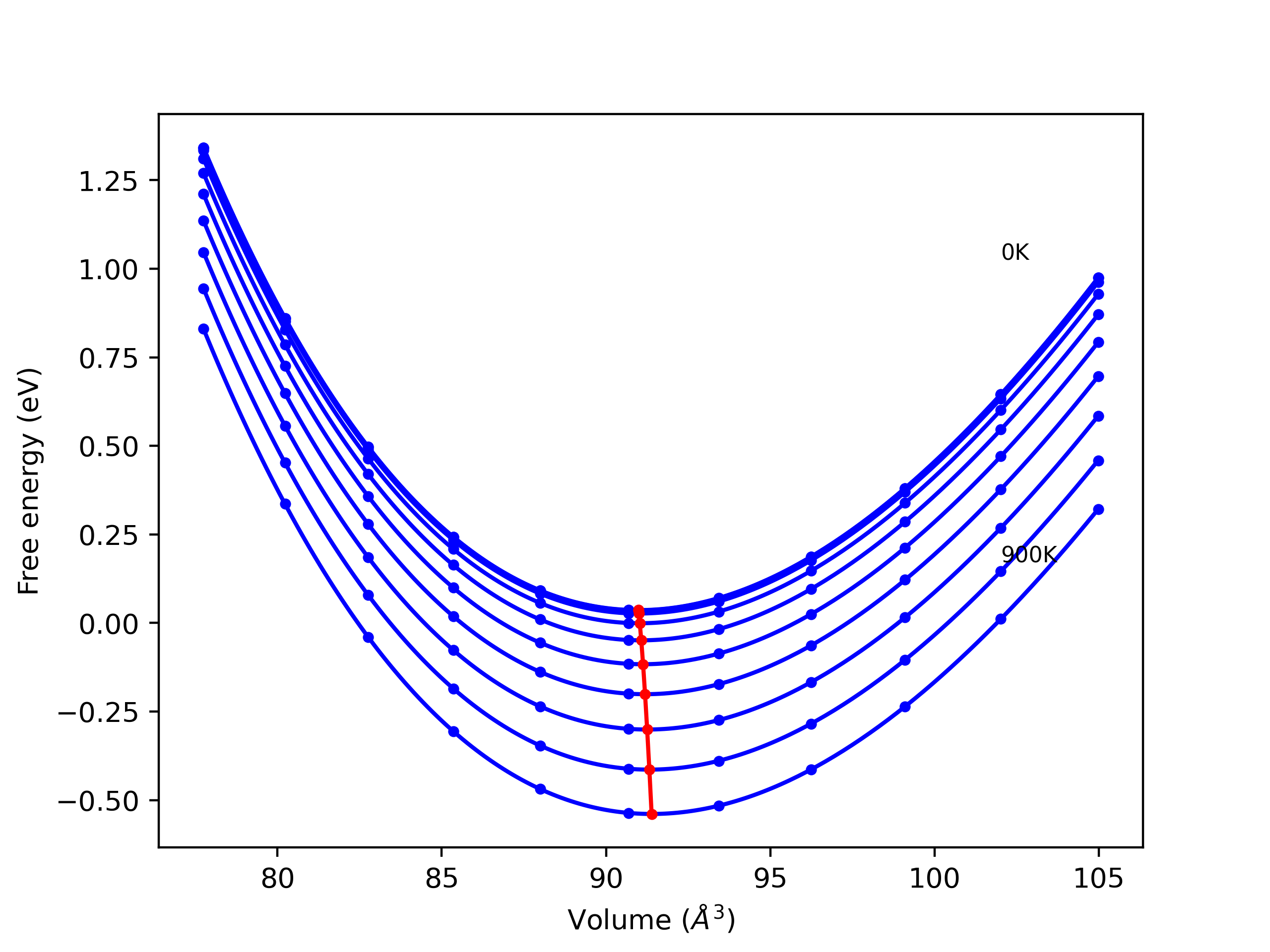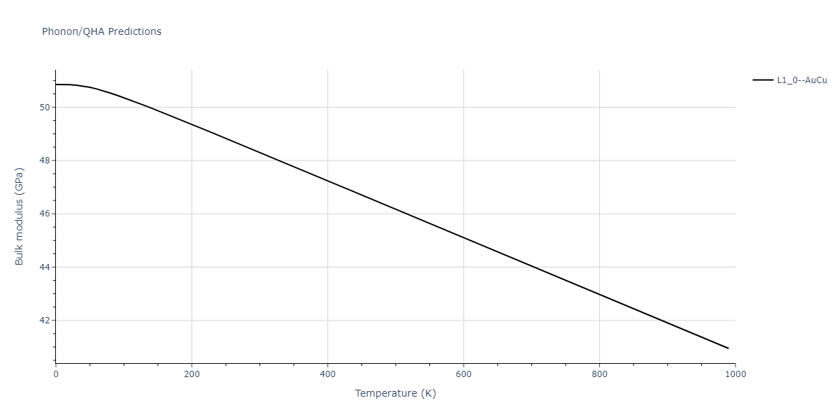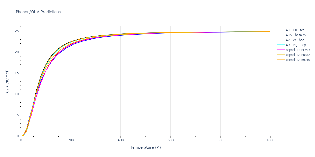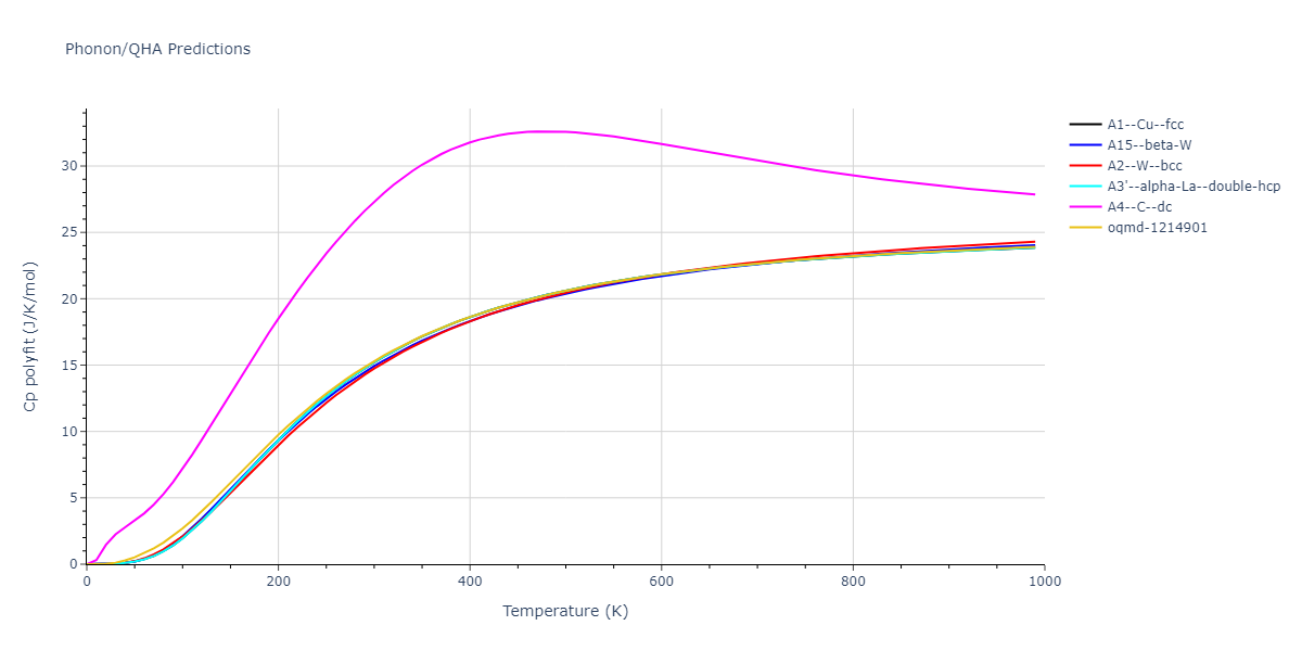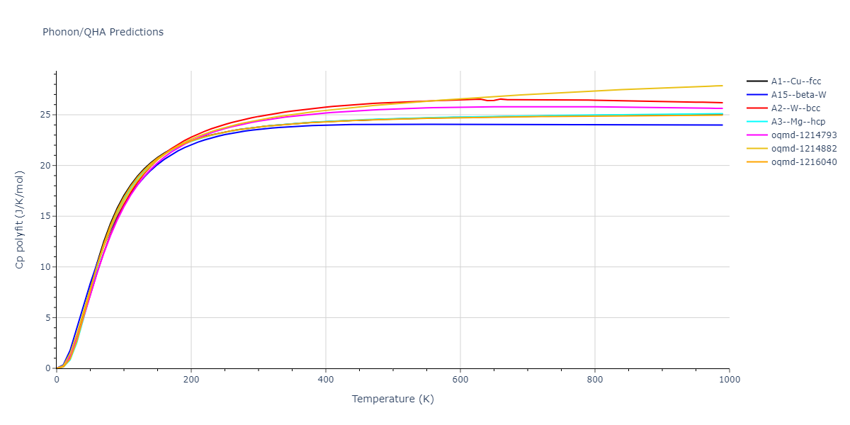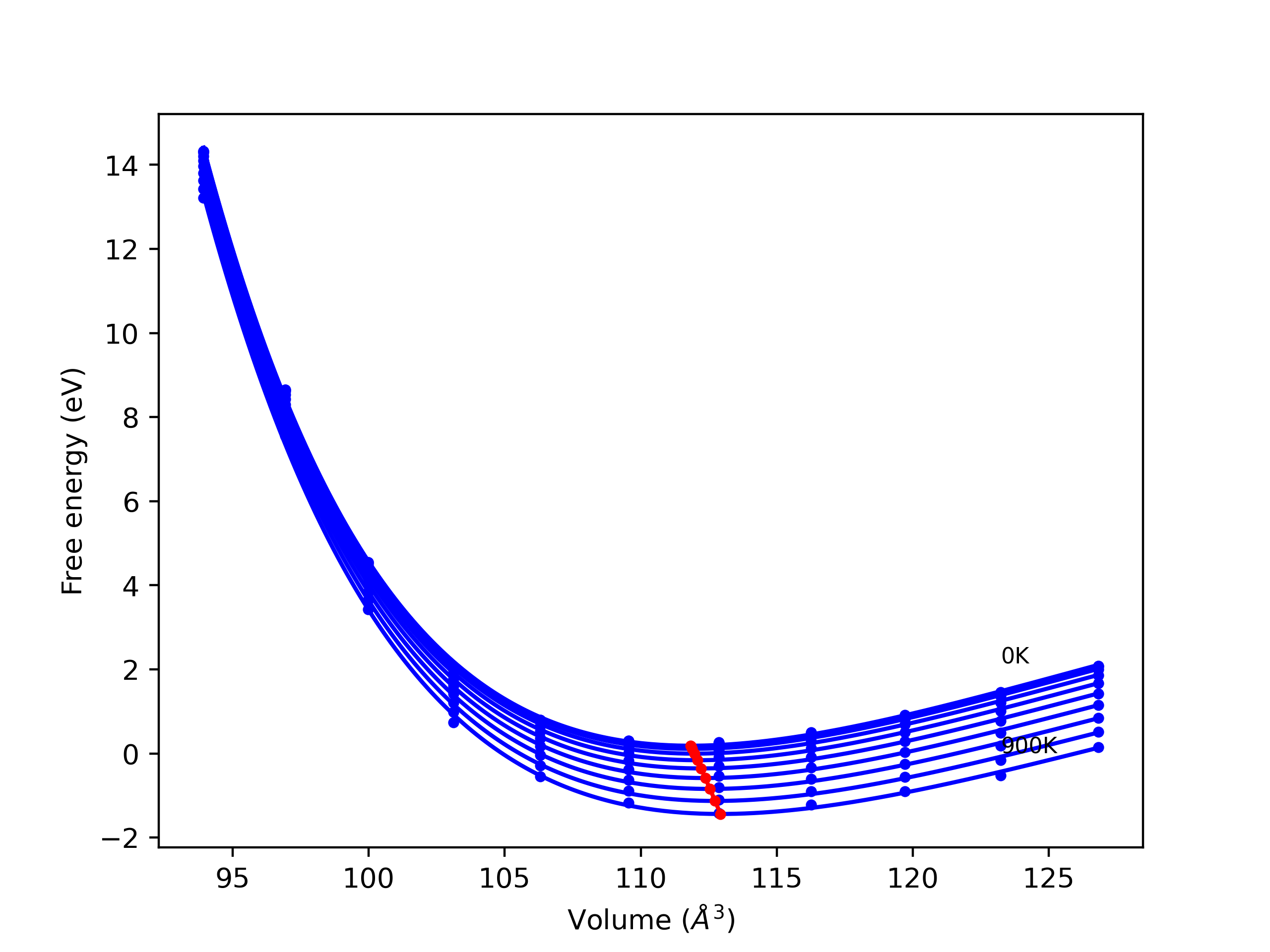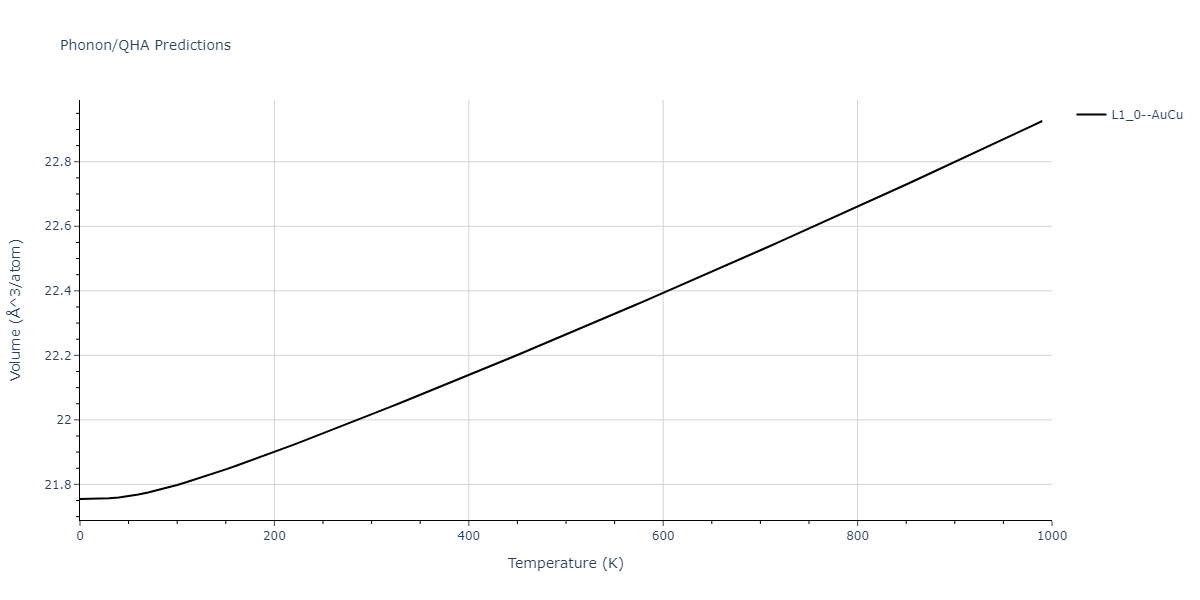 Plots of internal energy, Gibbs free energy, entropy, heat capacity and volume are shown here as a function of temperature for various crystal structures and liquid phases. The included crystal structures correspond to those in the Solid Structures vs. Temperature section, and the liquid phases to those in the Liquid Properties section. Internal energy and volume are taken from the associated structure relaxations mentioned in those previous sections. Constant pressure heat capacity is estimated using 3-point numerical derivatives of enthalpy versus temperature. Note that since all simulations done here are at 0 pressure, internal energy and enthalpy are equivalent.