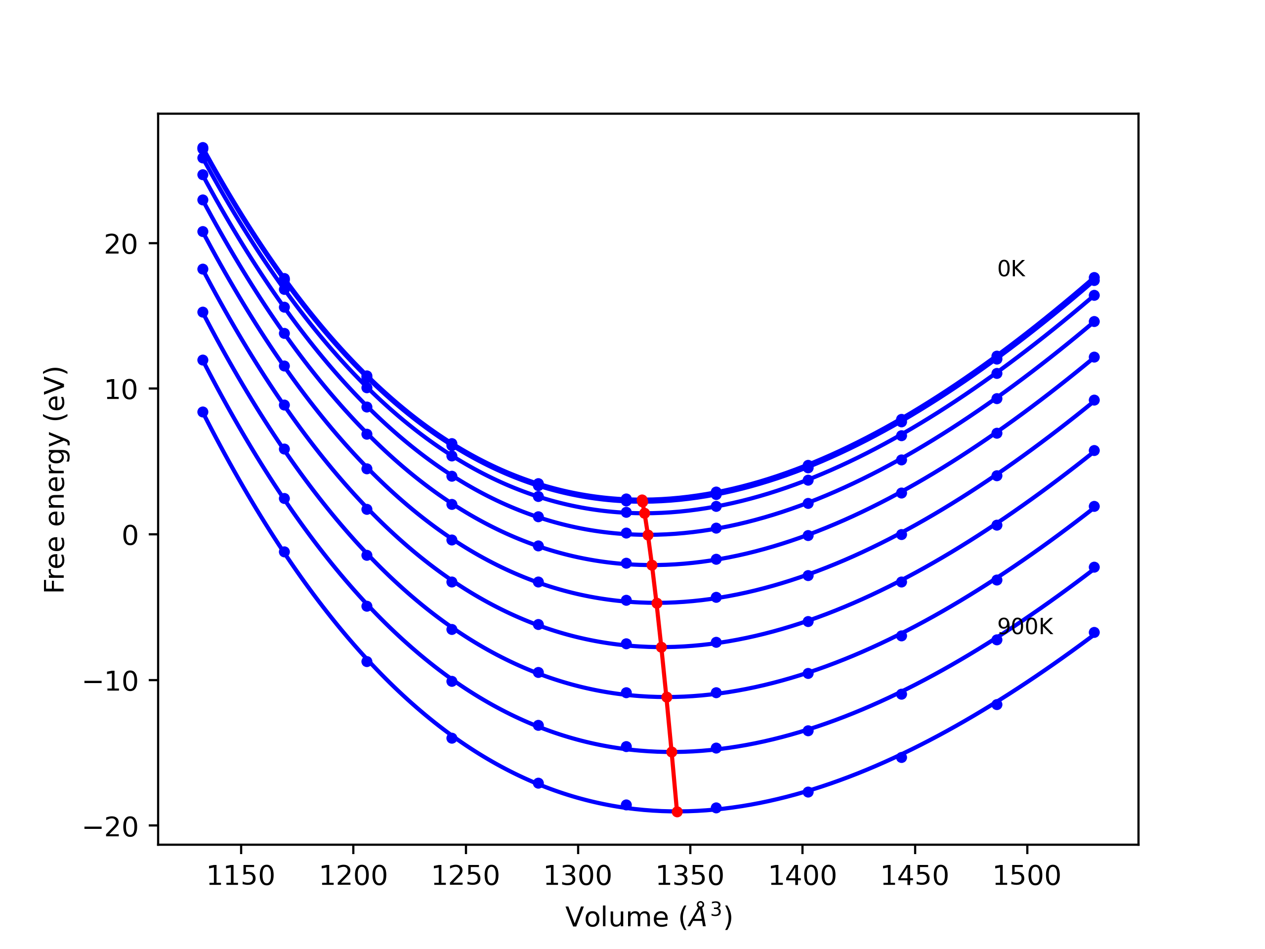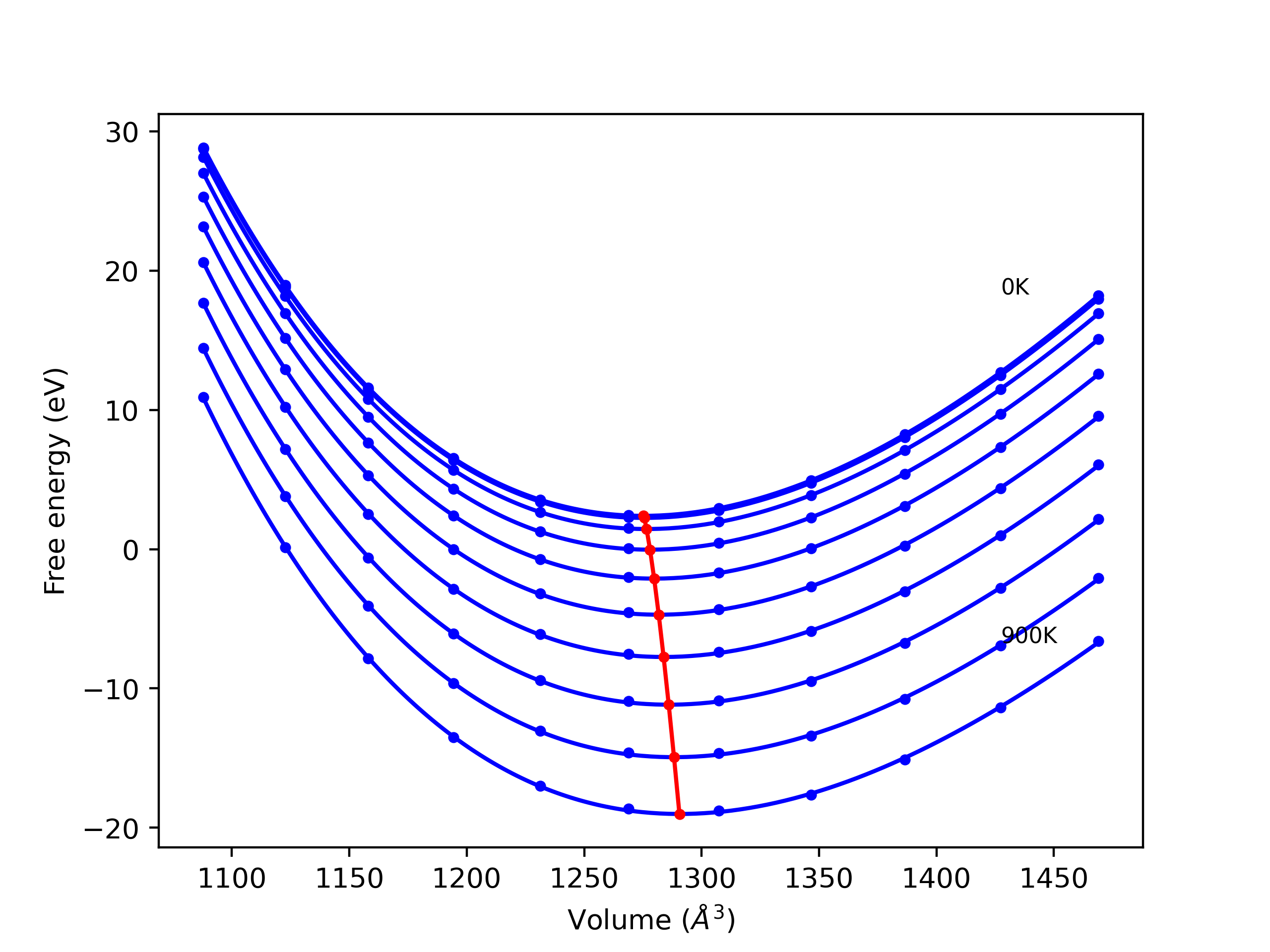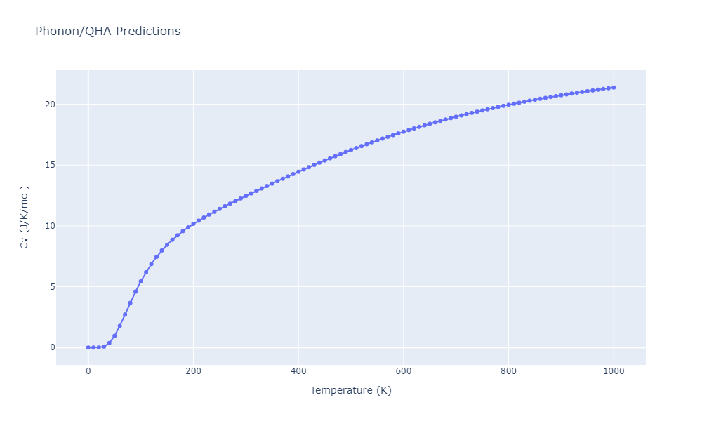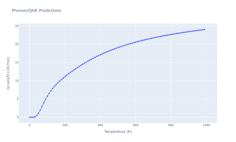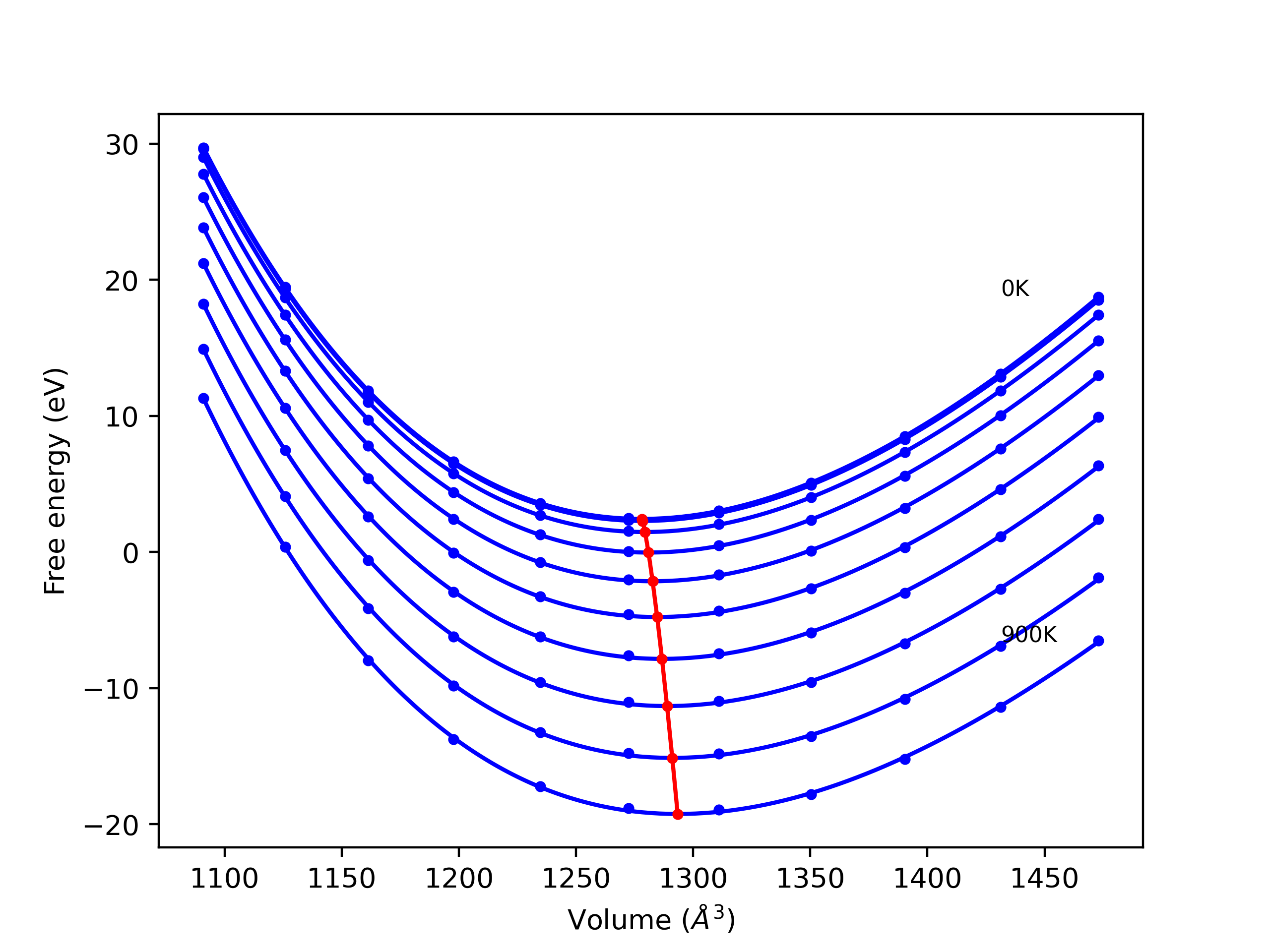 Plots of internal energy, Gibbs free energy, entropy, heat capacity and volume are shown here as a function of temperature for various crystal structures and liquid phases. The included crystal structures correspond to those in the Solid Structures vs. Temperature section, and the liquid phases to those in the Liquid Properties section. Internal energy and volume are taken from the associated structure relaxations mentioned in those previous sections. Constant pressure heat capacity is estimated using 3-point numerical derivatives of enthalpy versus temperature. Note that since all simulations done here are at 0 pressure, internal energy and enthalpy are equivalent.