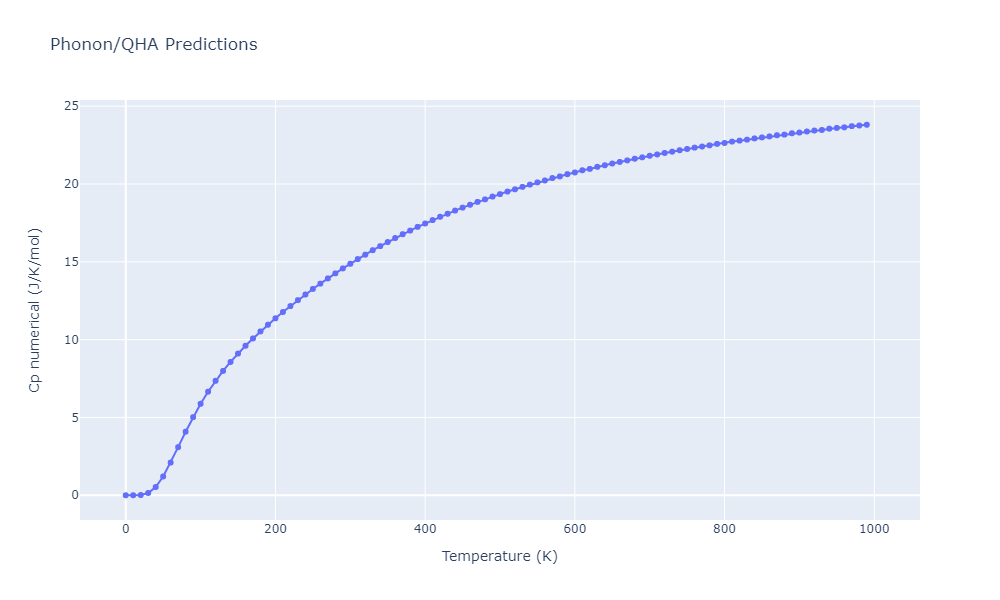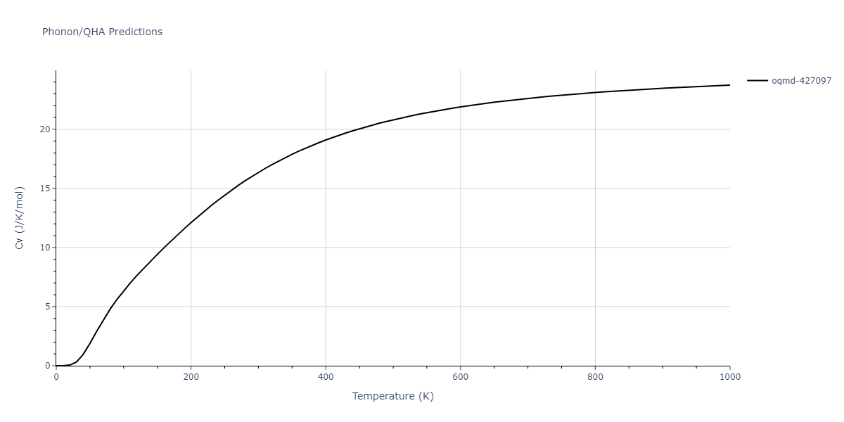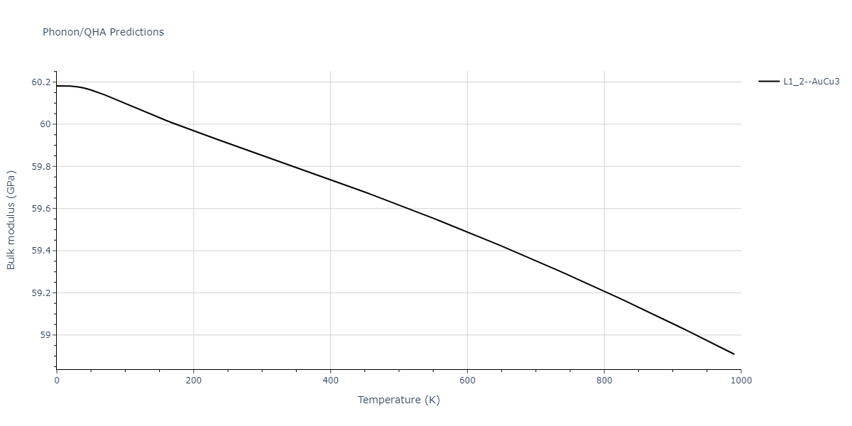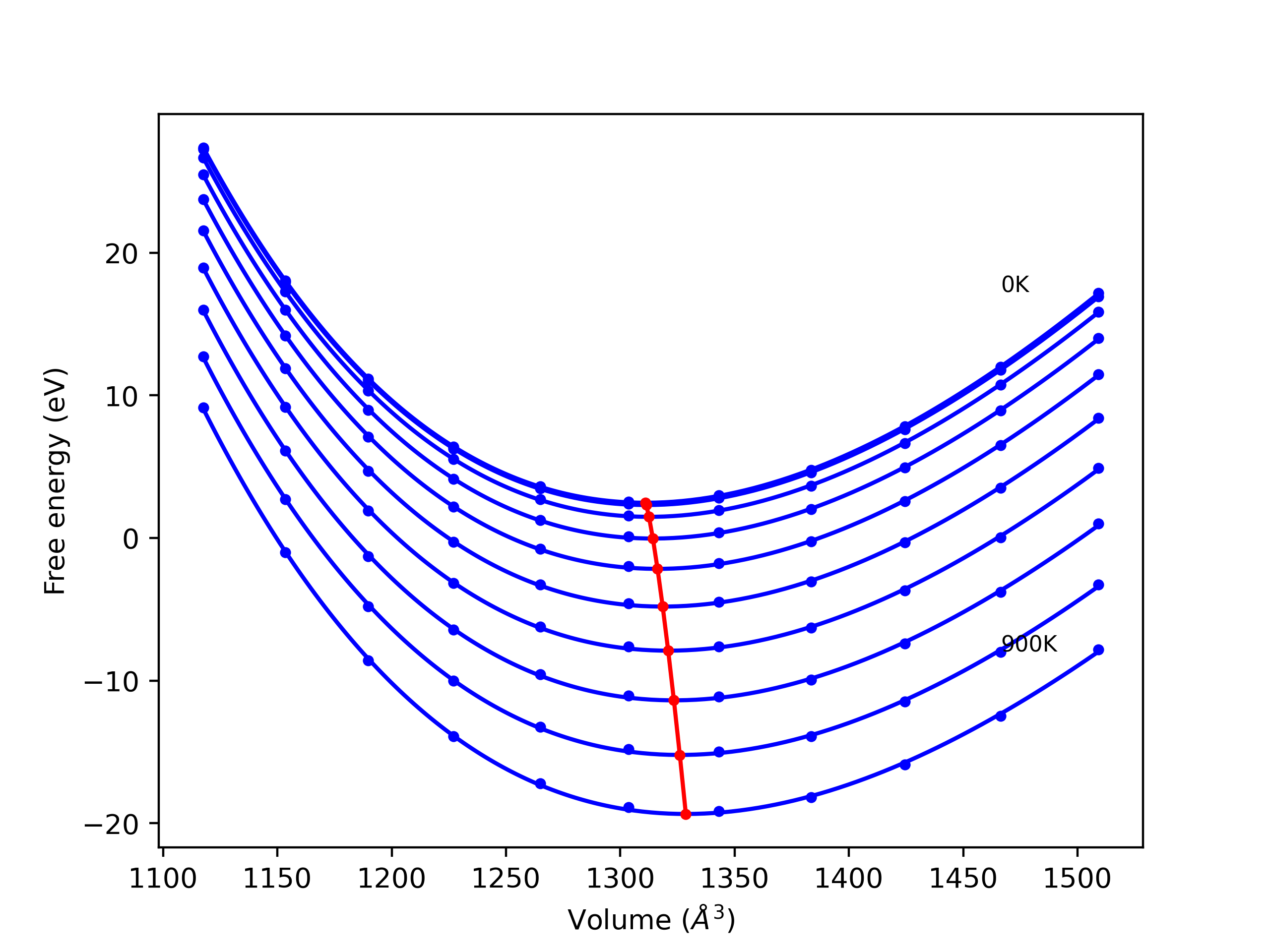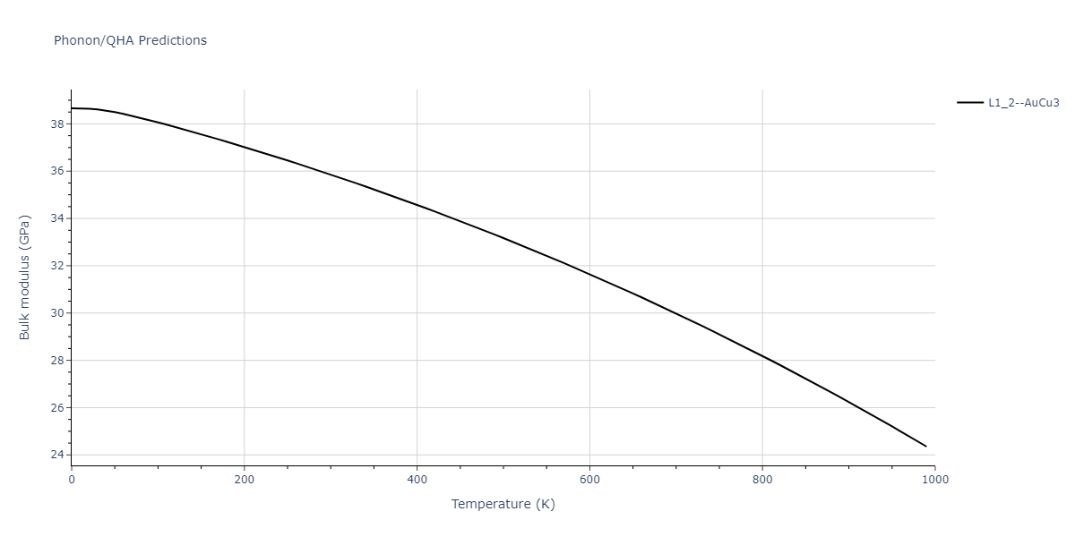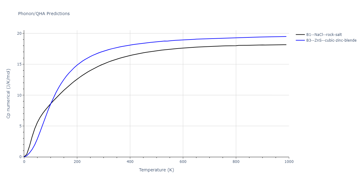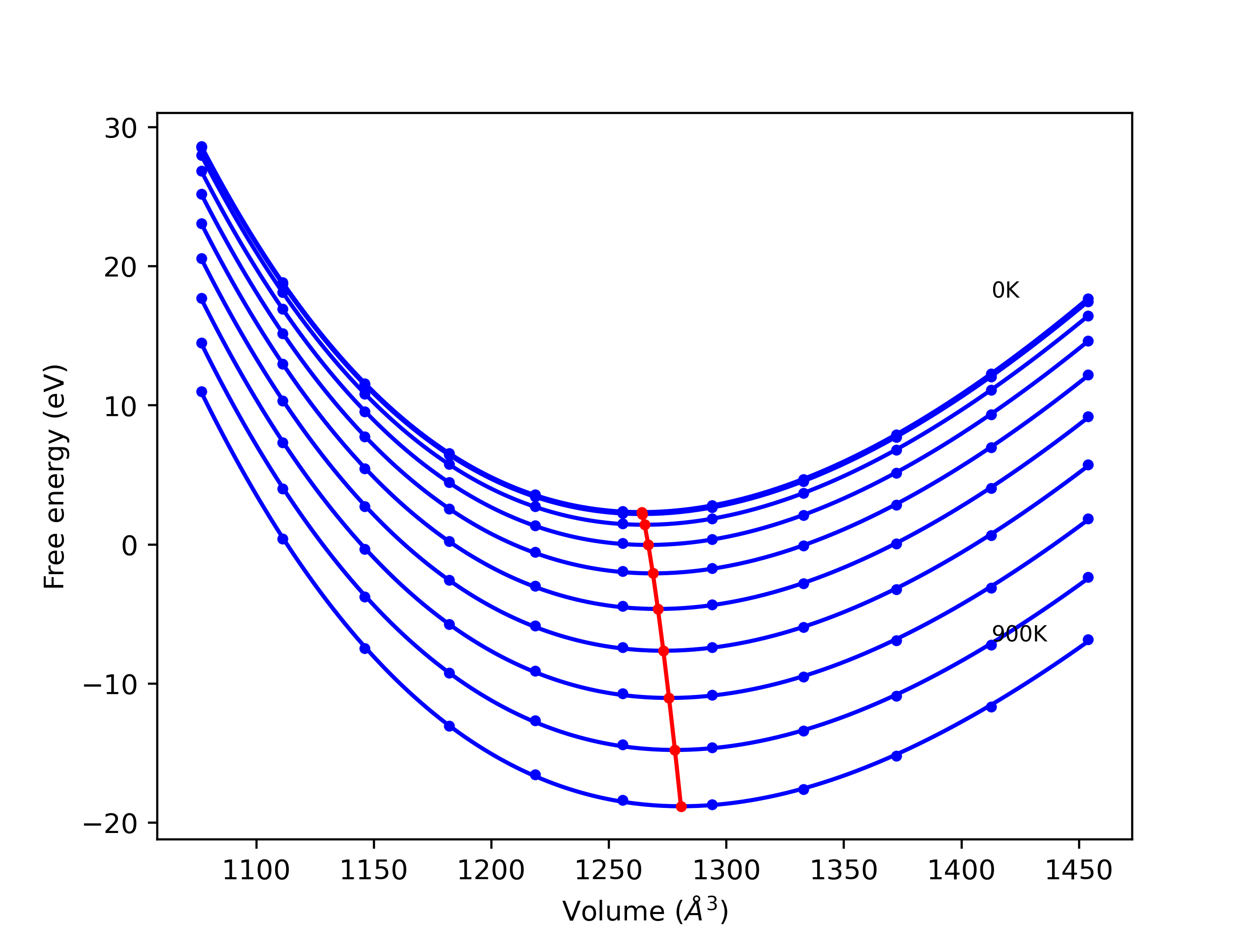 Plots of internal energy, Gibbs free energy, entropy, heat capacity and volume are shown here as a function of temperature for various crystal structures and liquid phases. The included crystal structures correspond to those in the Solid Structures vs. Temperature section, and the liquid phases to those in the Liquid Properties section. Internal energy and volume are taken from the associated structure relaxations mentioned in those previous sections. Constant pressure heat capacity is estimated using 3-point numerical derivatives of enthalpy versus temperature. Note that since all simulations done here are at 0 pressure, internal energy and enthalpy are equivalent.