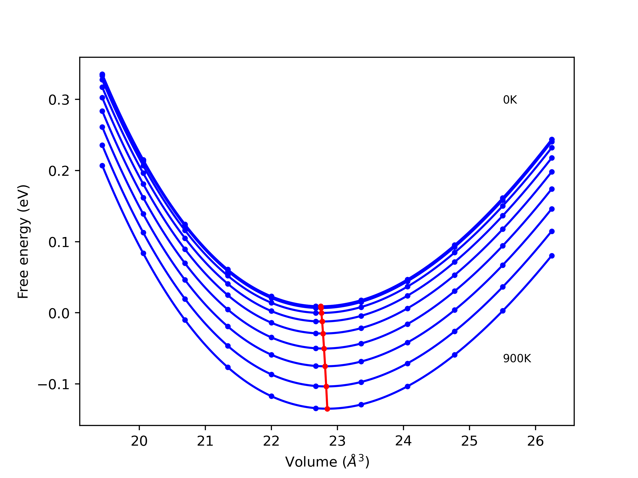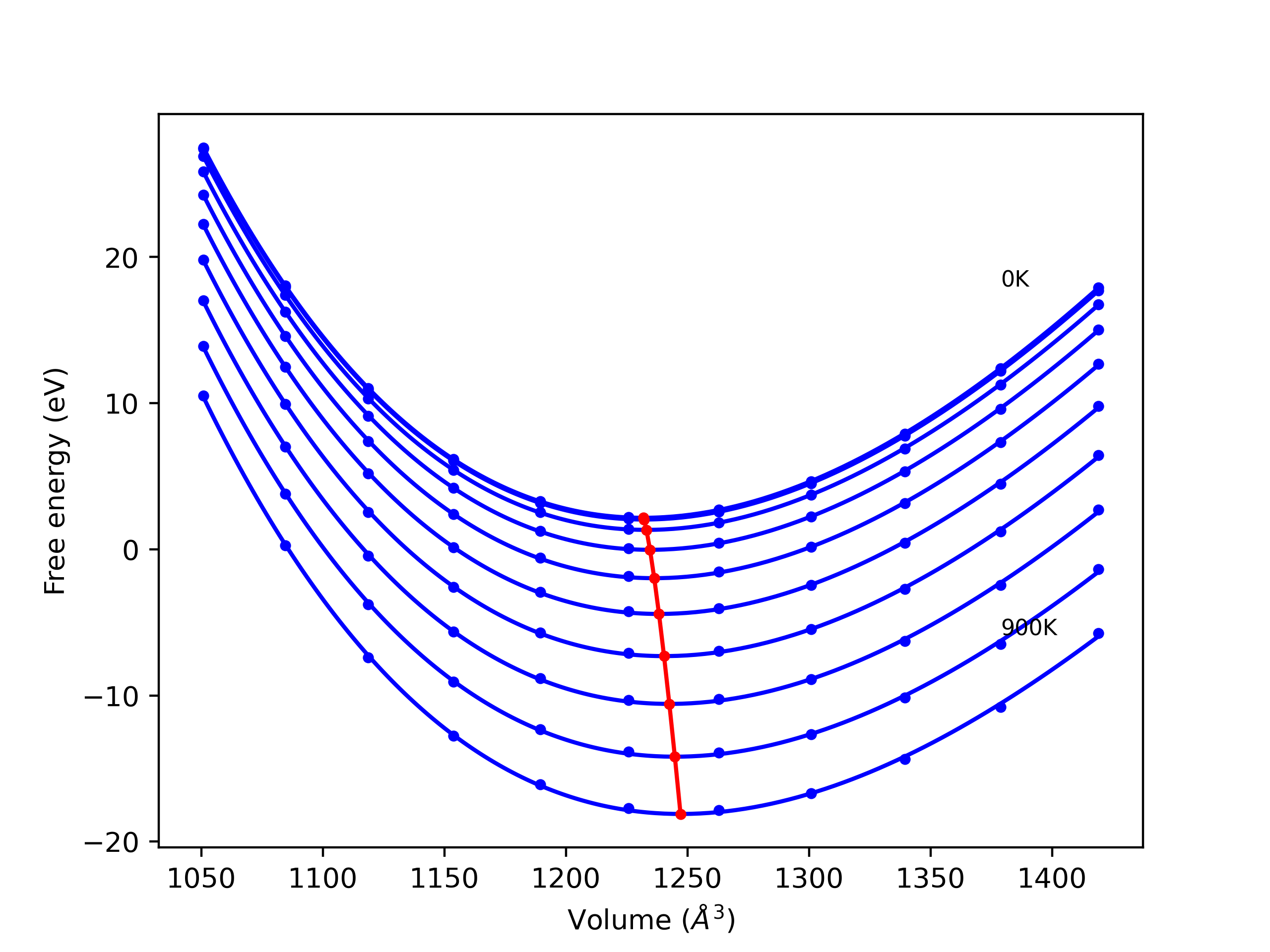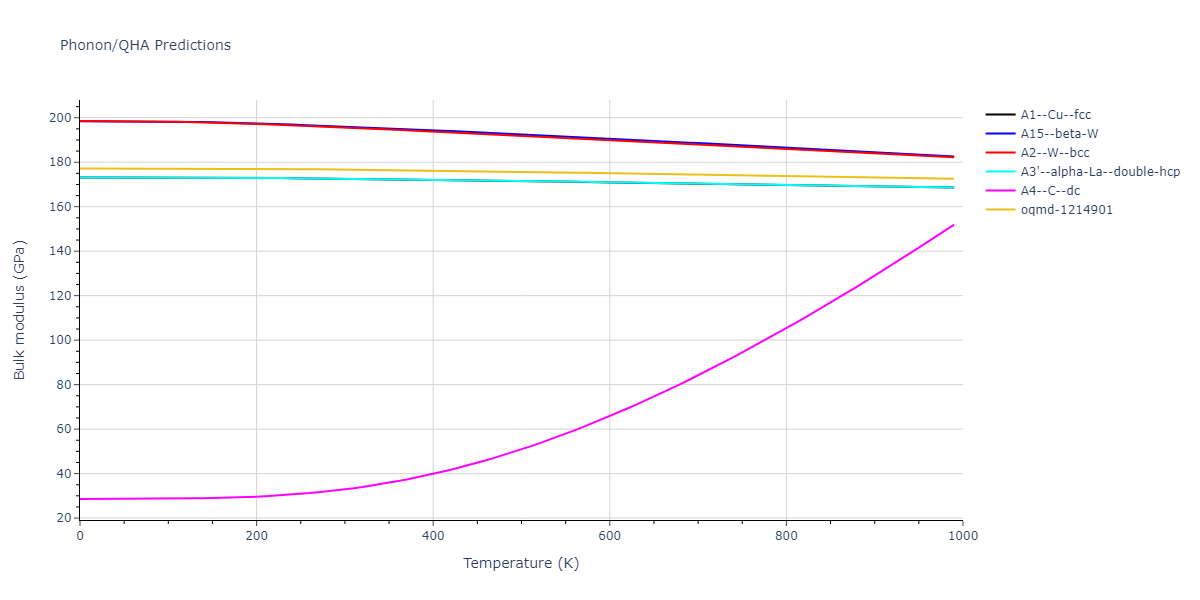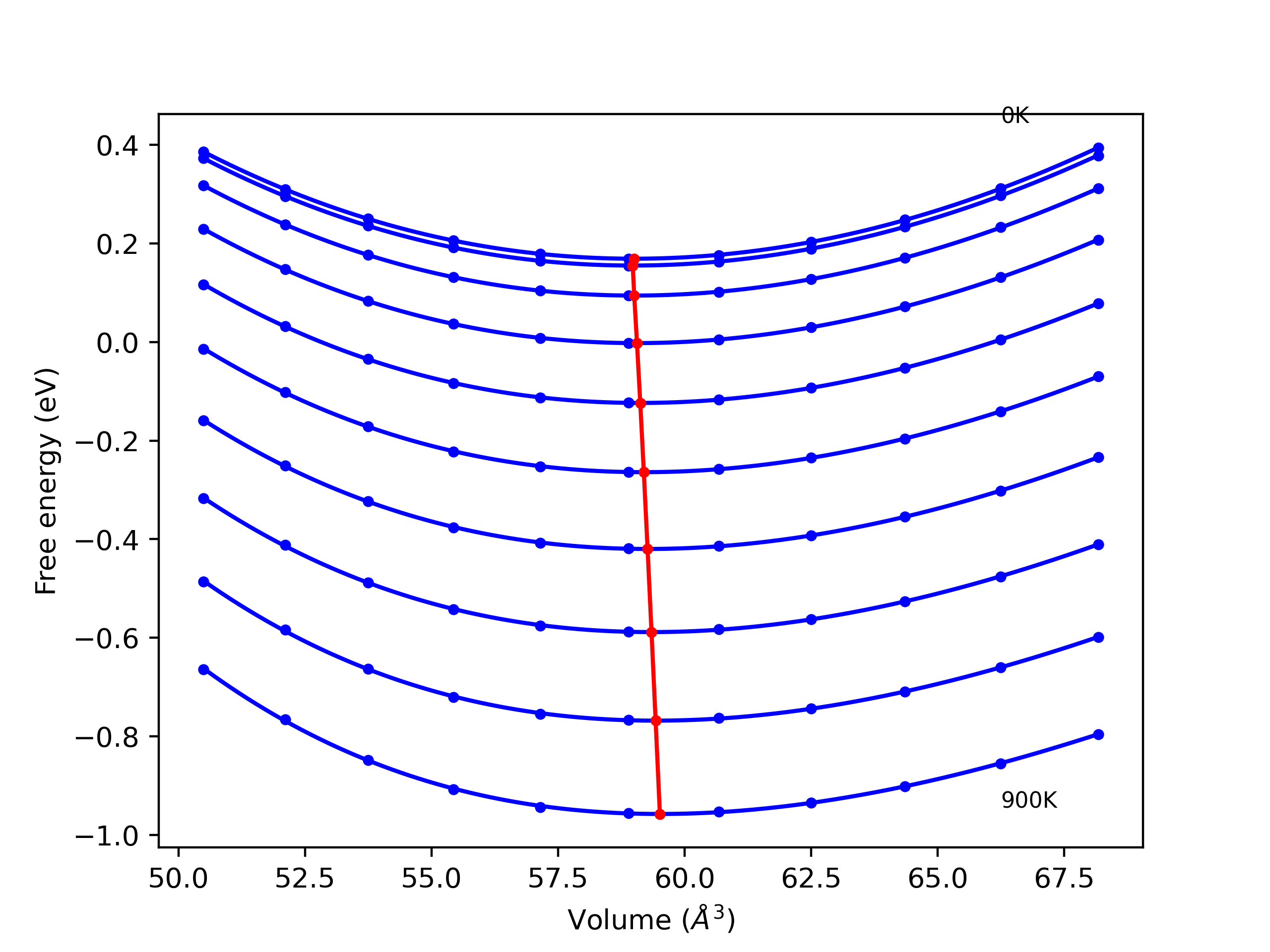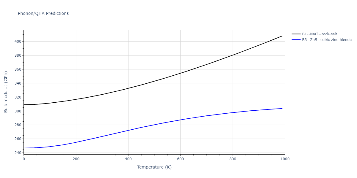 Plots of lattice and elastic constants are shown as a function of temperature. The 0K points were taken from the Crystal Structure Predictions and the Elastic Constants Predictions sections above for the unique crystal structures relaxed with the "dynamic" method. Starting from the 0 K relaxed crystal unit cells, supercell systems are created by replicating all three dimensions by the same multiplier to achieve at least 4000 atoms. The systems are then relaxed at 50 K and zero pressure using 1 million NPT steps. Lattice constants are estimated by averaging the measured box dimensions. Temperatures are iteratively increased by 50 K, with each subsequent relaxation calculation starting from the final atomic configuration at the previous temperature and relaxing for another 1 million steps.