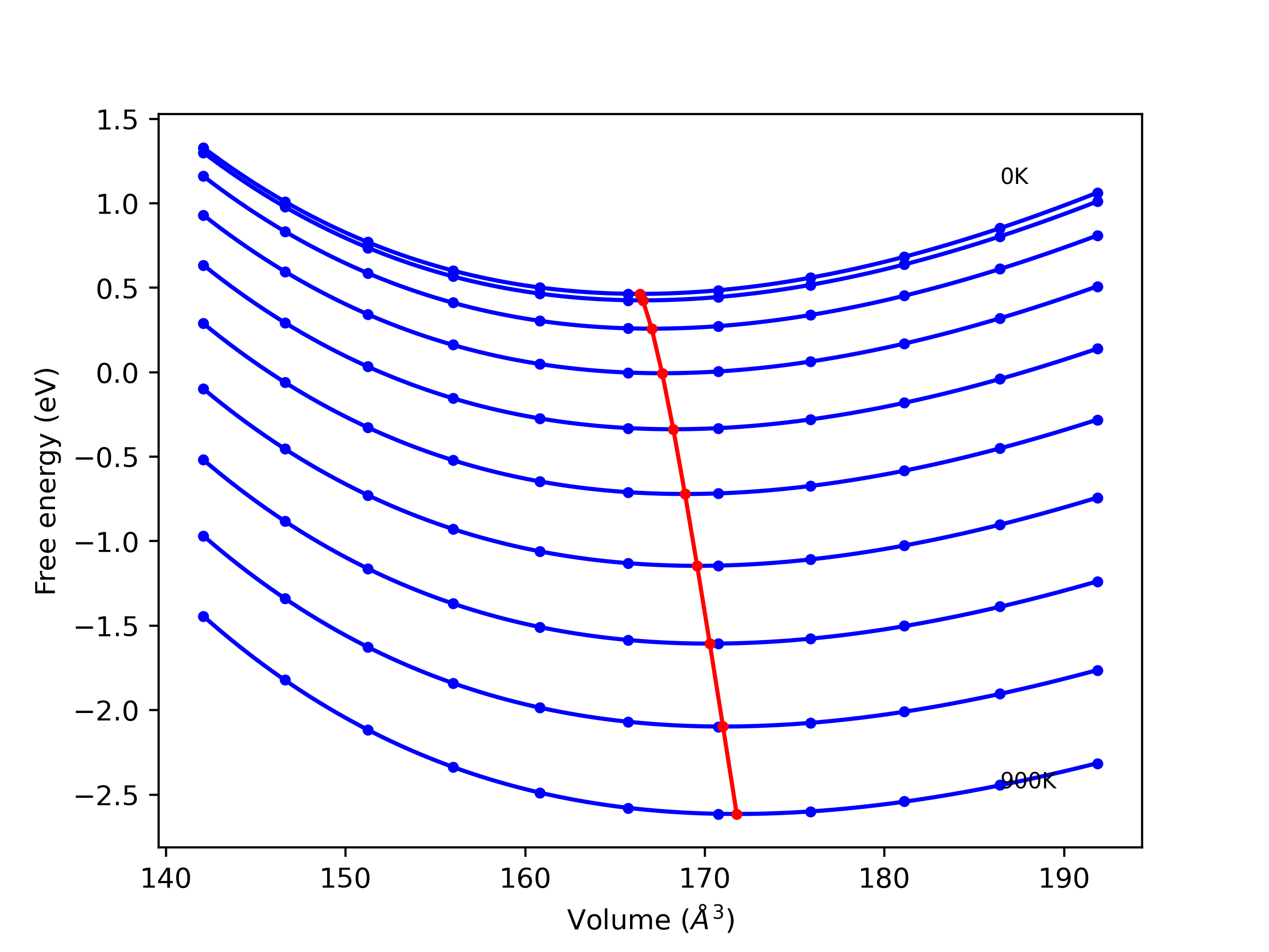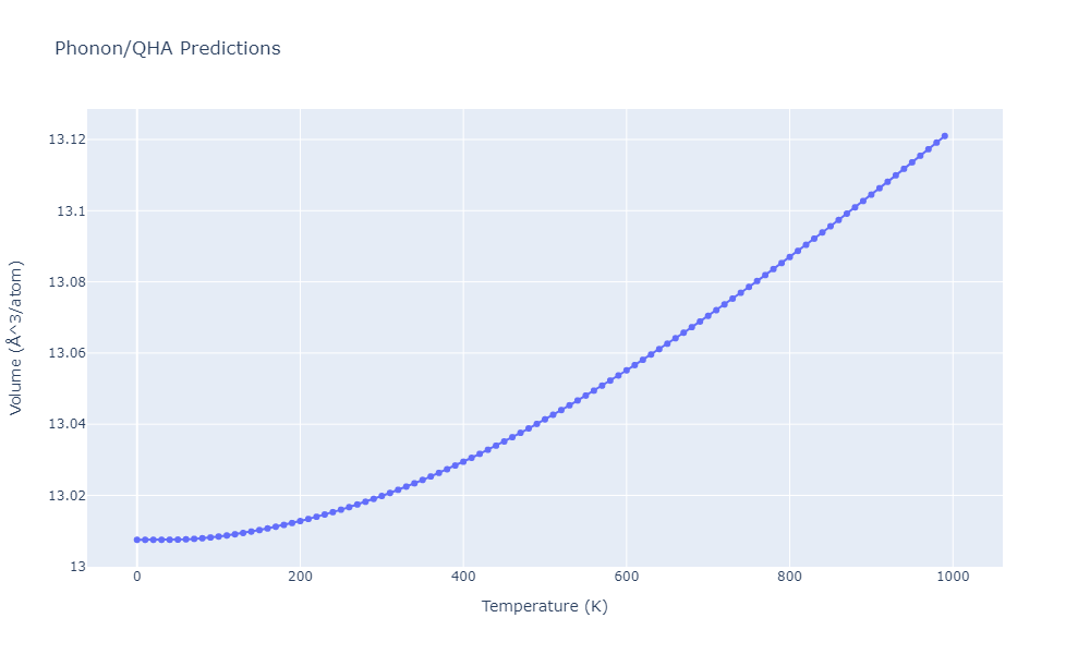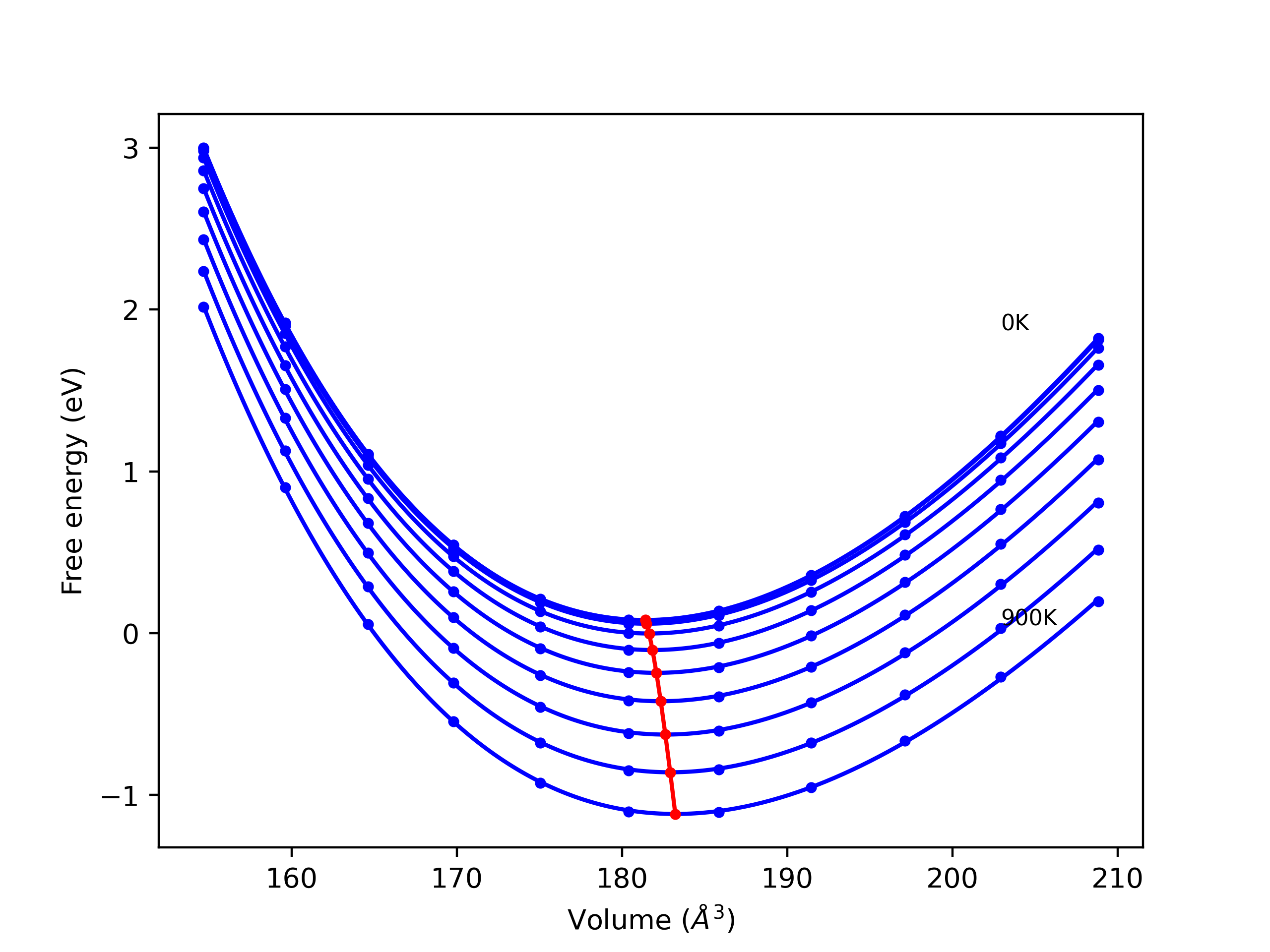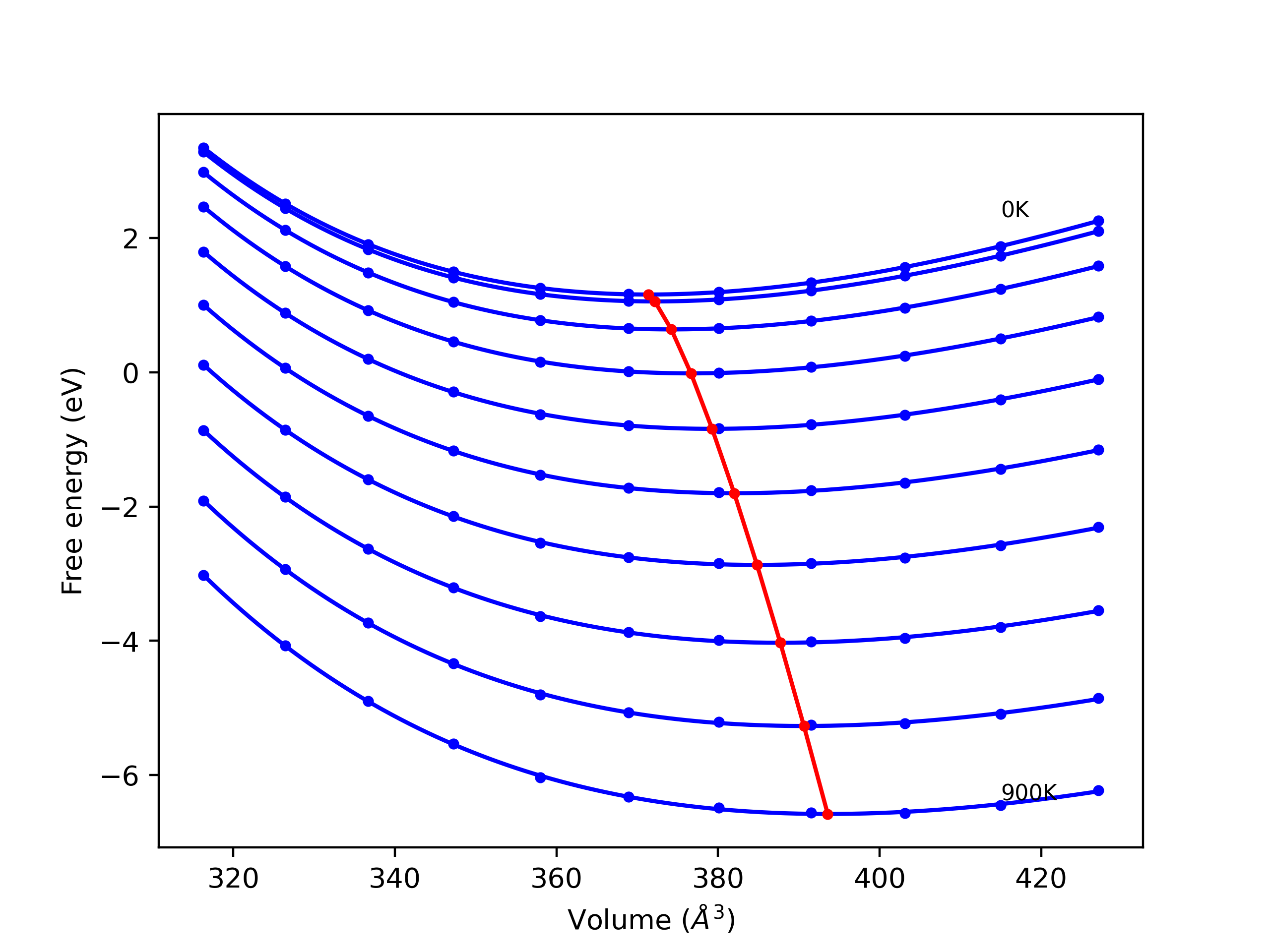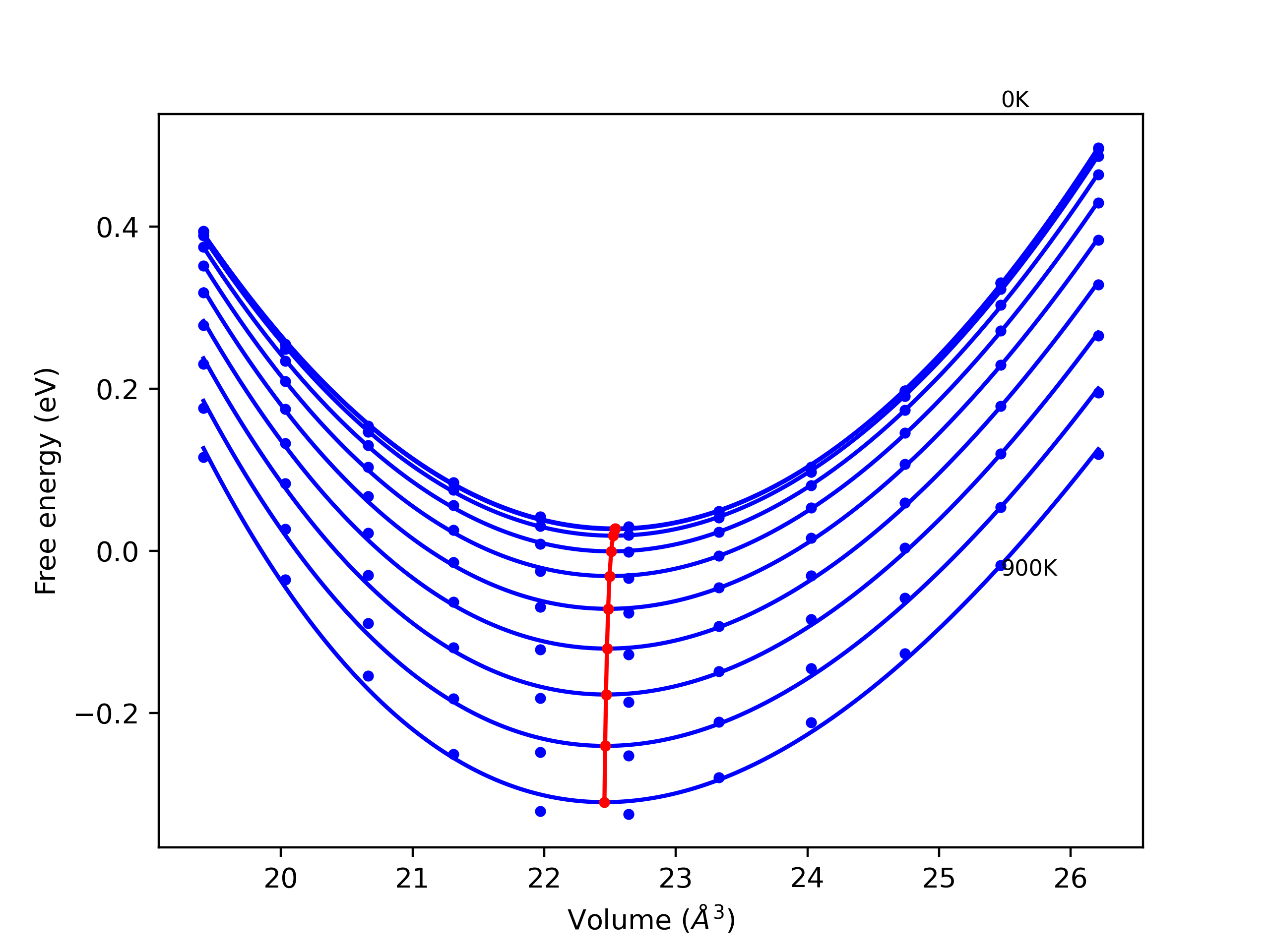 Plots of lattice and elastic constants are shown as a function of temperature. The 0K points were taken from the Crystal Structure Predictions and the Elastic Constants Predictions sections above for the unique crystal structures relaxed with the "dynamic" method. Starting from the 0 K relaxed crystal unit cells, supercell systems are created by replicating all three dimensions by the same multiplier to achieve at least 4000 atoms. The systems are then relaxed at 50 K and zero pressure using 1 million NPT steps. Lattice constants are estimated by averaging the measured box dimensions. Temperatures are iteratively increased by 50 K, with each subsequent relaxation calculation starting from the final atomic configuration at the previous temperature and relaxing for another 1 million steps.