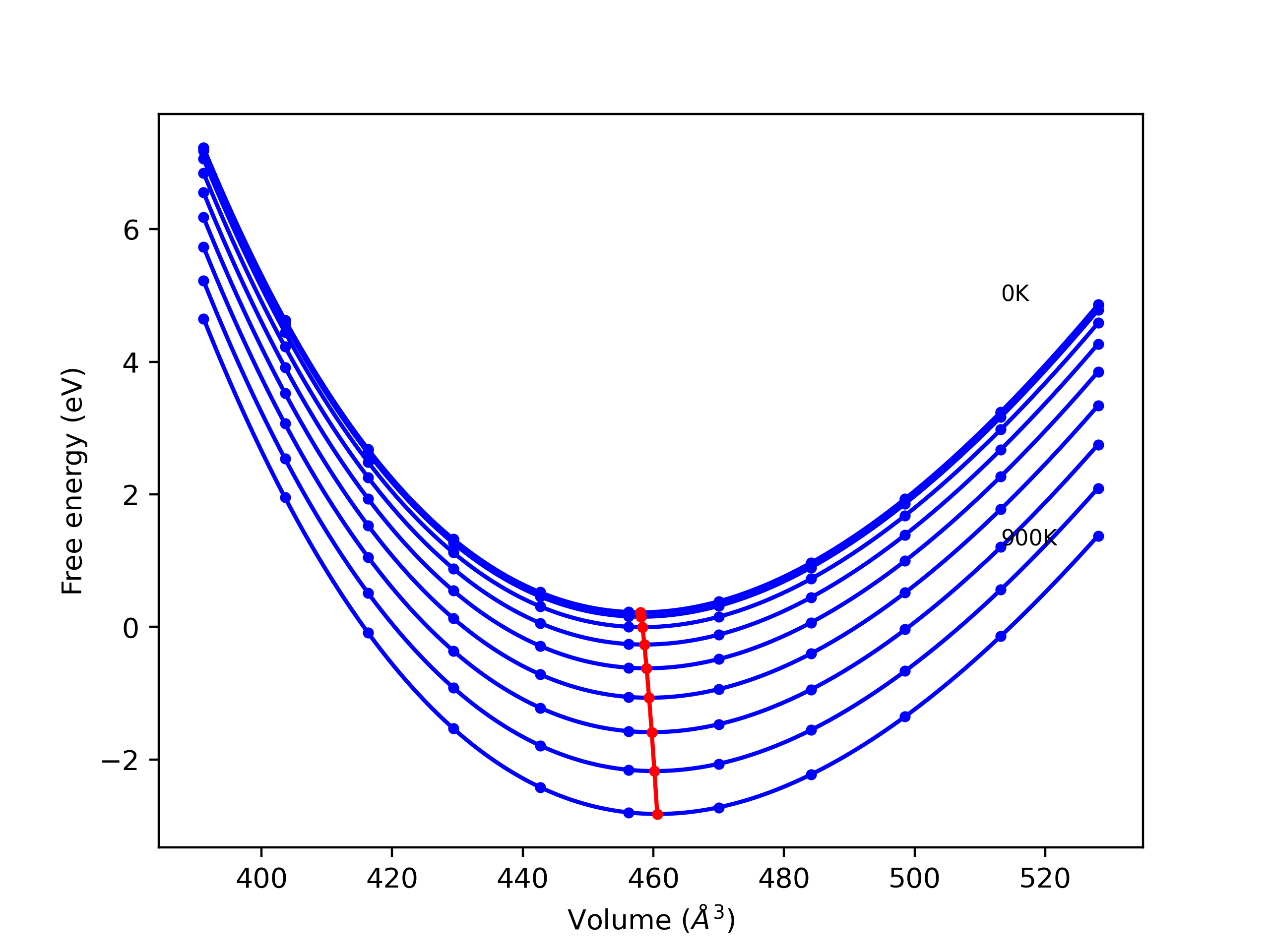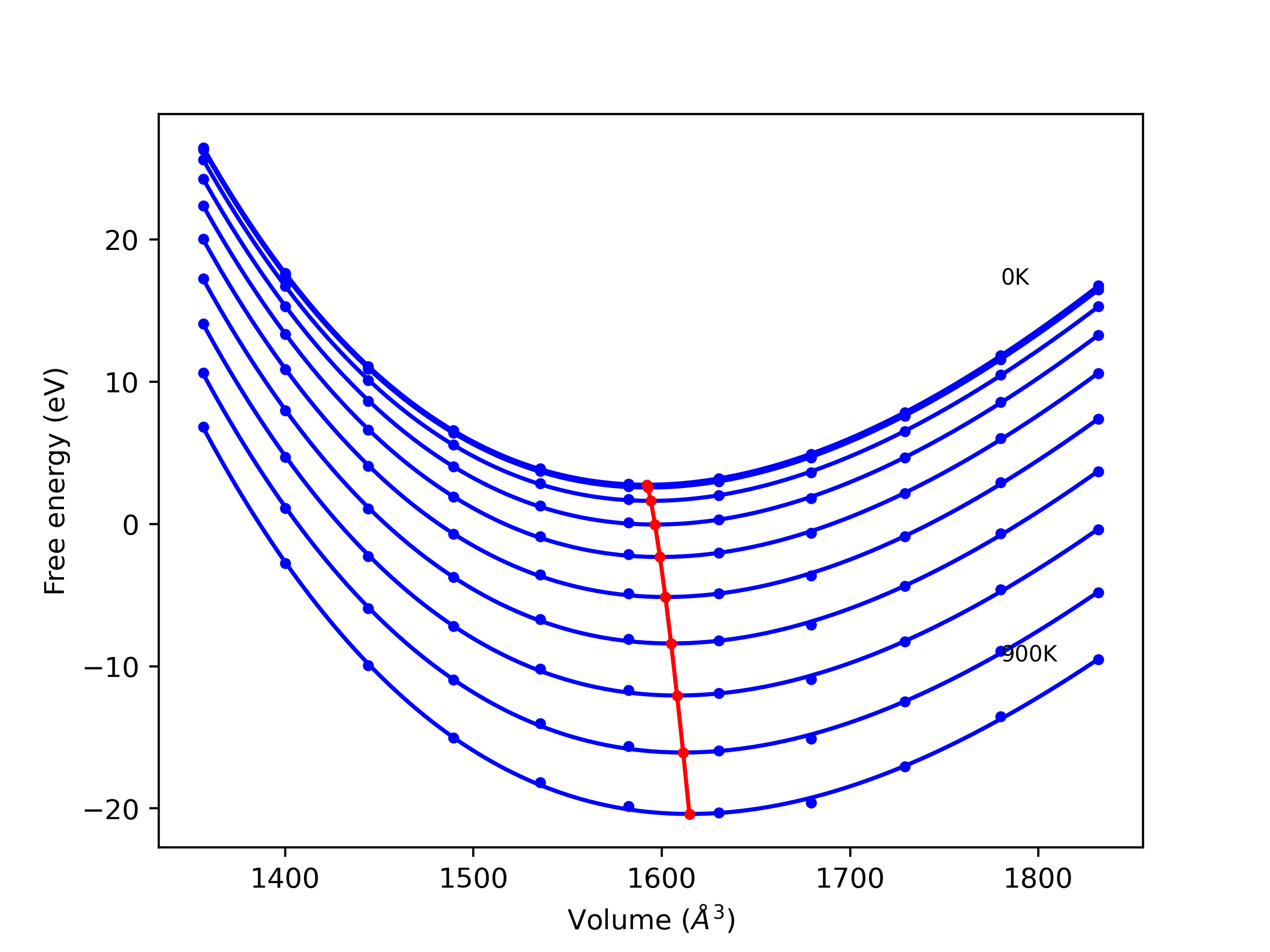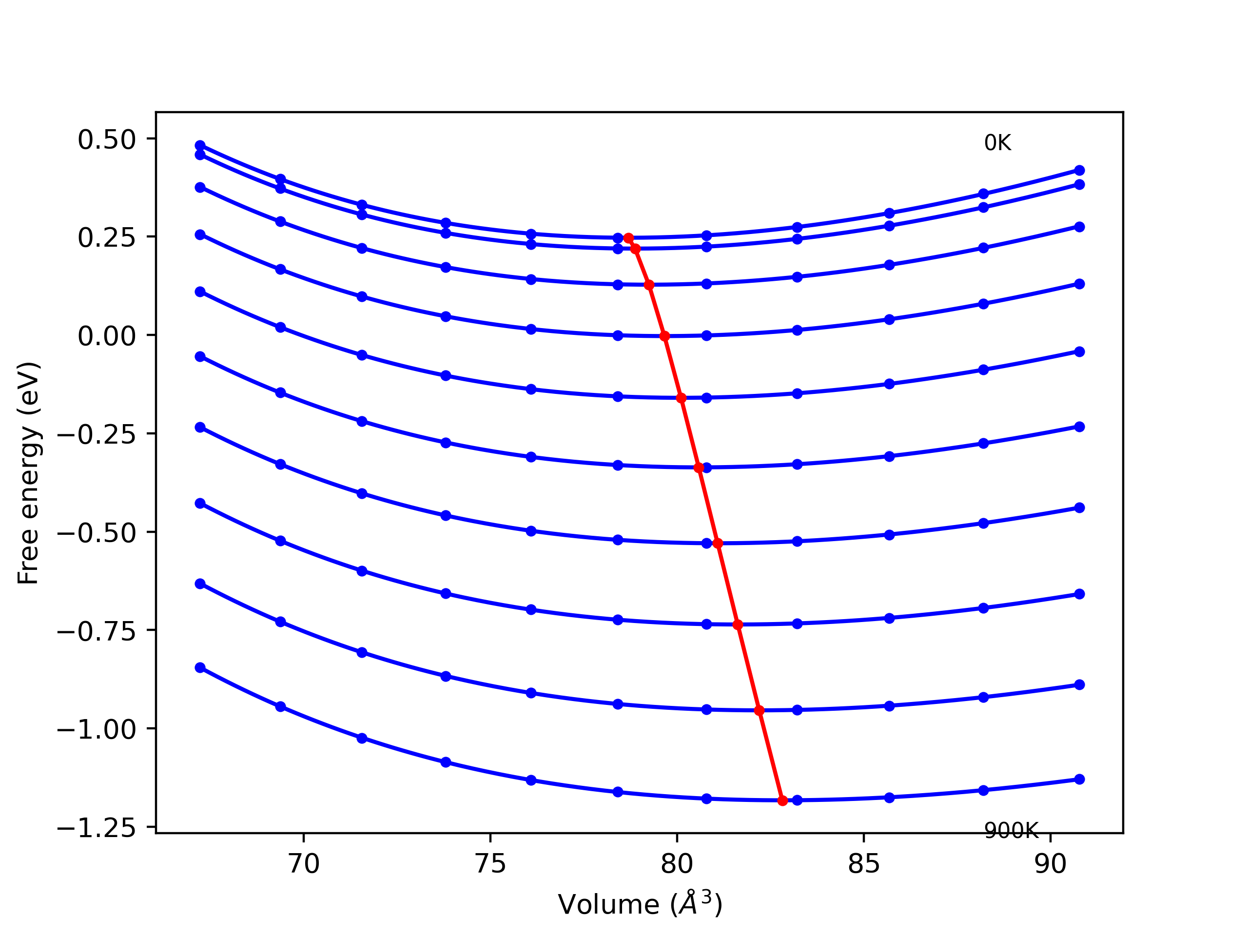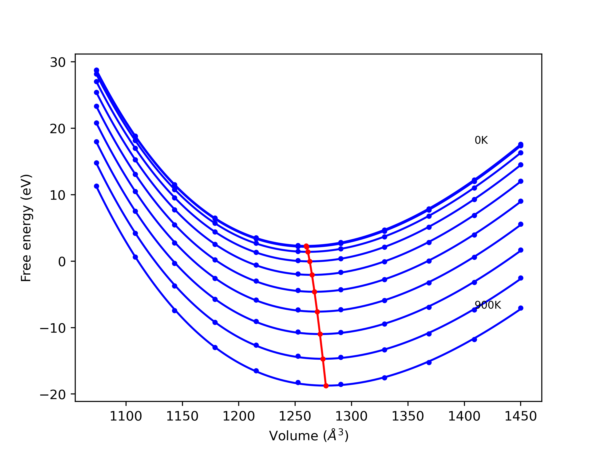 Plots of lattice and elastic constants are shown as a function of temperature. The 0K points were taken from the Crystal Structure Predictions and the Elastic Constants Predictions sections above for the unique crystal structures relaxed with the "dynamic" method. Starting from the 0 K relaxed crystal unit cells, supercell systems are created by replicating all three dimensions by the same multiplier to achieve at least 4000 atoms. The systems are then relaxed at 50 K and zero pressure using 1 million NPT steps. Lattice constants are estimated by averaging the measured box dimensions. Temperatures are iteratively increased by 50 K, with each subsequent relaxation calculation starting from the final atomic configuration at the previous temperature and relaxing for another 1 million steps.