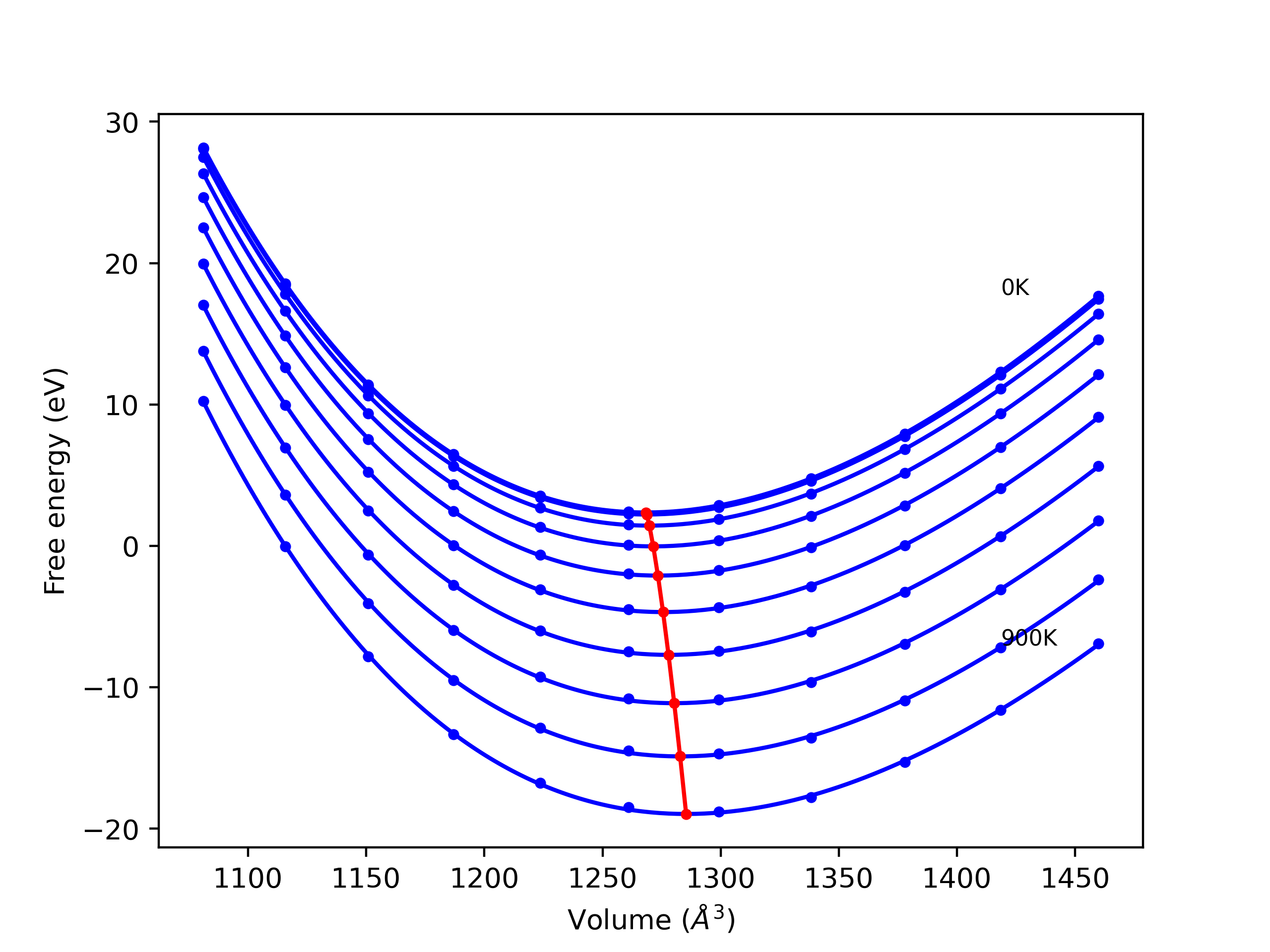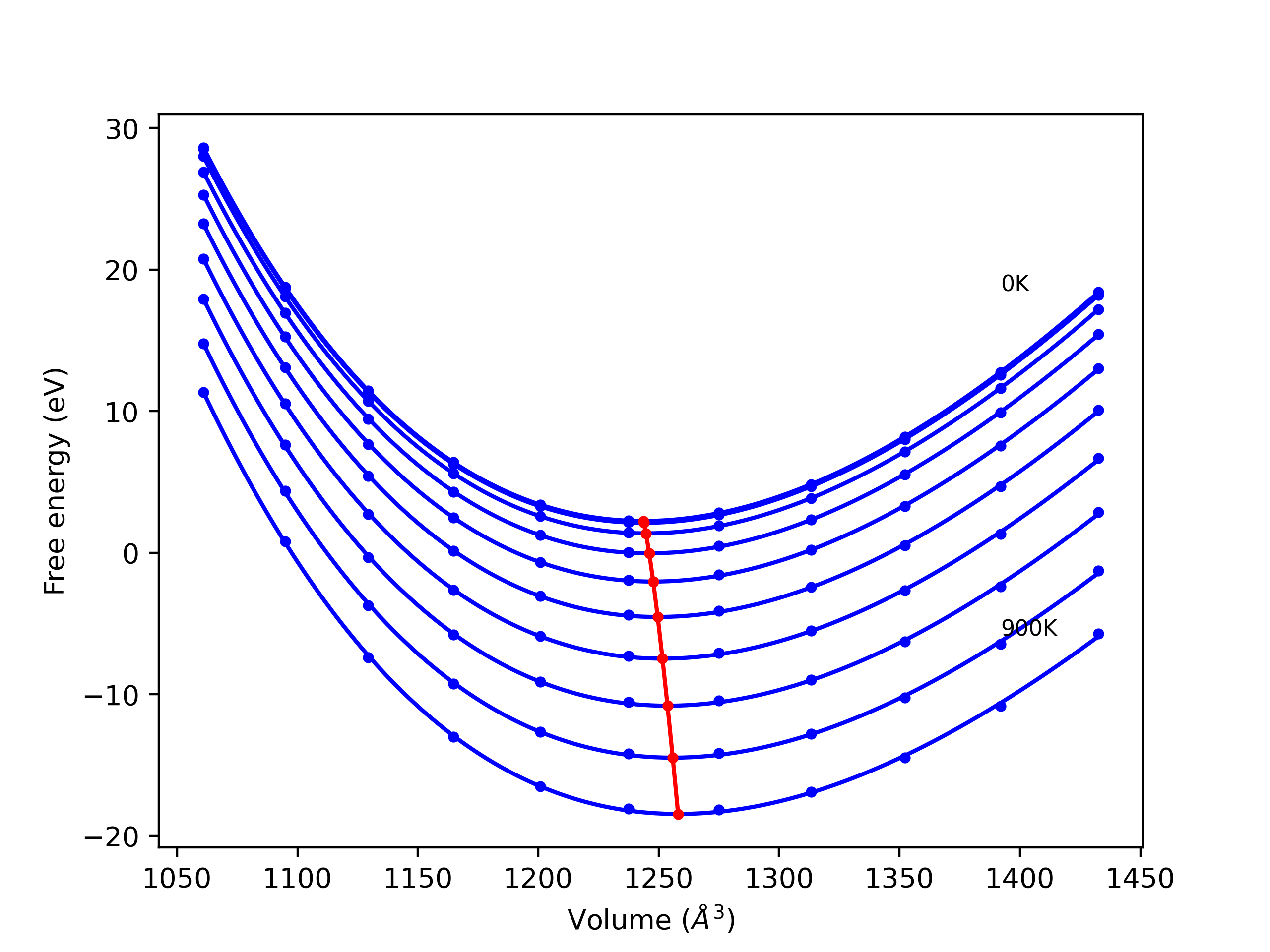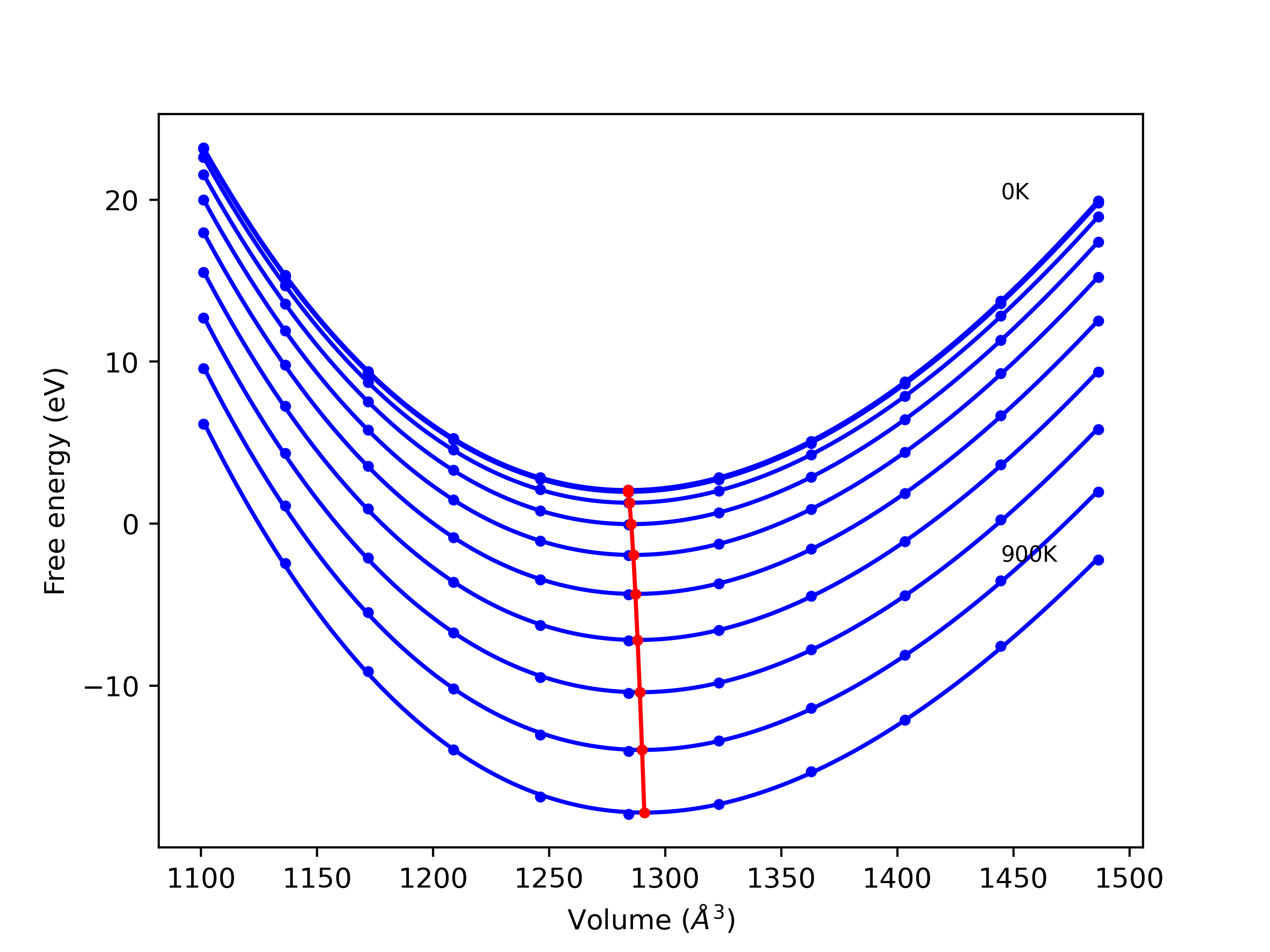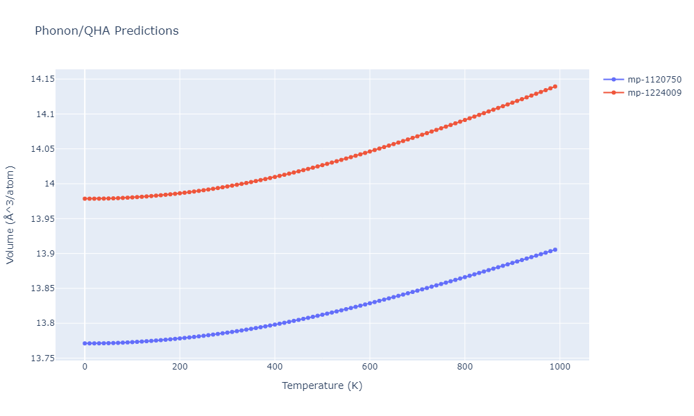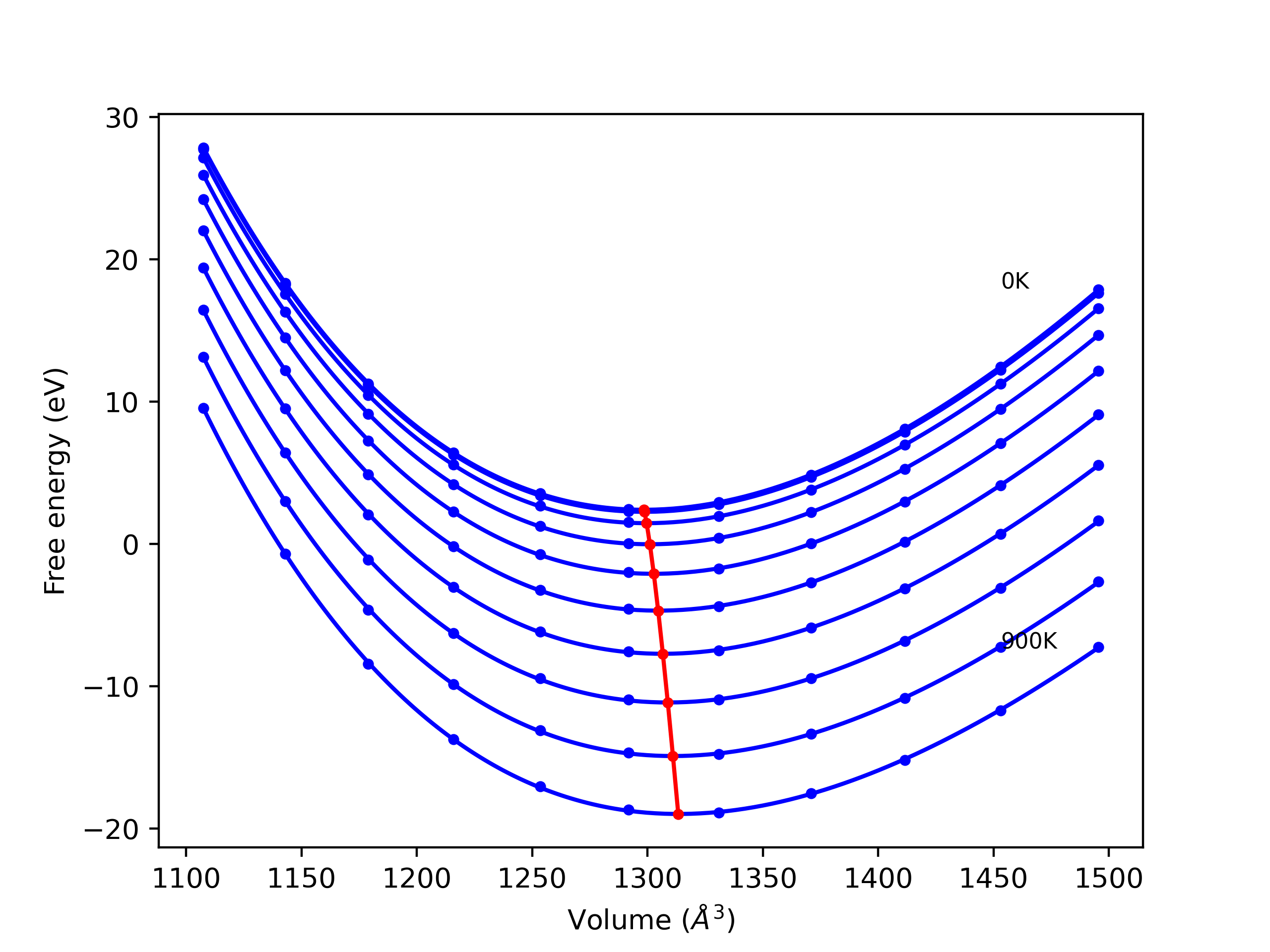 Plots of lattice and elastic constants are shown as a function of temperature. The 0K points were taken from the Crystal Structure Predictions and the Elastic Constants Predictions sections above for the unique crystal structures relaxed with the "dynamic" method. Starting from the 0 K relaxed crystal unit cells, supercell systems are created by replicating all three dimensions by the same multiplier to achieve at least 4000 atoms. The systems are then relaxed at 50 K and zero pressure using 1 million NPT steps. Lattice constants are estimated by averaging the measured box dimensions. Temperatures are iteratively increased by 50 K, with each subsequent relaxation calculation starting from the final atomic configuration at the previous temperature and relaxing for another 1 million steps.