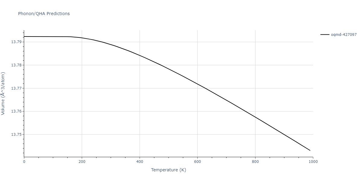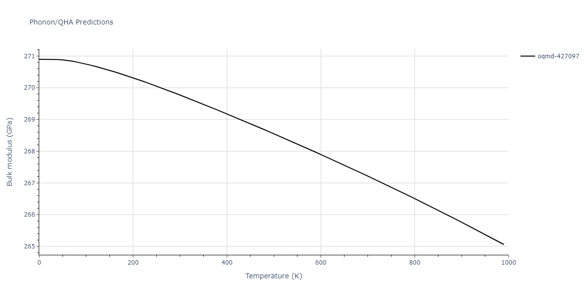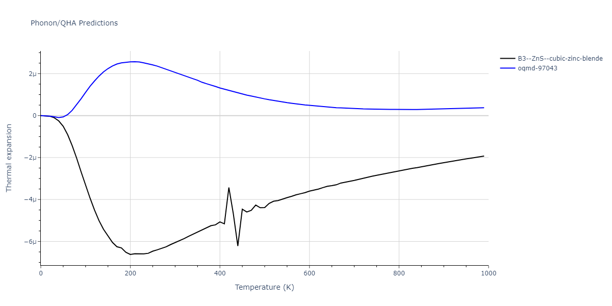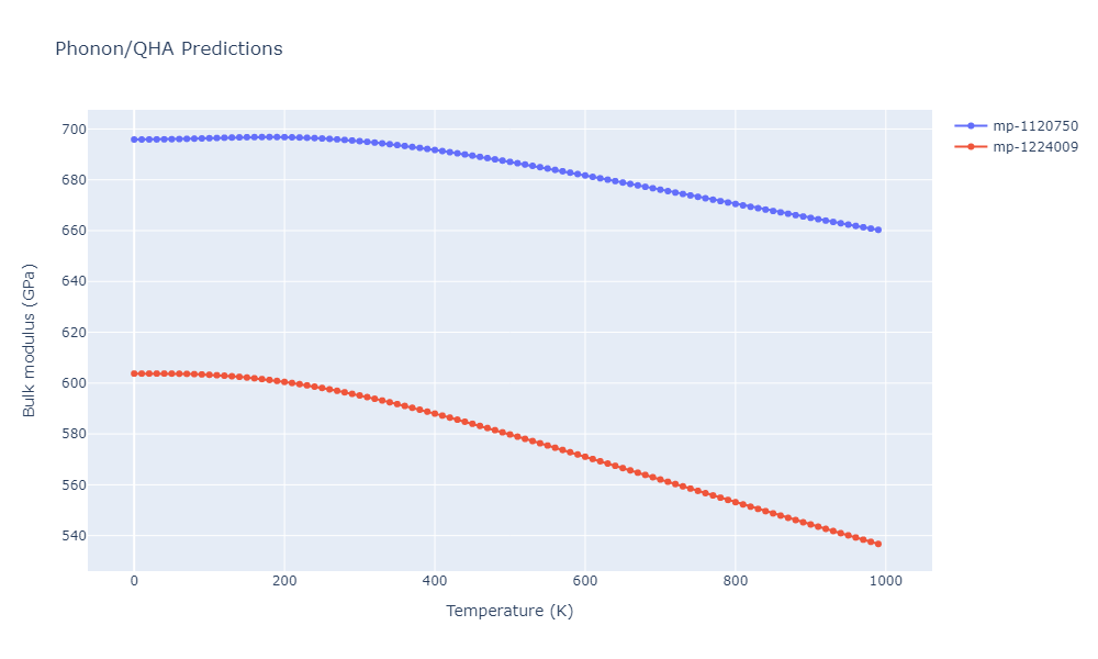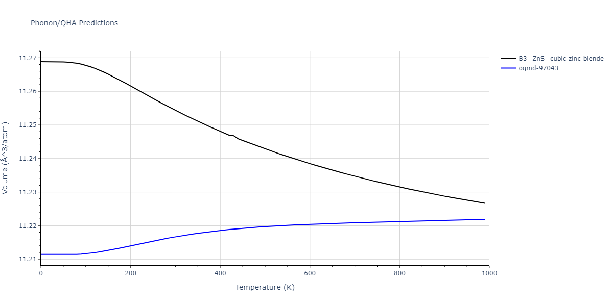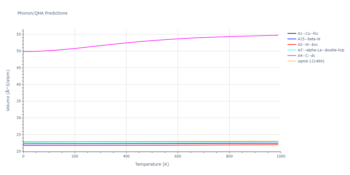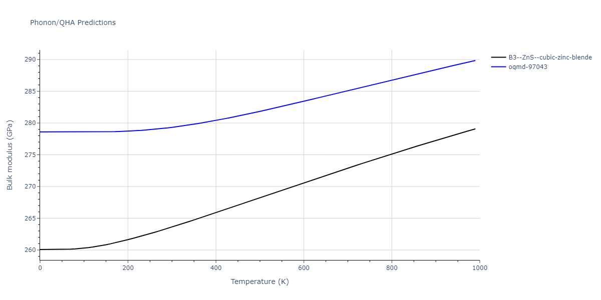 Plots of lattice and elastic constants are shown as a function of temperature. The 0K points were taken from the Crystal Structure Predictions and the Elastic Constants Predictions sections above for the unique crystal structures relaxed with the "dynamic" method. Starting from the 0 K relaxed crystal unit cells, supercell systems are created by replicating all three dimensions by the same multiplier to achieve at least 4000 atoms. The systems are then relaxed at 50 K and zero pressure using 1 million NPT steps. Lattice constants are estimated by averaging the measured box dimensions. Temperatures are iteratively increased by 50 K, with each subsequent relaxation calculation starting from the final atomic configuration at the previous temperature and relaxing for another 1 million steps.