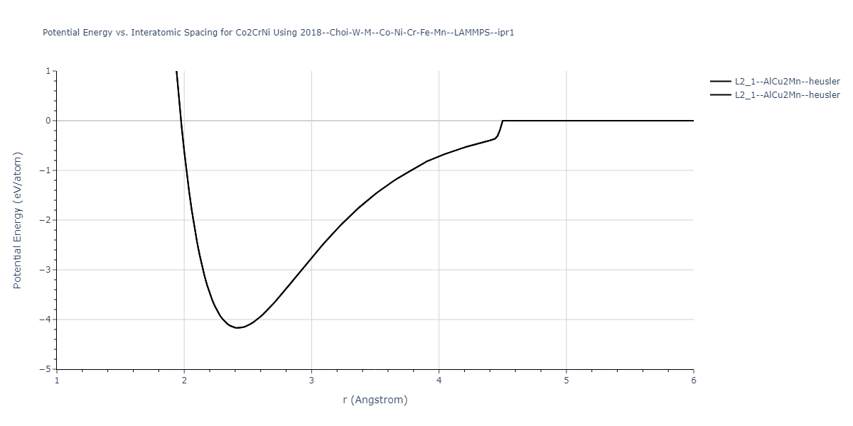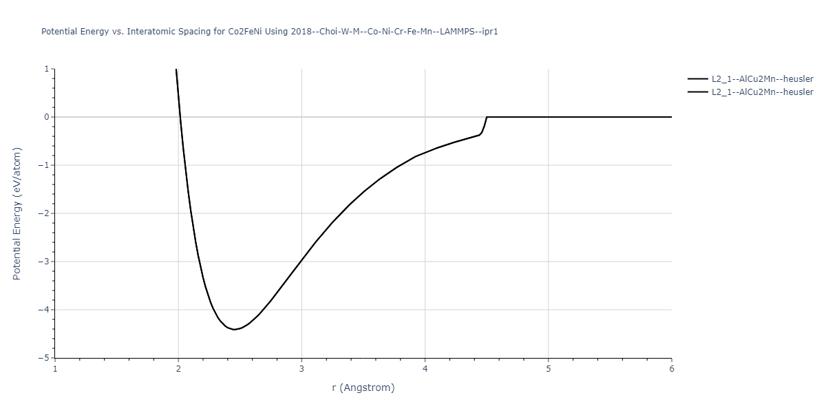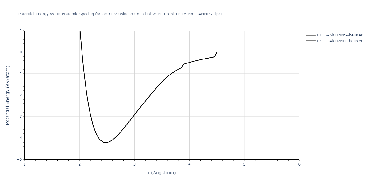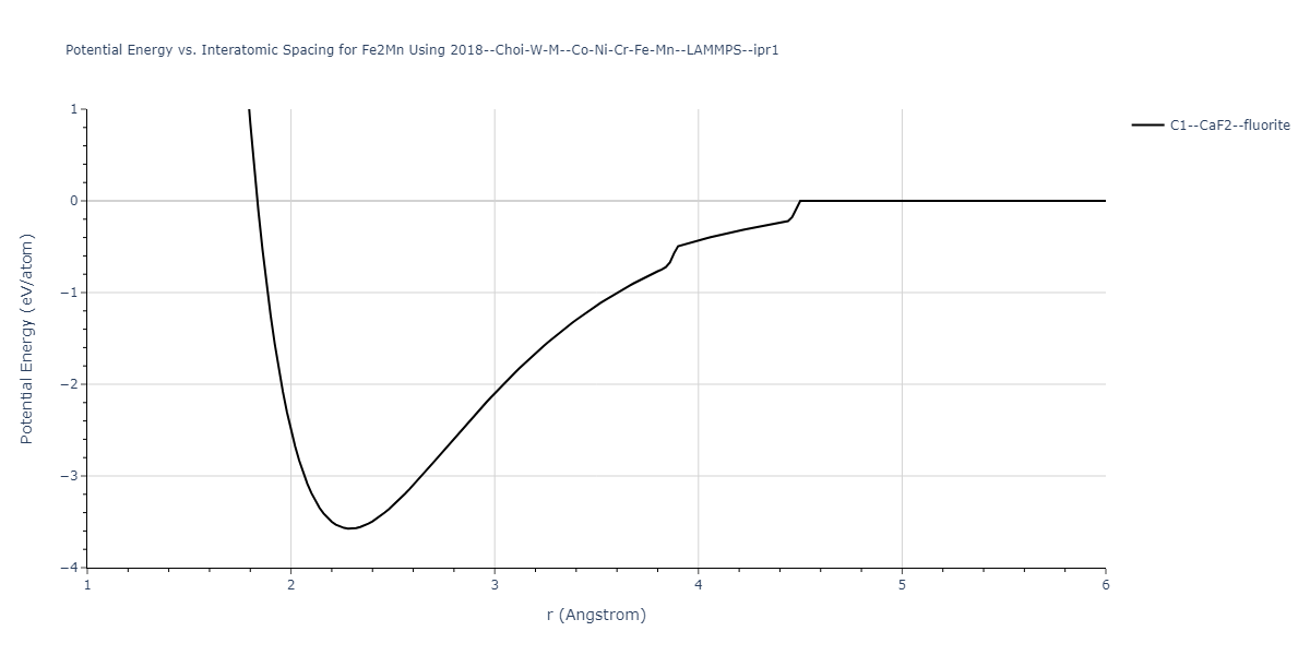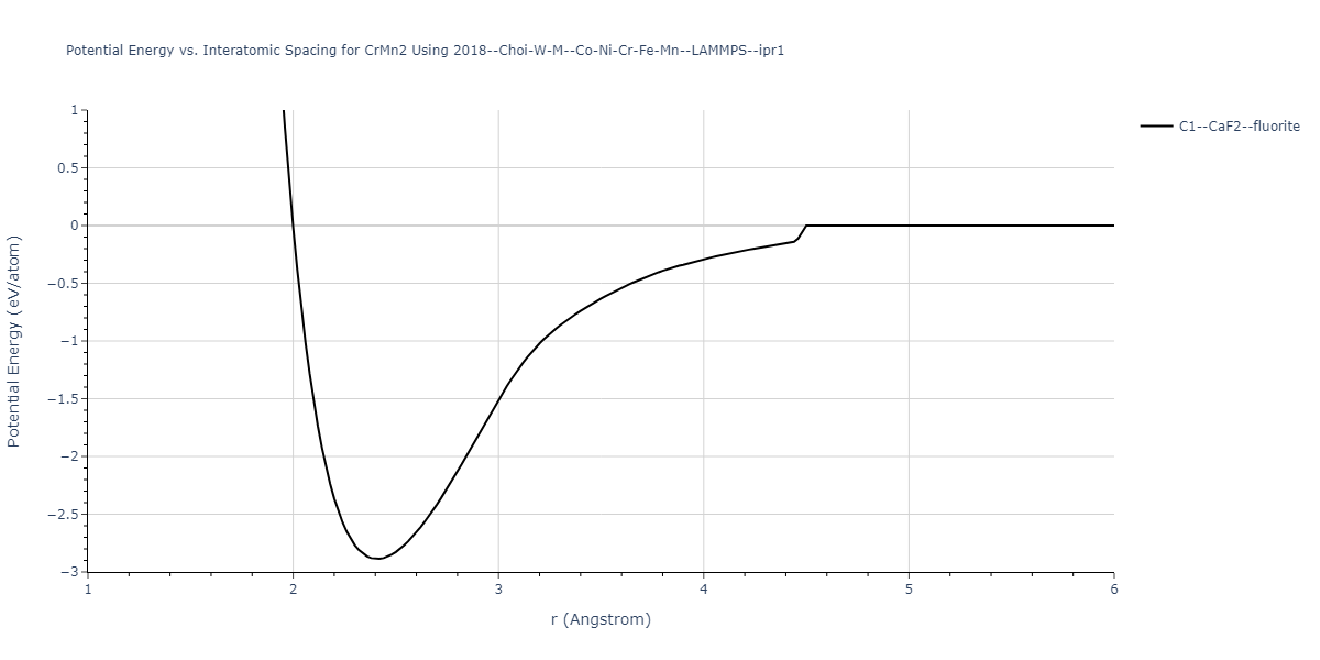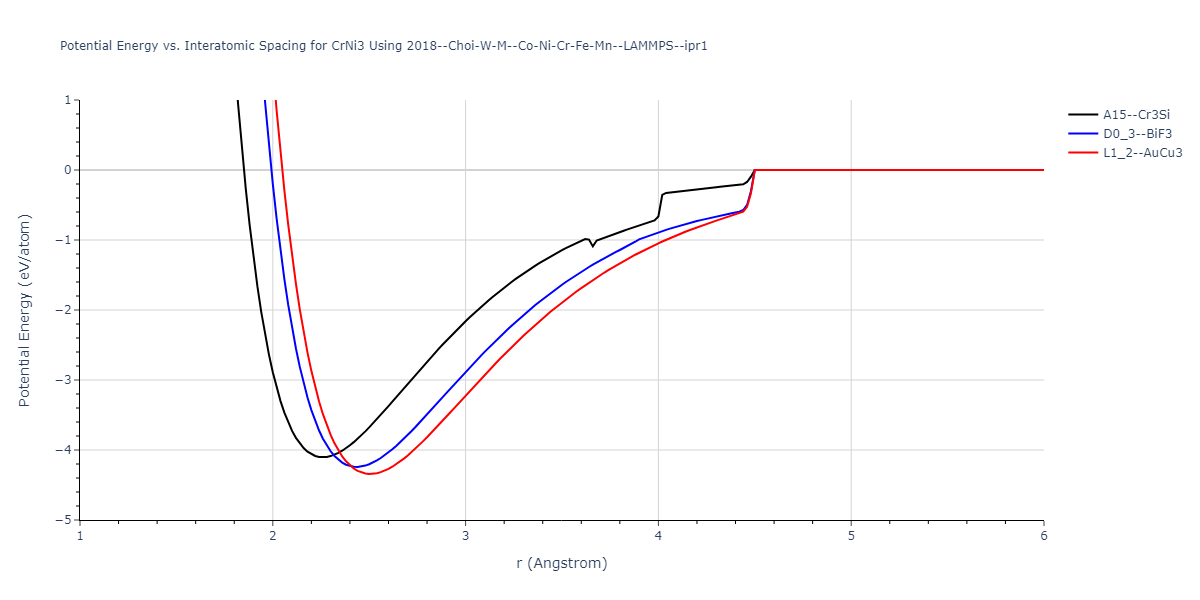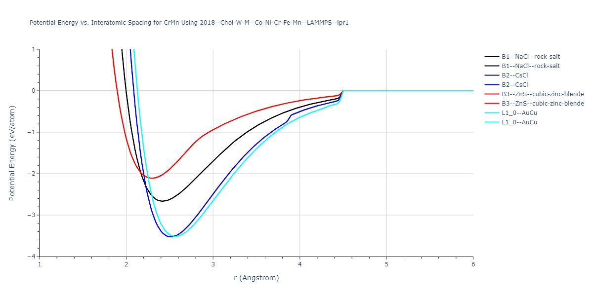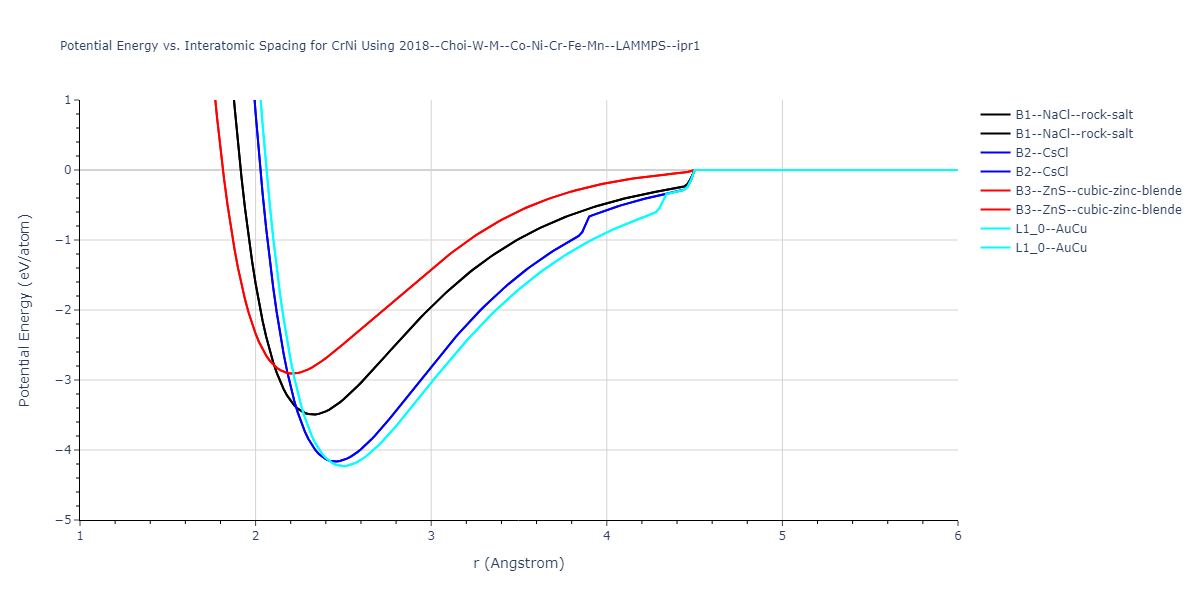 Plots of potential energy vs interatomic spacing, r, are shown below for a number of crystal structures. The structures are generated based on the ideal atomic positions and b/a and c/a lattice parameter ratios for a given crystal prototype. The size of the system is then uniformly scaled, and the energy calculated without relaxing the system. To obtain these plots, values of r are evaluated every 0.02 Å up to 6 Å.