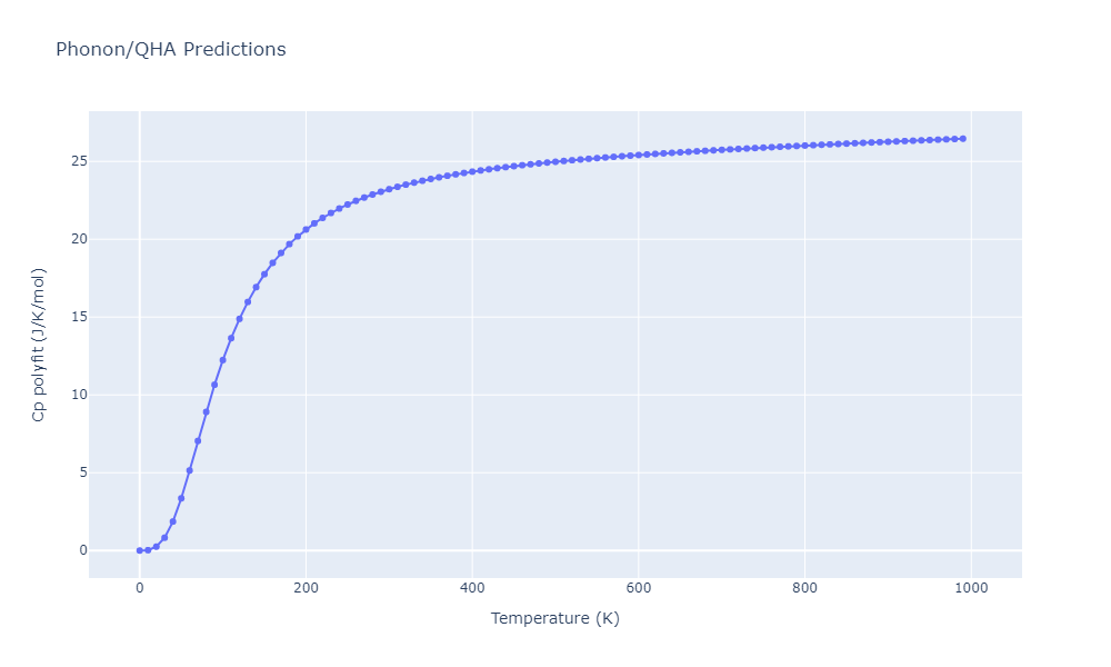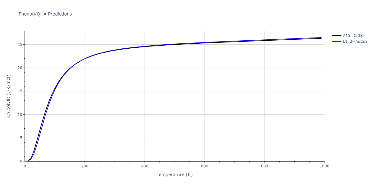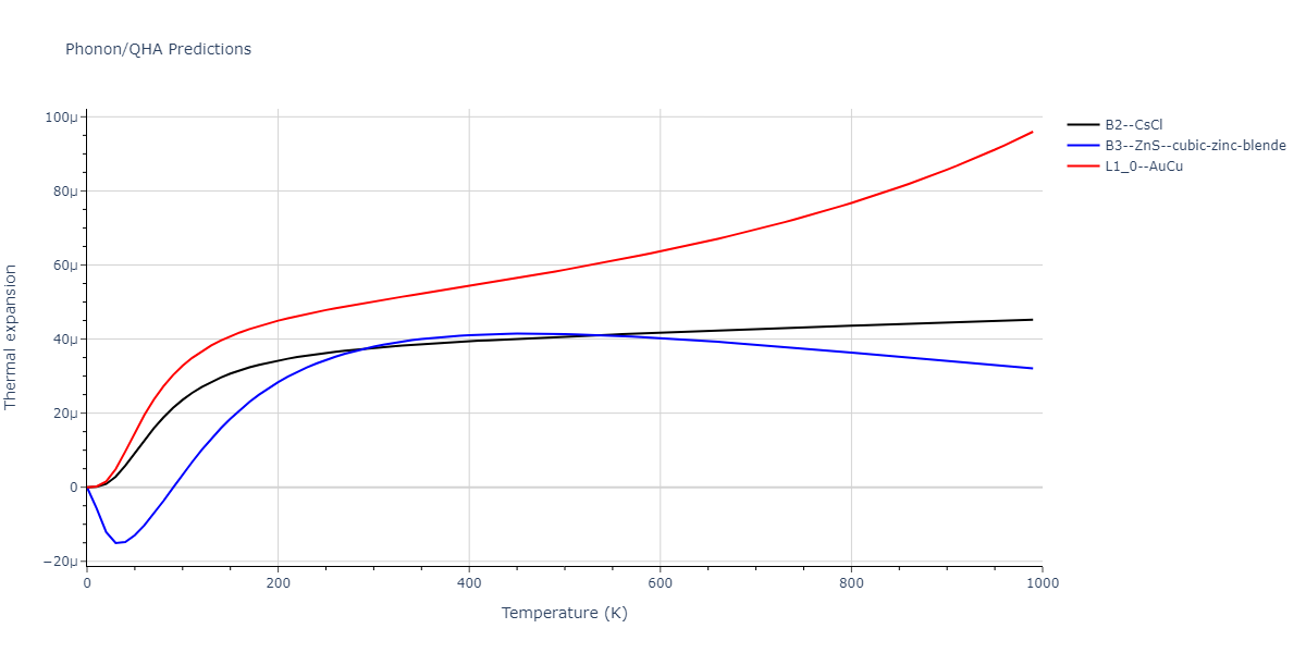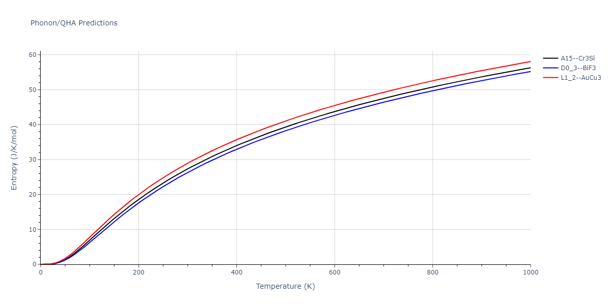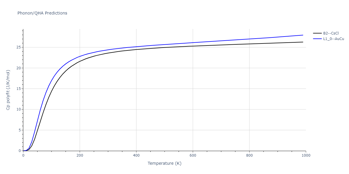 Plots of internal energy, Gibbs free energy, entropy, heat capacity and volume are shown here as a function of temperature for various crystal structures and liquid phases. The included crystal structures correspond to those in the Solid Structures vs. Temperature section, and the liquid phases to those in the Liquid Properties section. Internal energy and volume are taken from the associated structure relaxations mentioned in those previous sections. Constant pressure heat capacity is estimated using 3-point numerical derivatives of enthalpy versus temperature. Note that since all simulations done here are at 0 pressure, internal energy and enthalpy are equivalent.