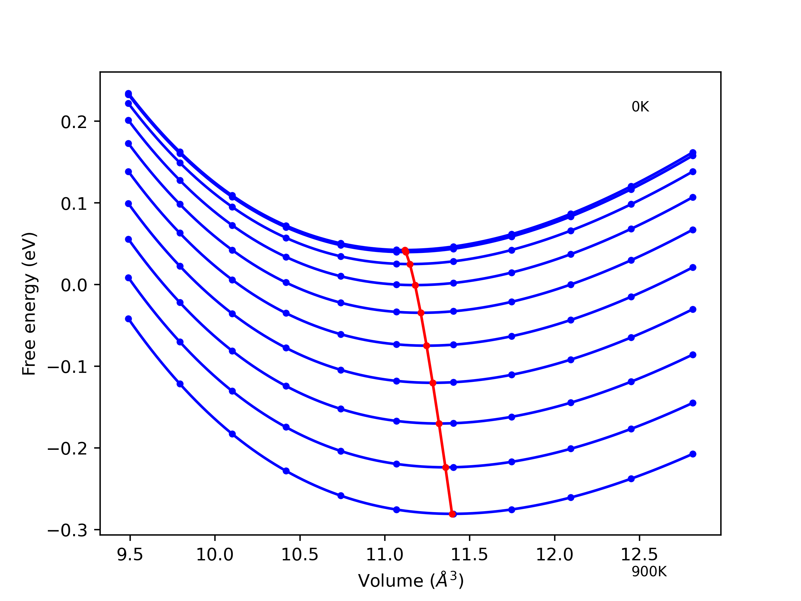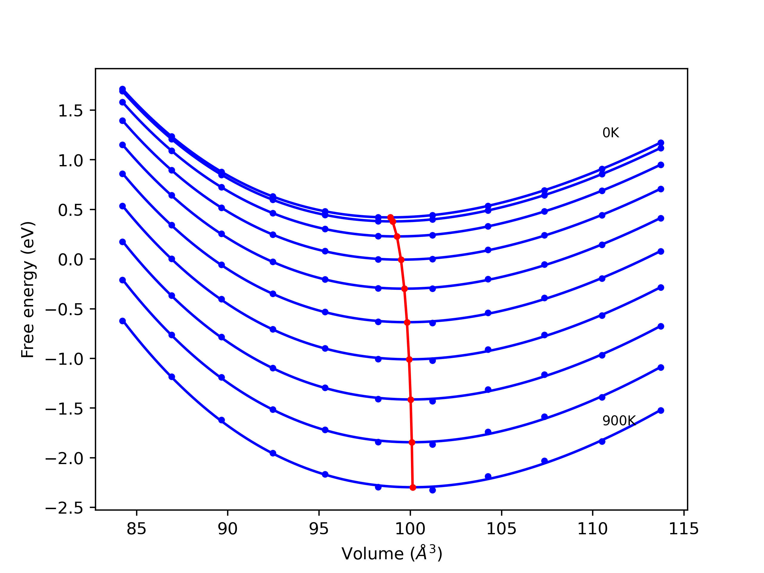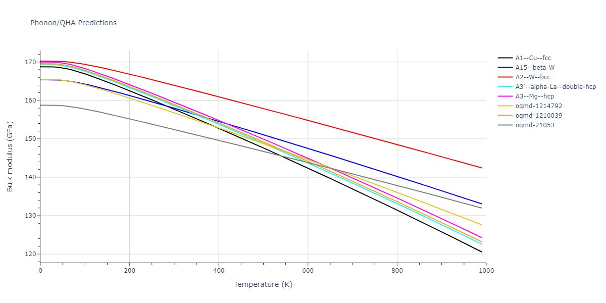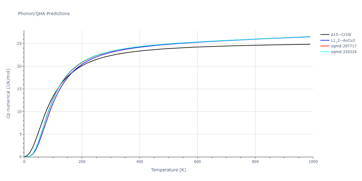 Plots of internal energy, Gibbs free energy, entropy, heat capacity and volume are shown here as a function of temperature for various crystal structures and liquid phases. The included crystal structures correspond to those in the Solid Structures vs. Temperature section, and the liquid phases to those in the Liquid Properties section. Internal energy and volume are taken from the associated structure relaxations mentioned in those previous sections. Constant pressure heat capacity is estimated using 3-point numerical derivatives of enthalpy versus temperature. Note that since all simulations done here are at 0 pressure, internal energy and enthalpy are equivalent.
