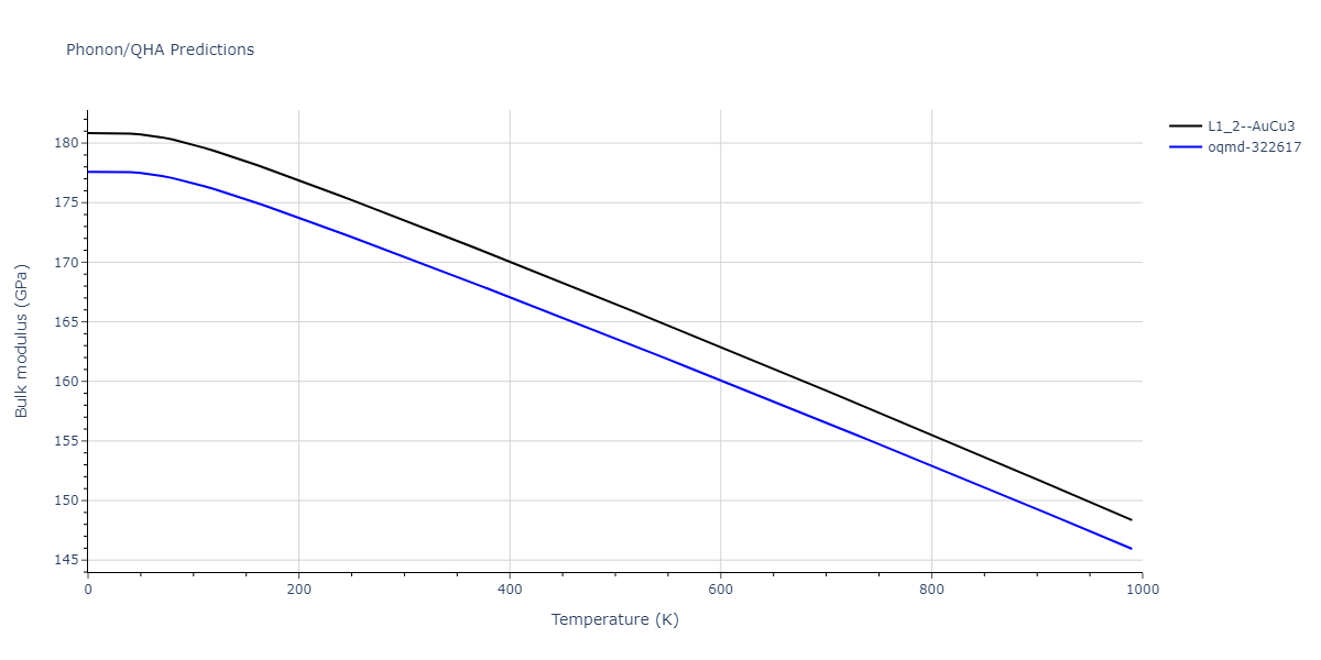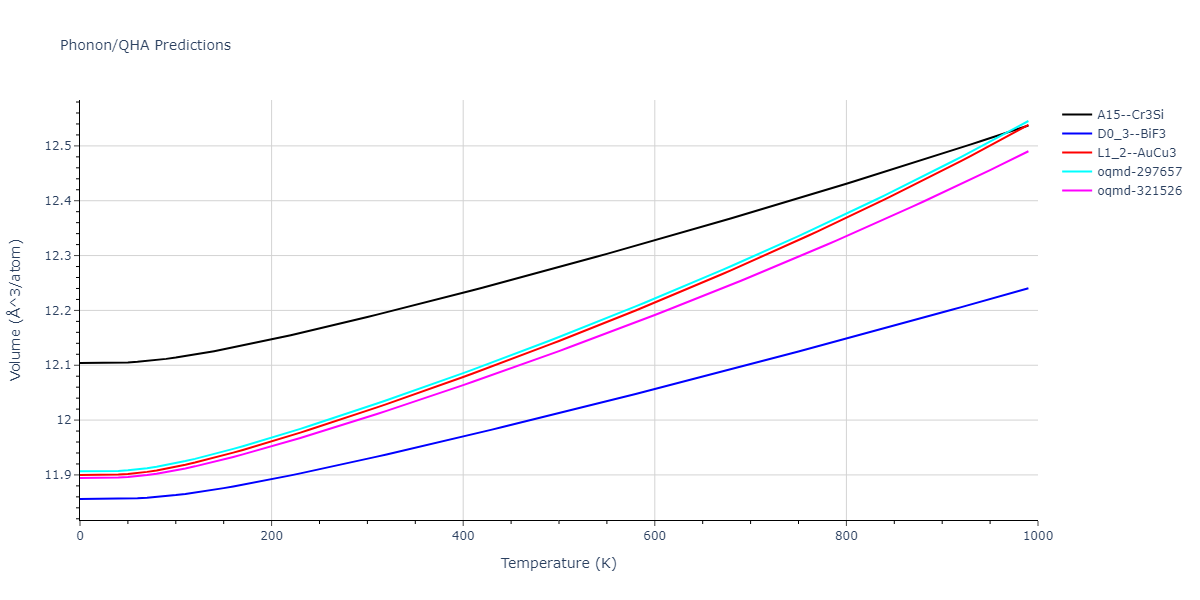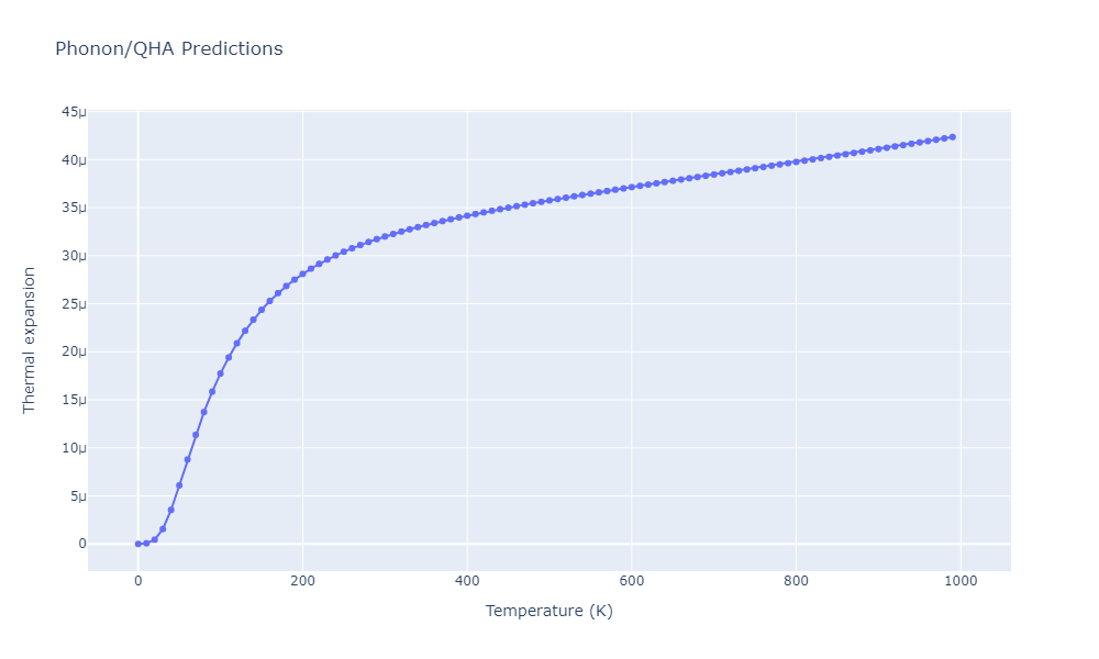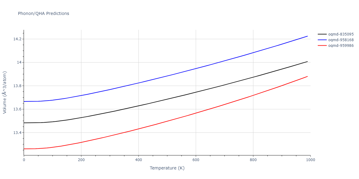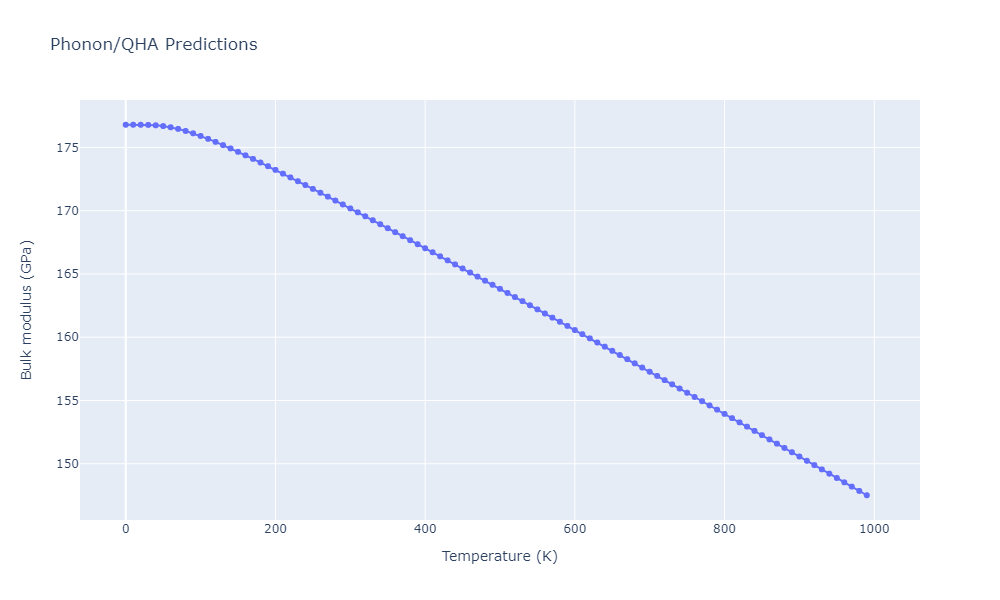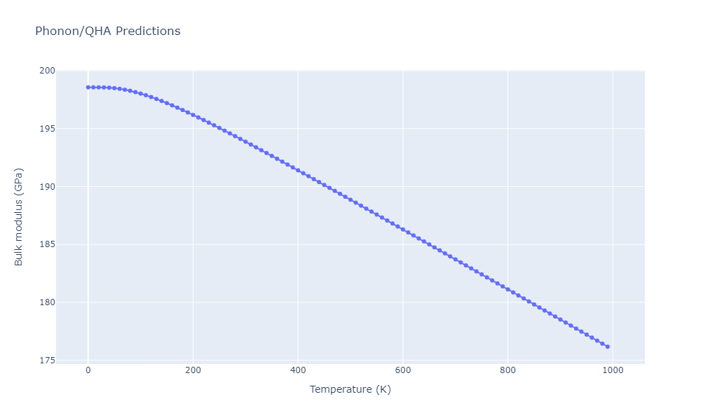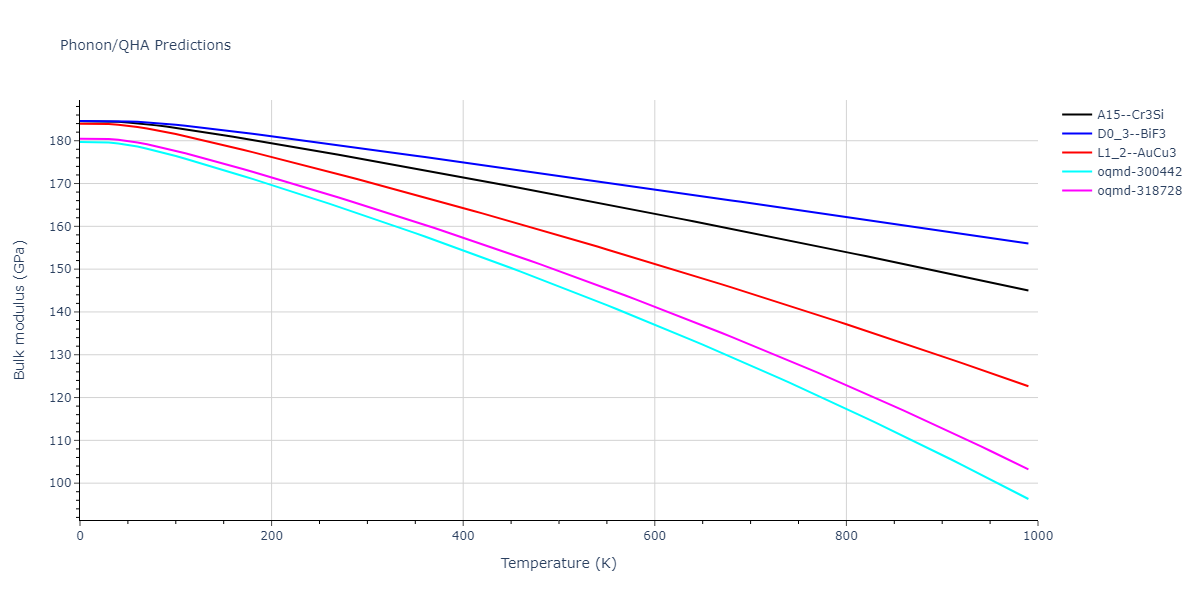 Plots of lattice and elastic constants are shown as a function of temperature. The 0K points were taken from the Crystal Structure Predictions and the Elastic Constants Predictions sections above for the unique crystal structures relaxed with the "dynamic" method. Starting from the 0 K relaxed crystal unit cells, supercell systems are created by replicating all three dimensions by the same multiplier to achieve at least 4000 atoms. The systems are then relaxed at 50 K and zero pressure using 1 million NPT steps. Lattice constants are estimated by averaging the measured box dimensions. Temperatures are iteratively increased by 50 K, with each subsequent relaxation calculation starting from the final atomic configuration at the previous temperature and relaxing for another 1 million steps.