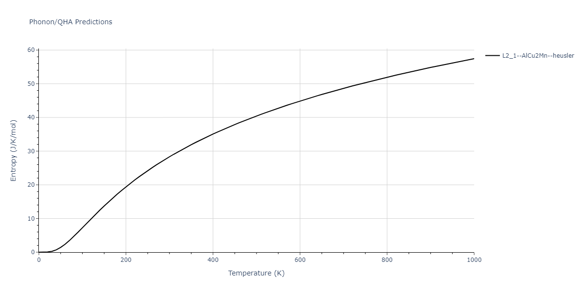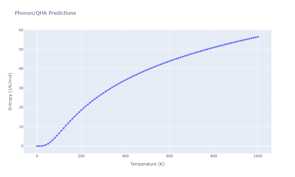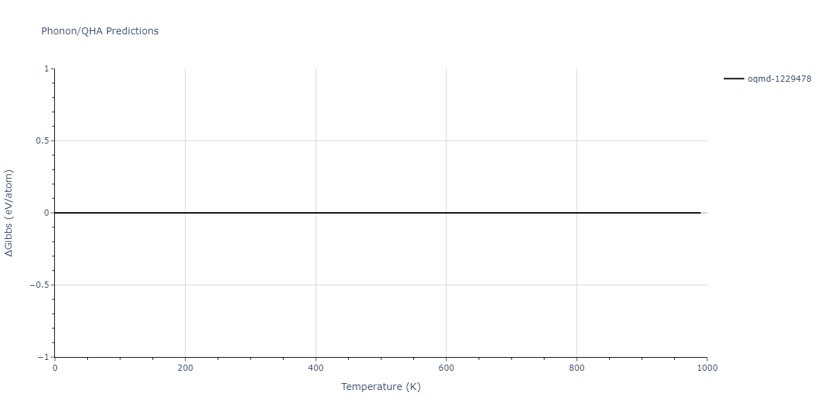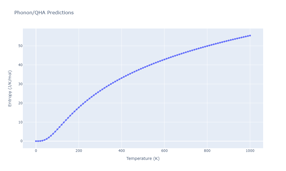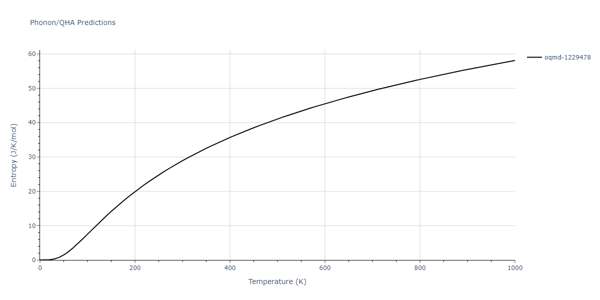 The Gibbs energies of the phases are estimated using thermodynamic integration between the interatomic potential in question and a simpler model with known Gibbs free energy values. For solids, the reference model is an Einstein solid, while for liquids it is the Uhlenbeck-Ford potential. Besides a short run at the start of the solid calculations to estimate Einstein model spring constants, the two calculations proceed similarly. Starting with the final relaxation configurations, the systems are stabilized for 25,000 steps. Then, over the next 50,000 steps the potential is swapped out for the reference potential. The system is then stabilized for another 25,000 steps with the reference model before a reverse swap of 50,000 steps is performed. The simulation ends with one final 25,000 step stabilization period. From the simulation, the irreversible work of transformation is estimated and used to compute the absolute Gibbs free energy of the target phase and potential relative to the reference potential. Entropy is estimated as the difference in enthalpy and Gibbs free energy and divided by temperature.