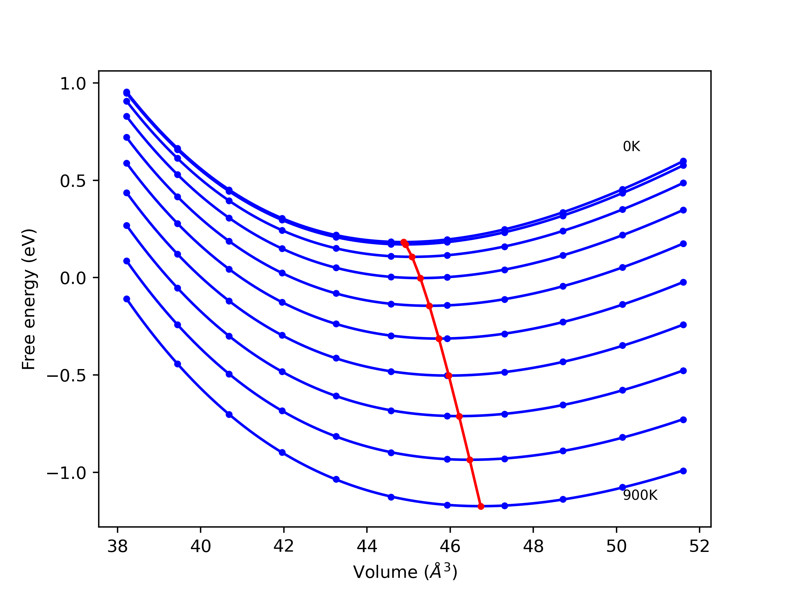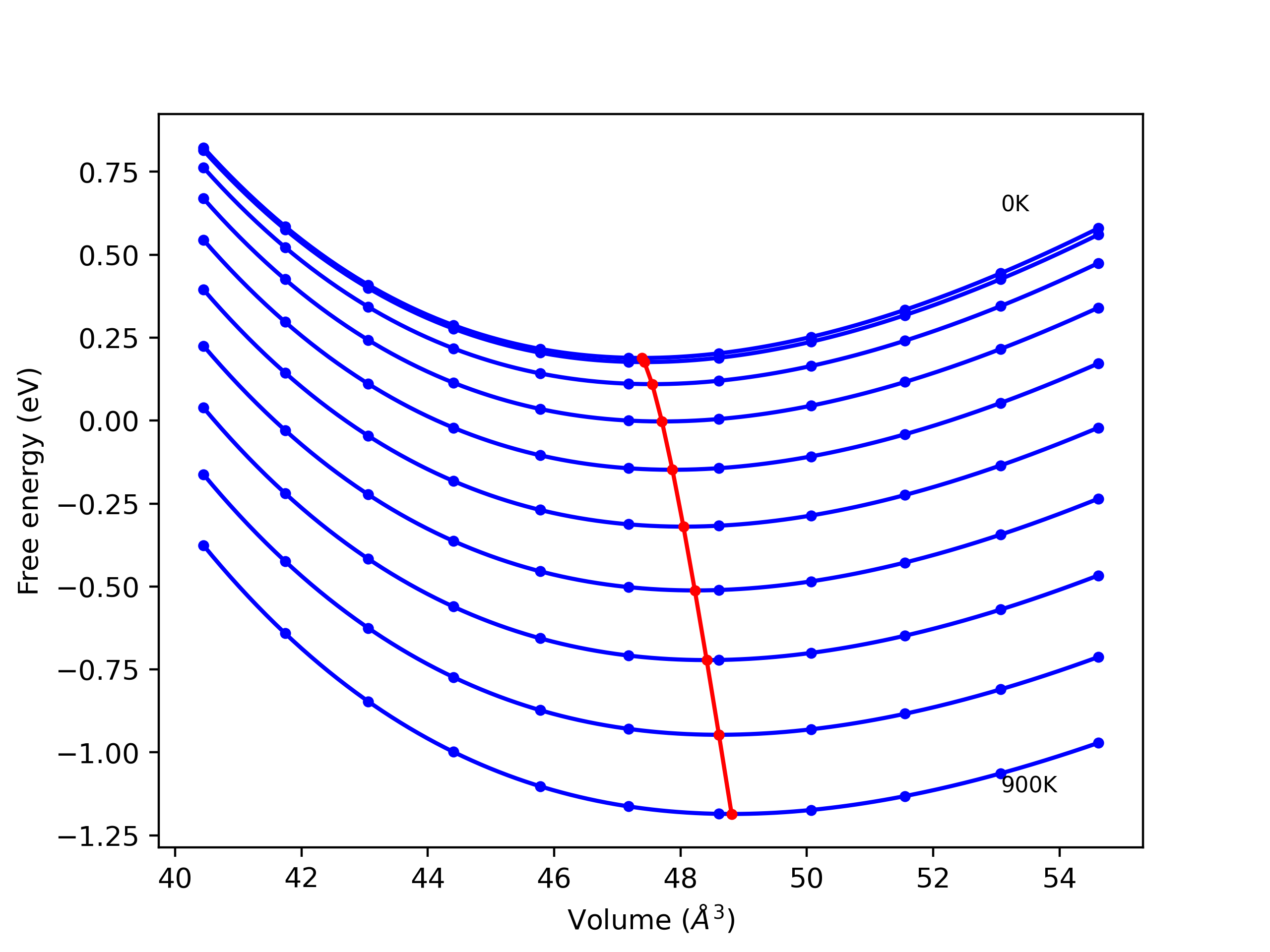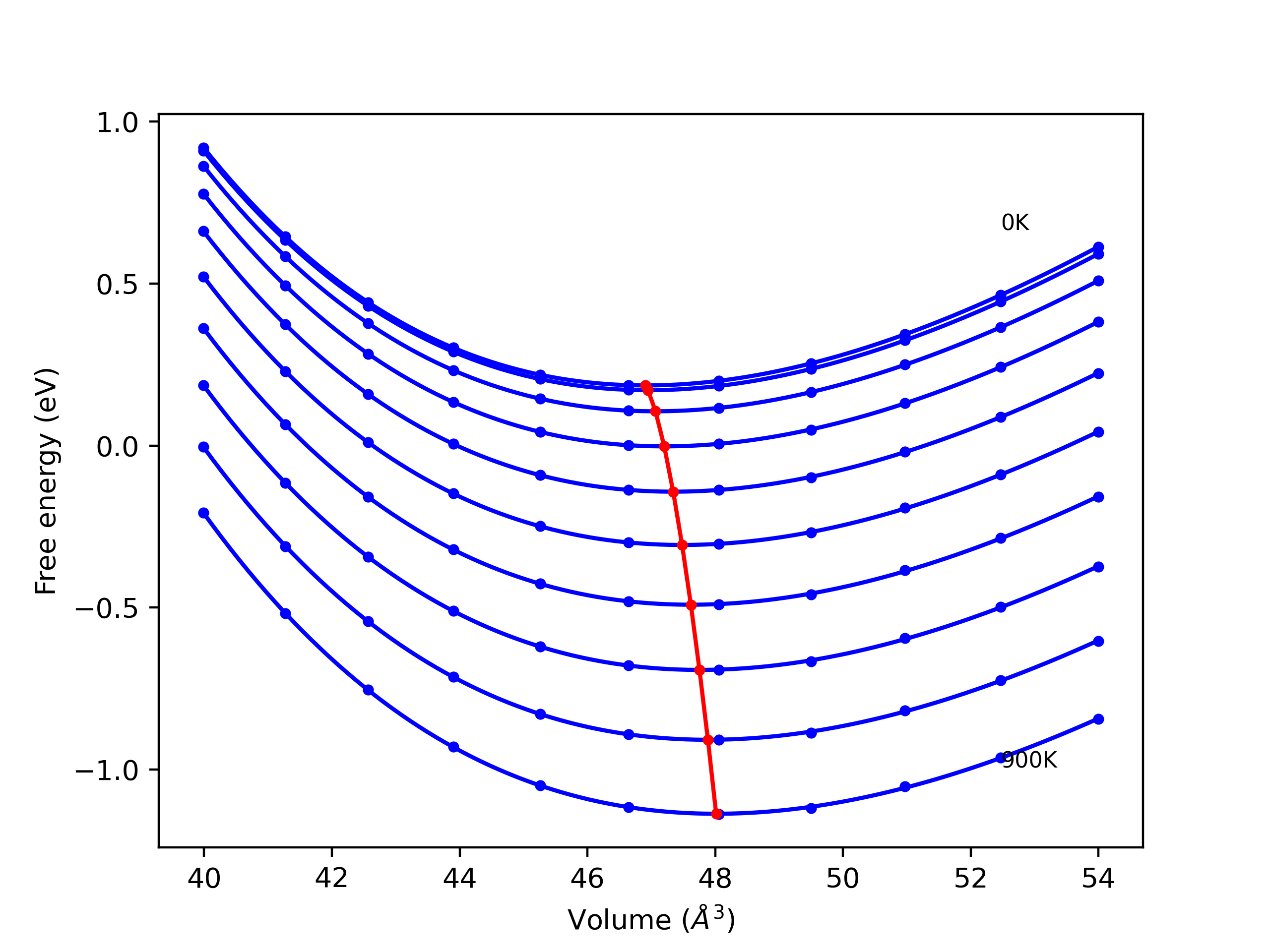 The Gibbs energies of the phases are estimated using thermodynamic integration between the interatomic potential in question and a simpler model with known Gibbs free energy values. For solids, the reference model is an Einstein solid, while for liquids it is the Uhlenbeck-Ford potential. Besides a short run at the start of the solid calculations to estimate Einstein model spring constants, the two calculations proceed similarly. Starting with the final relaxation configurations, the systems are stabilized for 25,000 steps. Then, over the next 50,000 steps the potential is swapped out for the reference potential. The system is then stabilized for another 25,000 steps with the reference model before a reverse swap of 50,000 steps is performed. The simulation ends with one final 25,000 step stabilization period. From the simulation, the irreversible work of transformation is estimated and used to compute the absolute Gibbs free energy of the target phase and potential relative to the reference potential. Entropy is estimated as the difference in enthalpy and Gibbs free energy and divided by temperature.