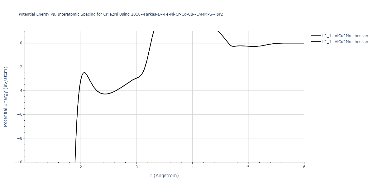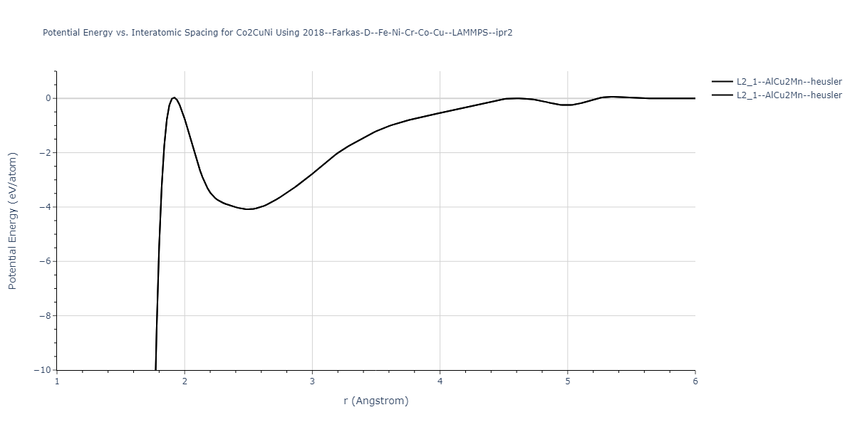 Plots of the potential energy vs interatomic spacing, r, are shown below for all diatom sets associated with the interatomic potential. This calculation provides insights into the functional form of the potential's two-body interactions. A system consisting of only two atoms is created, and the potential energy is evaluated for the atoms separated by 0.02 Å <= r <= 6.0> Å in intervals of 0.02 Å. Two plots are shown: one for the "standard" interaction distance range, and one for small values of r. The small r plot is useful for determining whether the potential is suitable for radiation studies.