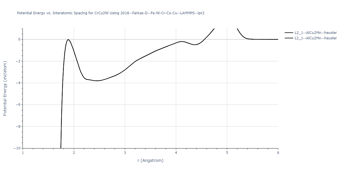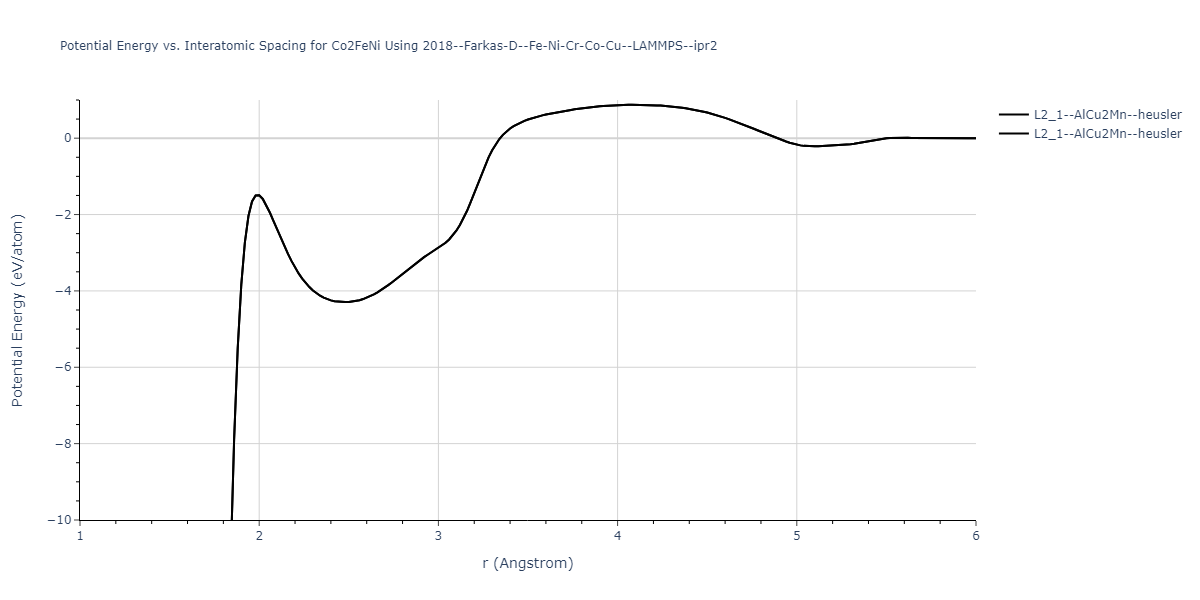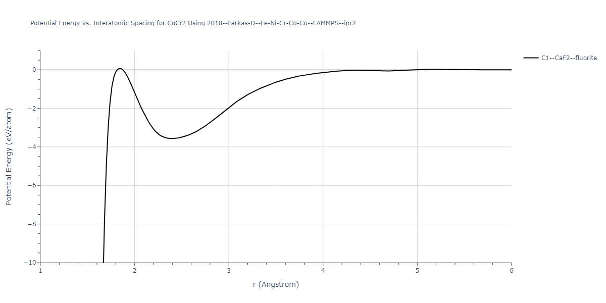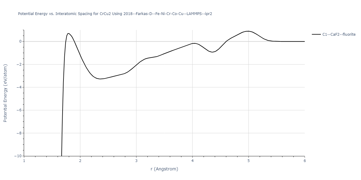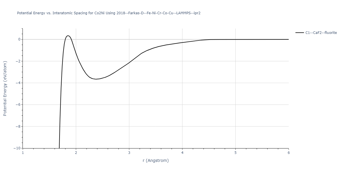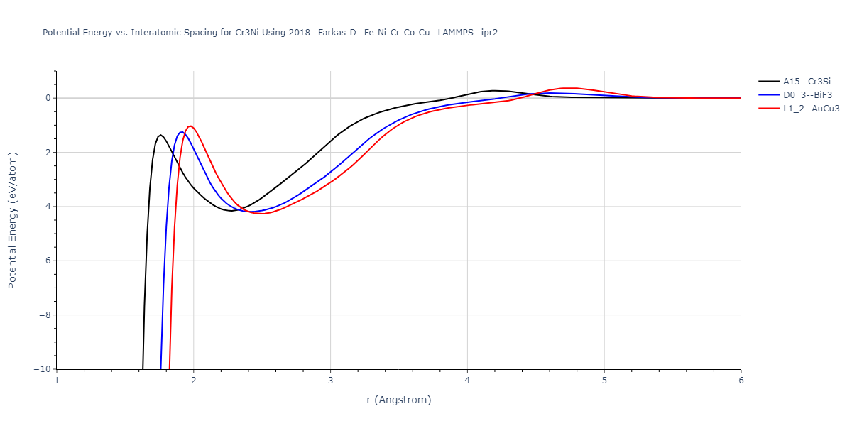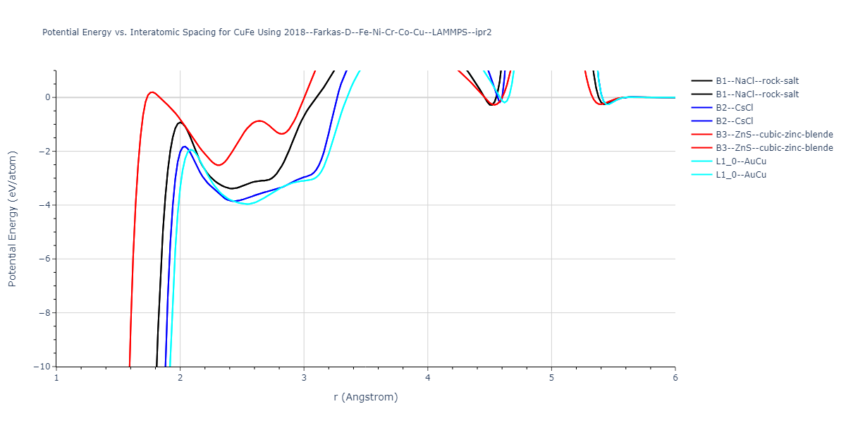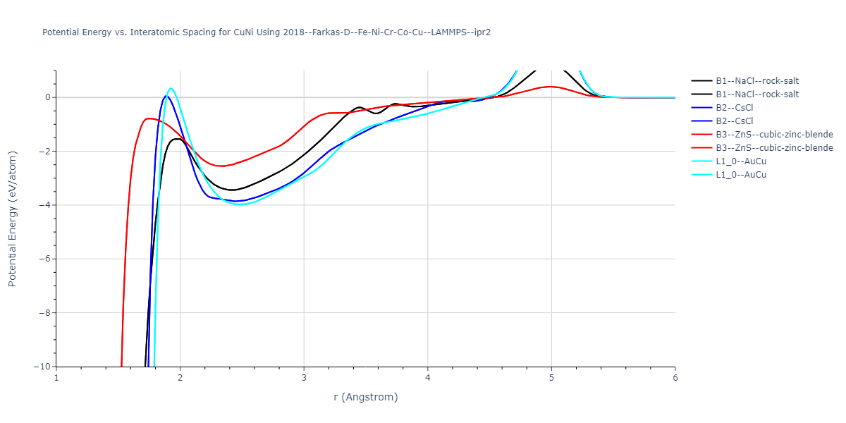 Plots of potential energy vs interatomic spacing, r, are shown below for a number of crystal structures. The structures are generated based on the ideal atomic positions and b/a and c/a lattice parameter ratios for a given crystal prototype. The size of the system is then uniformly scaled, and the energy calculated without relaxing the system. To obtain these plots, values of r are evaluated every 0.02 Å up to 6 Å.