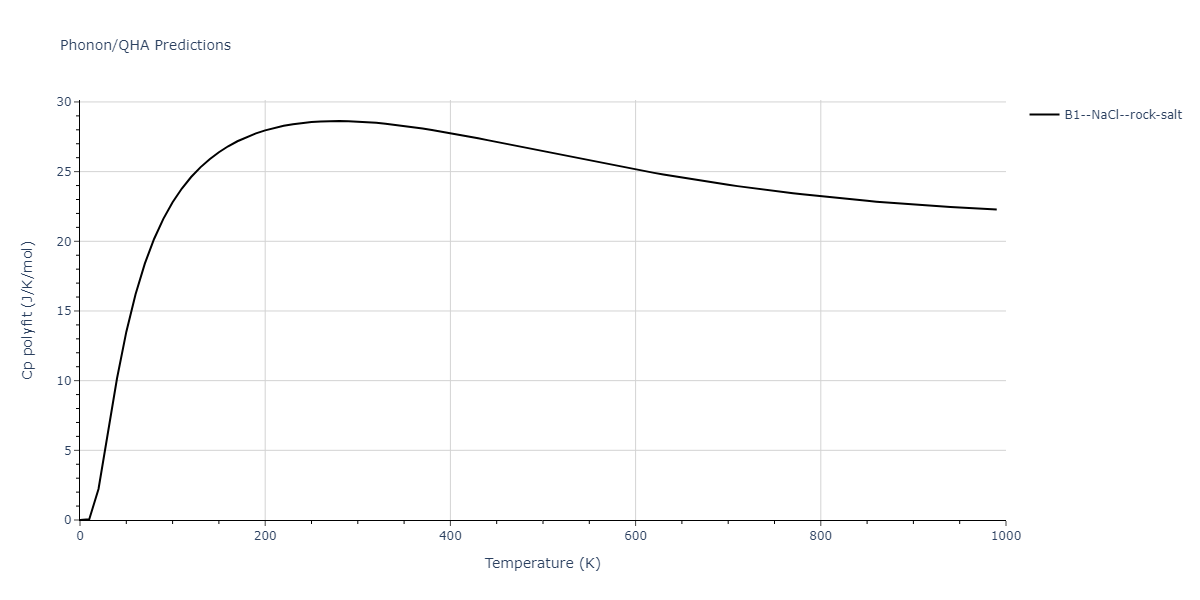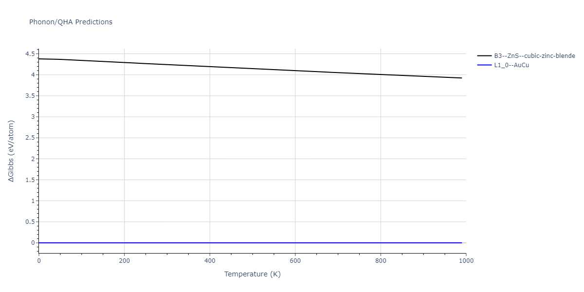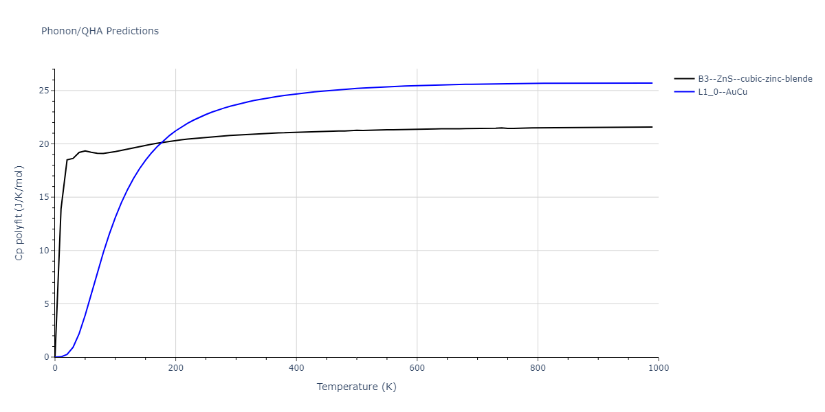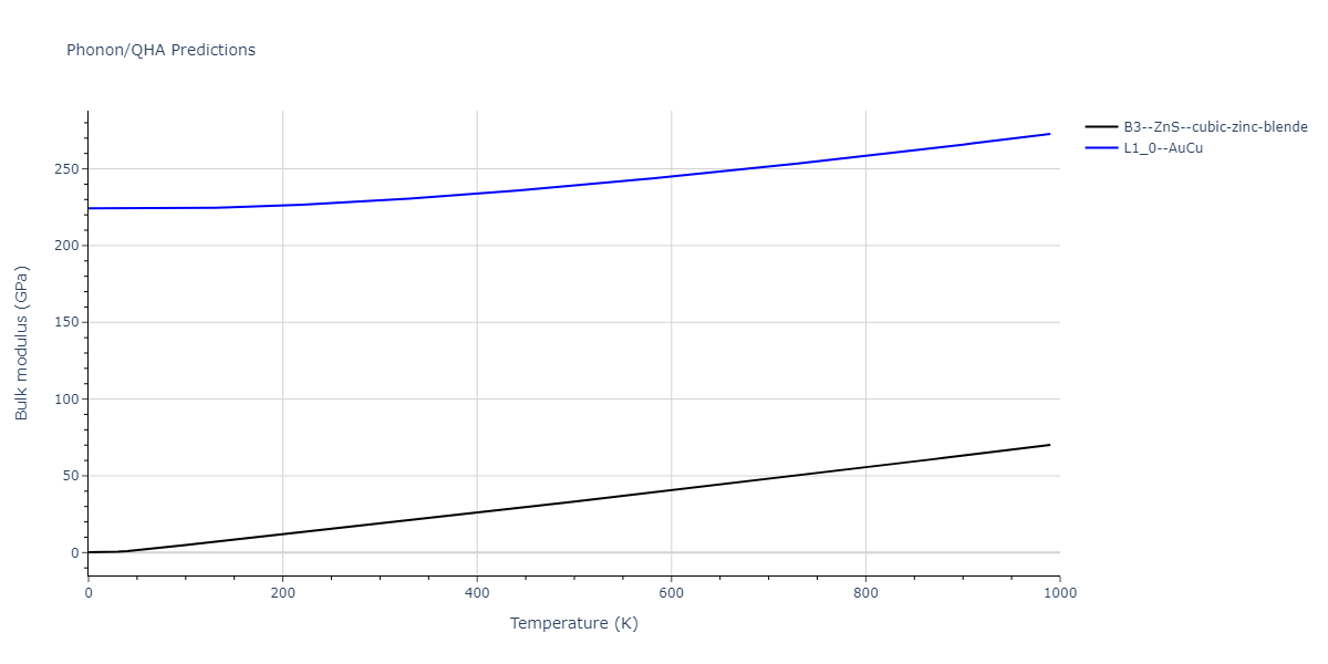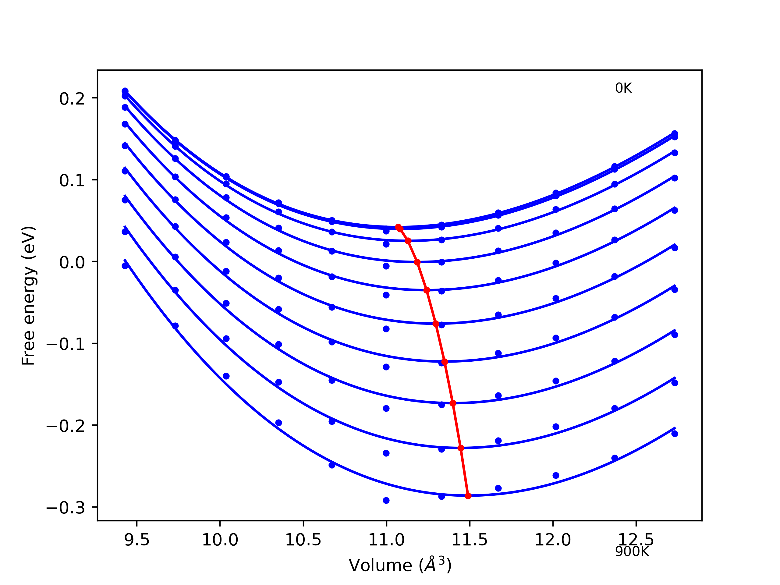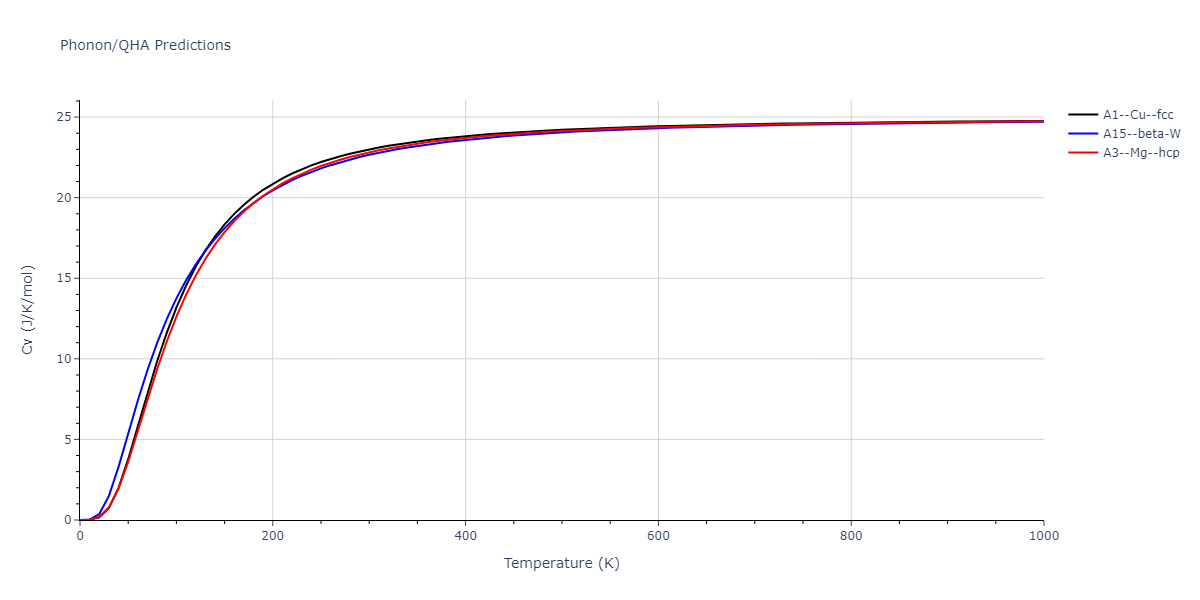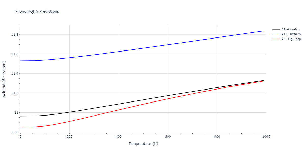 Phonon band structures and crystal properties estimated from quasi-harmonic approximation (QHA) calculations are displayed for select crystals. The calculations were performed using phonopy and LAMMPS. For the phonon calculations, 3x3 supercells of the potential-specific relaxed crystals were used. The QHA calculations were based on 11 strain states ranging from -0.05 to 0.05.