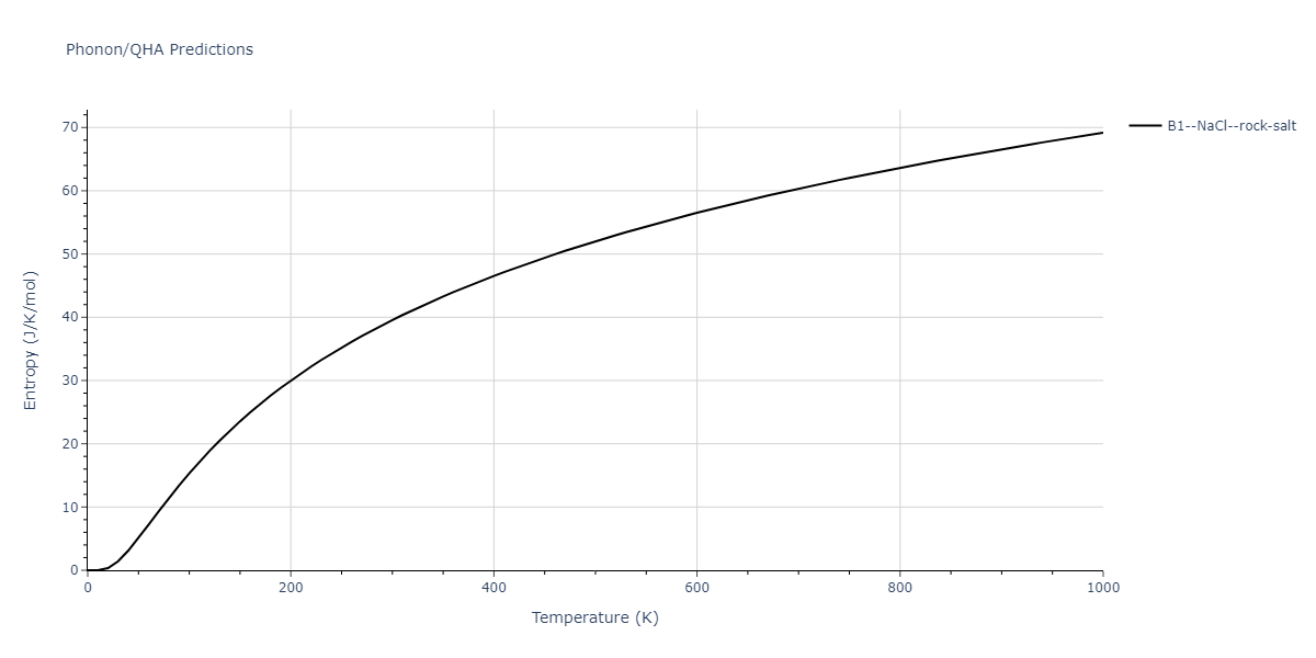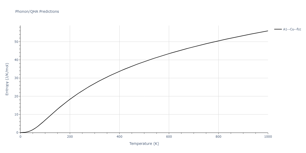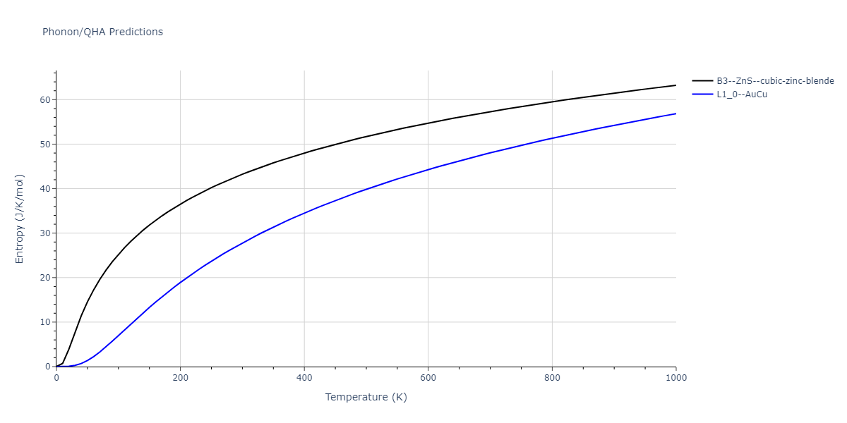 The Gibbs energies of the phases are estimated using thermodynamic integration between the interatomic potential in question and a simpler model with known Gibbs free energy values. For solids, the reference model is an Einstein solid, while for liquids it is the Uhlenbeck-Ford potential. Besides a short run at the start of the solid calculations to estimate Einstein model spring constants, the two calculations proceed similarly. Starting with the final relaxation configurations, the systems are stabilized for 25,000 steps. Then, over the next 50,000 steps the potential is swapped out for the reference potential. The system is then stabilized for another 25,000 steps with the reference model before a reverse swap of 50,000 steps is performed. The simulation ends with one final 25,000 step stabilization period. From the simulation, the irreversible work of transformation is estimated and used to compute the absolute Gibbs free energy of the target phase and potential relative to the reference potential. Entropy is estimated as the difference in enthalpy and Gibbs free energy and divided by temperature.