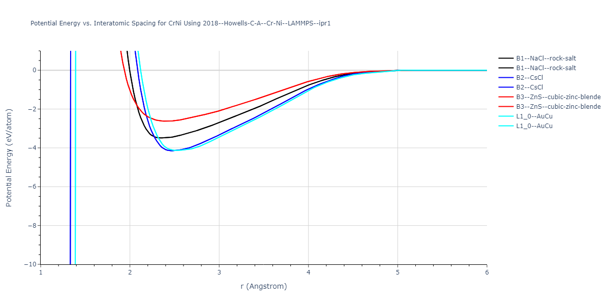 Plots of potential energy vs interatomic spacing, r, are shown below for a number of crystal structures. The structures are generated based on the ideal atomic positions and b/a and c/a lattice parameter ratios for a given crystal prototype. The size of the system is then uniformly scaled, and the energy calculated without relaxing the system. To obtain these plots, values of r are evaluated every 0.02 Å up to 6 Å.