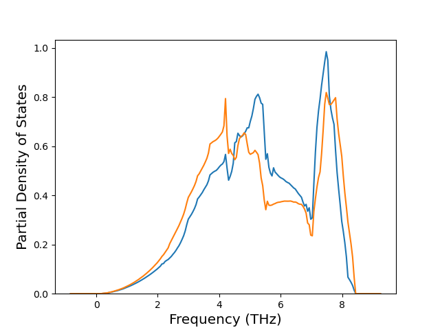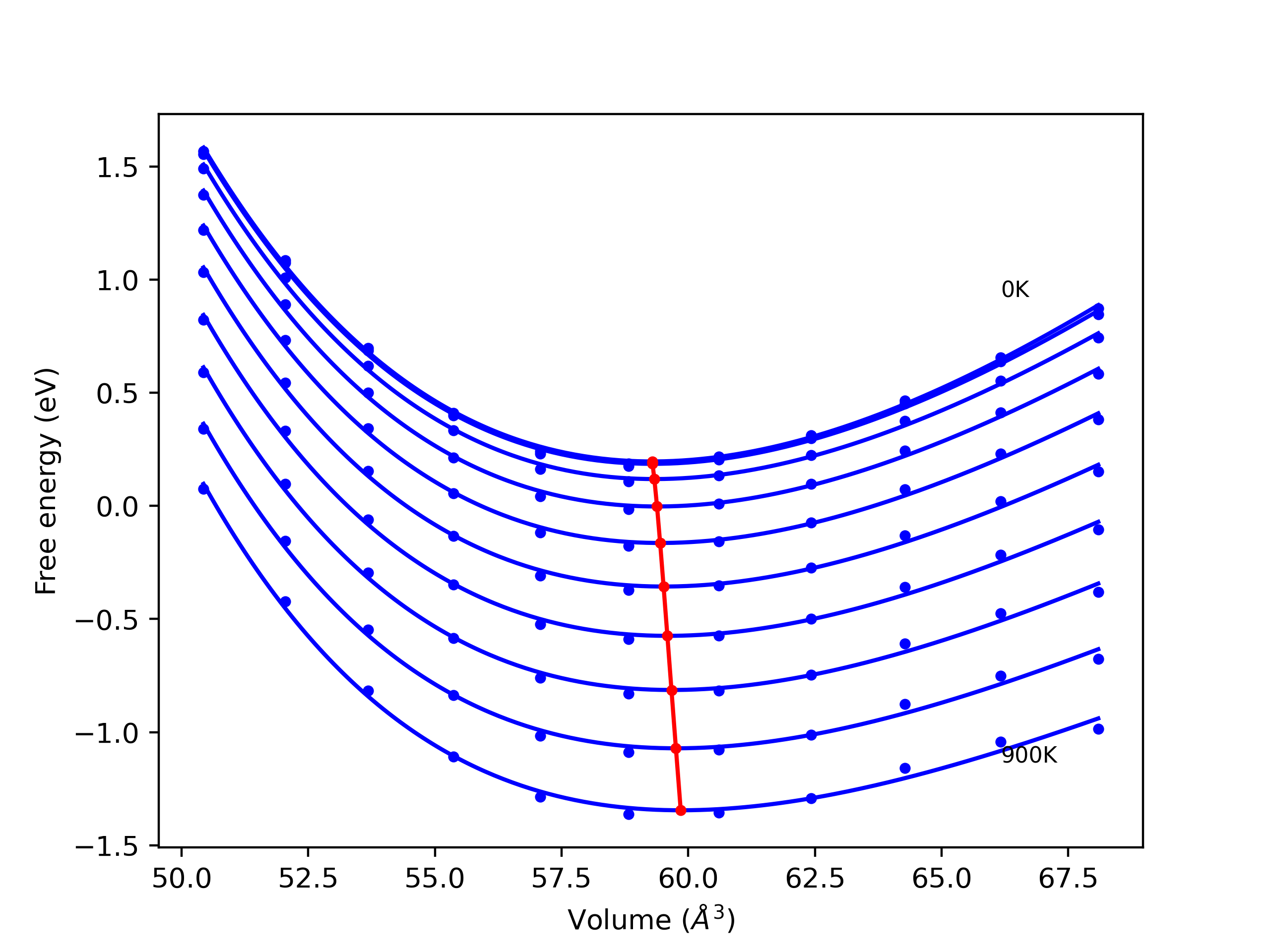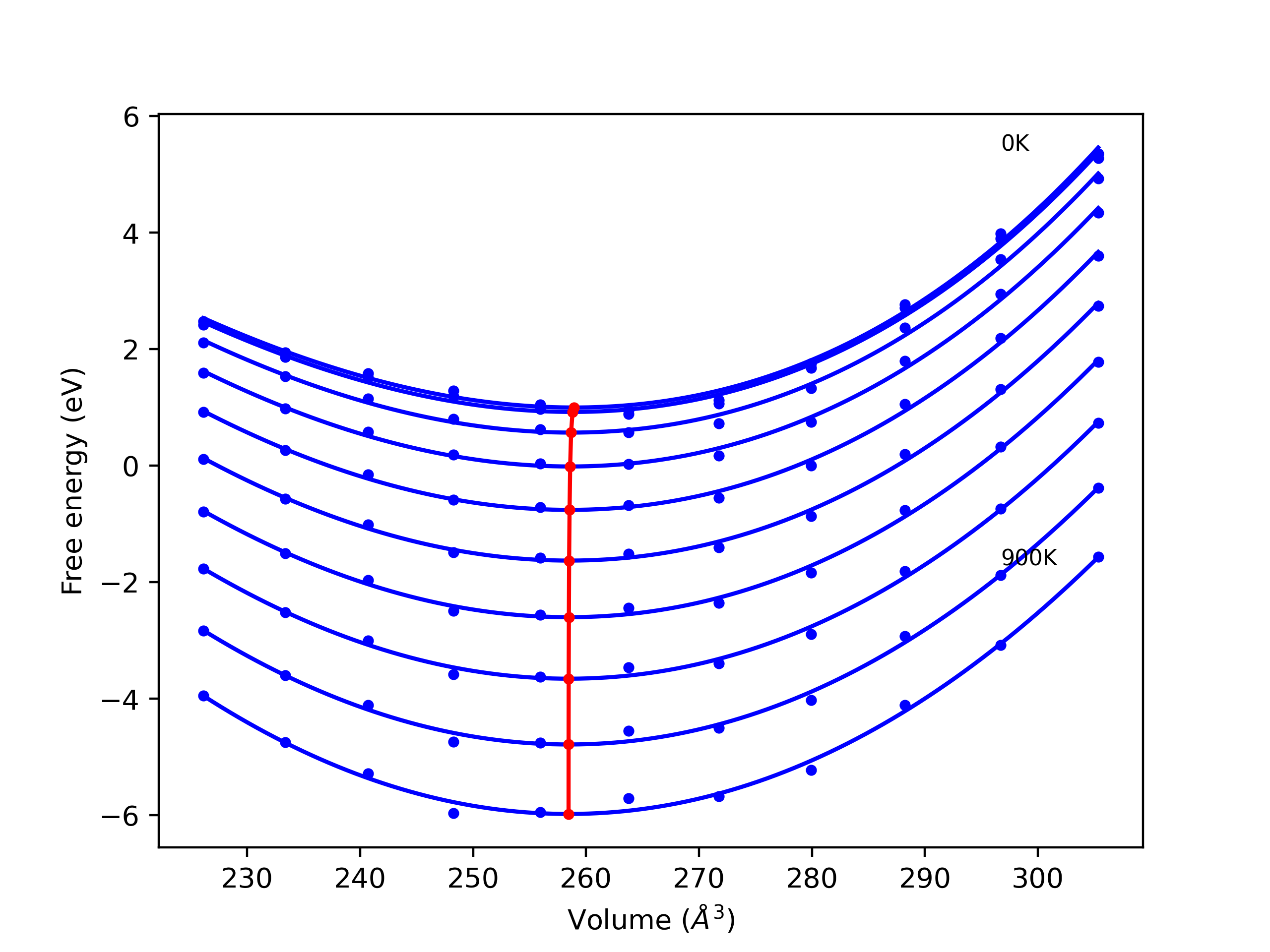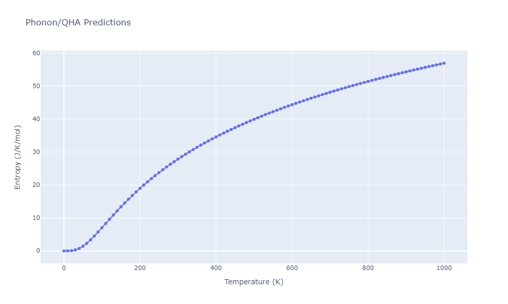 The Gibbs energies of the phases are estimated using thermodynamic integration between the interatomic potential in question and a simpler model with known Gibbs free energy values. For solids, the reference model is an Einstein solid, while for liquids it is the Uhlenbeck-Ford potential. Besides a short run at the start of the solid calculations to estimate Einstein model spring constants, the two calculations proceed similarly. Starting with the final relaxation configurations, the systems are stabilized for 25,000 steps. Then, over the next 50,000 steps the potential is swapped out for the reference potential. The system is then stabilized for another 25,000 steps with the reference model before a reverse swap of 50,000 steps is performed. The simulation ends with one final 25,000 step stabilization period. From the simulation, the irreversible work of transformation is estimated and used to compute the absolute Gibbs free energy of the target phase and potential relative to the reference potential. Entropy is estimated as the difference in enthalpy and Gibbs free energy and divided by temperature.