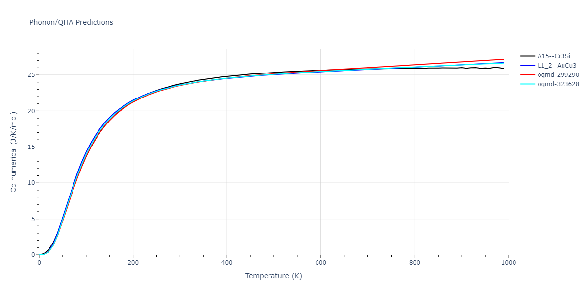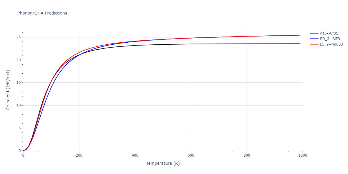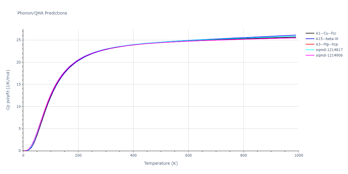 Plots of internal energy, Gibbs free energy, entropy, heat capacity and volume are shown here as a function of temperature for various crystal structures and liquid phases. The included crystal structures correspond to those in the Solid Structures vs. Temperature section, and the liquid phases to those in the Liquid Properties section. Internal energy and volume are taken from the associated structure relaxations mentioned in those previous sections. Constant pressure heat capacity is estimated using 3-point numerical derivatives of enthalpy versus temperature. Note that since all simulations done here are at 0 pressure, internal energy and enthalpy are equivalent.