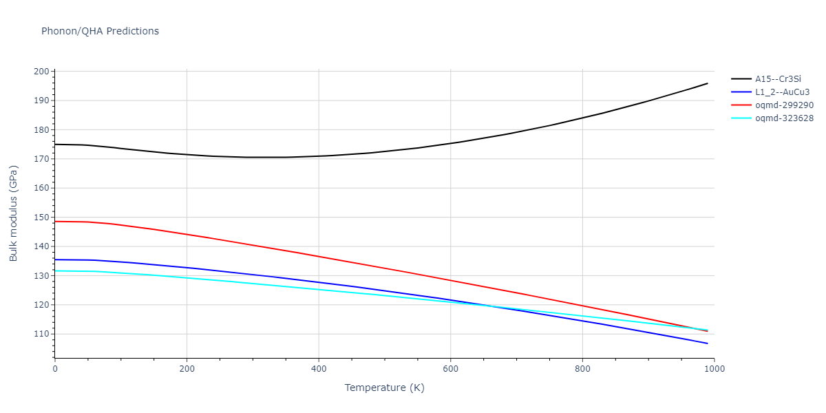 Plots of lattice and elastic constants are shown as a function of temperature. The 0K points were taken from the Crystal Structure Predictions and the Elastic Constants Predictions sections above for the unique crystal structures relaxed with the "dynamic" method. Starting from the 0 K relaxed crystal unit cells, supercell systems are created by replicating all three dimensions by the same multiplier to achieve at least 4000 atoms. The systems are then relaxed at 50 K and zero pressure using 1 million NPT steps. Lattice constants are estimated by averaging the measured box dimensions. Temperatures are iteratively increased by 50 K, with each subsequent relaxation calculation starting from the final atomic configuration at the previous temperature and relaxing for another 1 million steps.