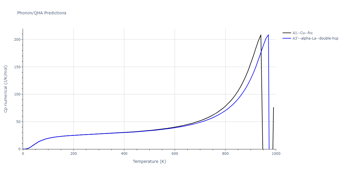Plots of internal energy, Gibbs free energy, entropy, heat capacity and volume are shown here as a function of temperature for various crystal structures and liquid phases. The included crystal structures correspond to those in the Solid Structures vs. Temperature section, and the liquid phases to those in the Liquid Properties section. Internal energy and volume are taken from the associated structure relaxations mentioned in those previous sections. Constant pressure heat capacity is estimated using 3-point numerical derivatives of enthalpy versus temperature. Note that since all simulations done here are at 0 pressure, internal energy and enthalpy are equivalent.